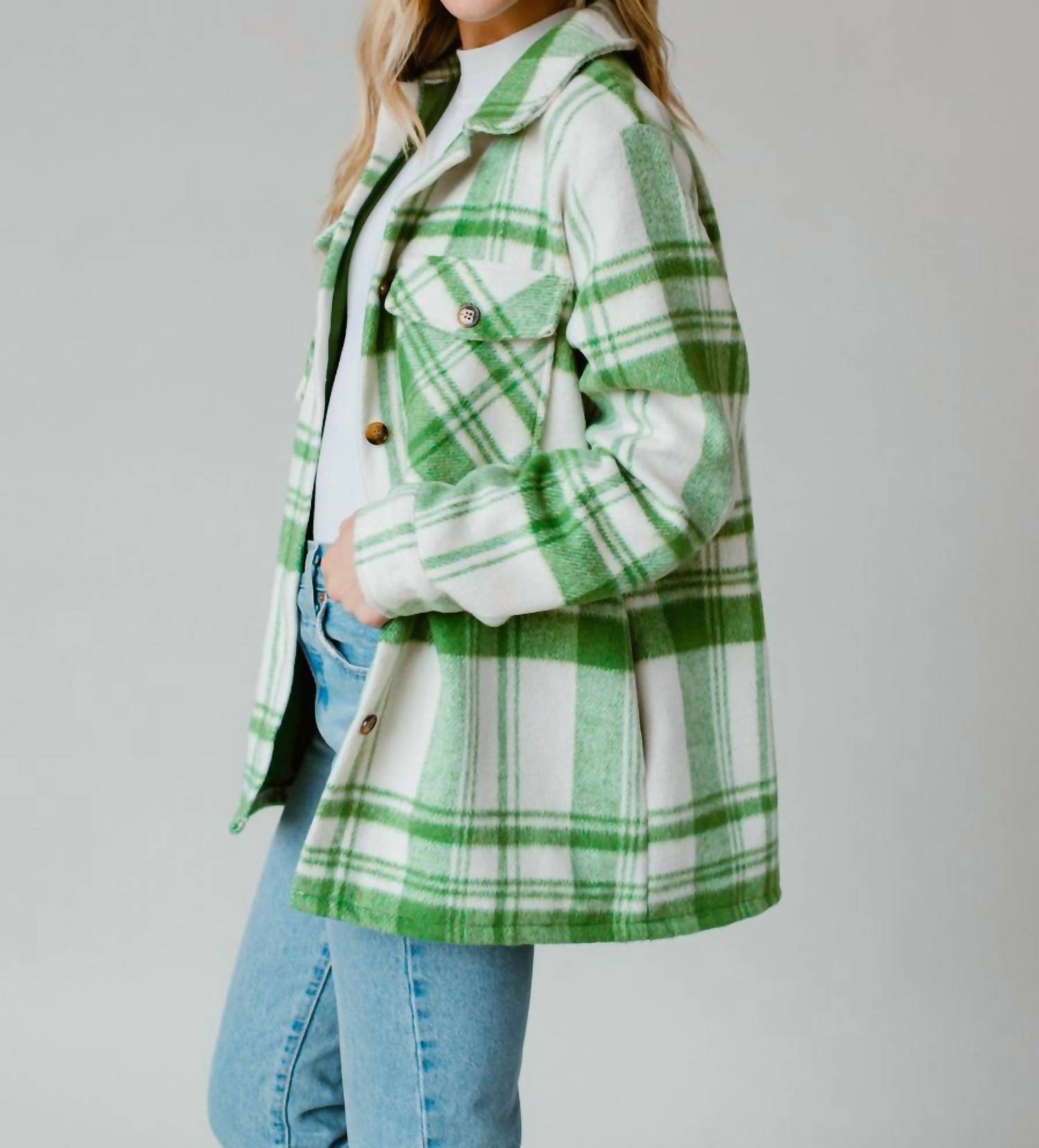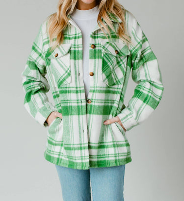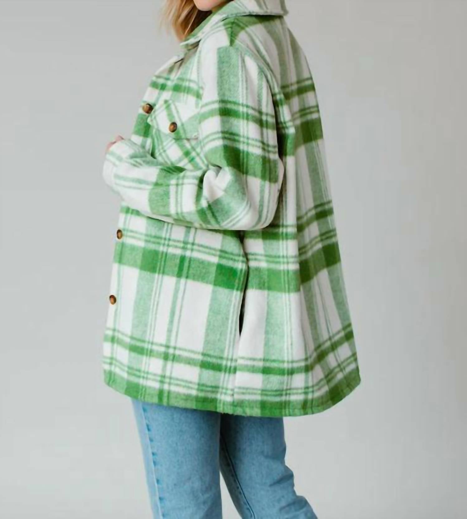 Introducing the Cozy Check Jacket by Panache, a chic plaid jacket in green and cream perfect for any casual occasion. This jacket boasts long sleeves and a classic collar, featuring a button closure for easy wear. Crafted from 100% polyester, it includes two front pockets at the bust and side pockets for added functionality, and comes fully lined for extra comfort. Care instructions recommend machine washing and laying flat to dry for best results. Made from imported materials.
