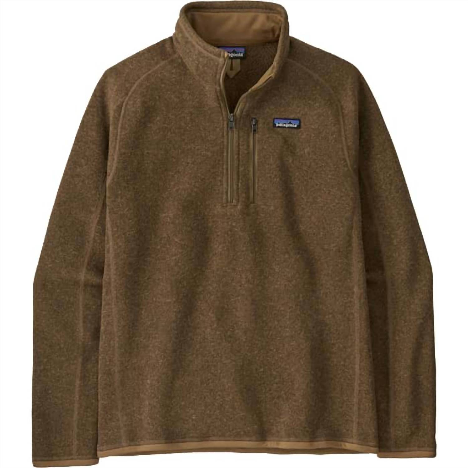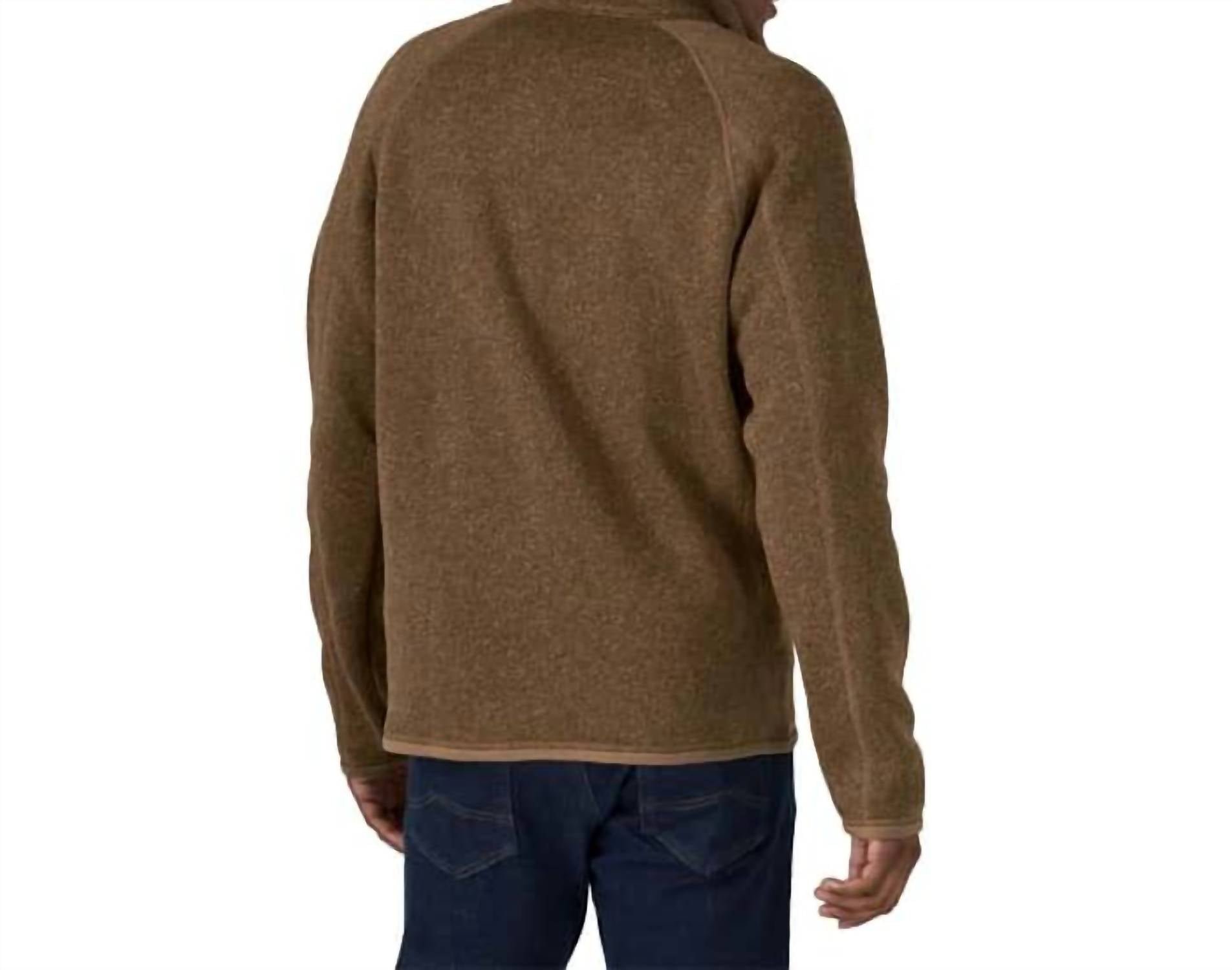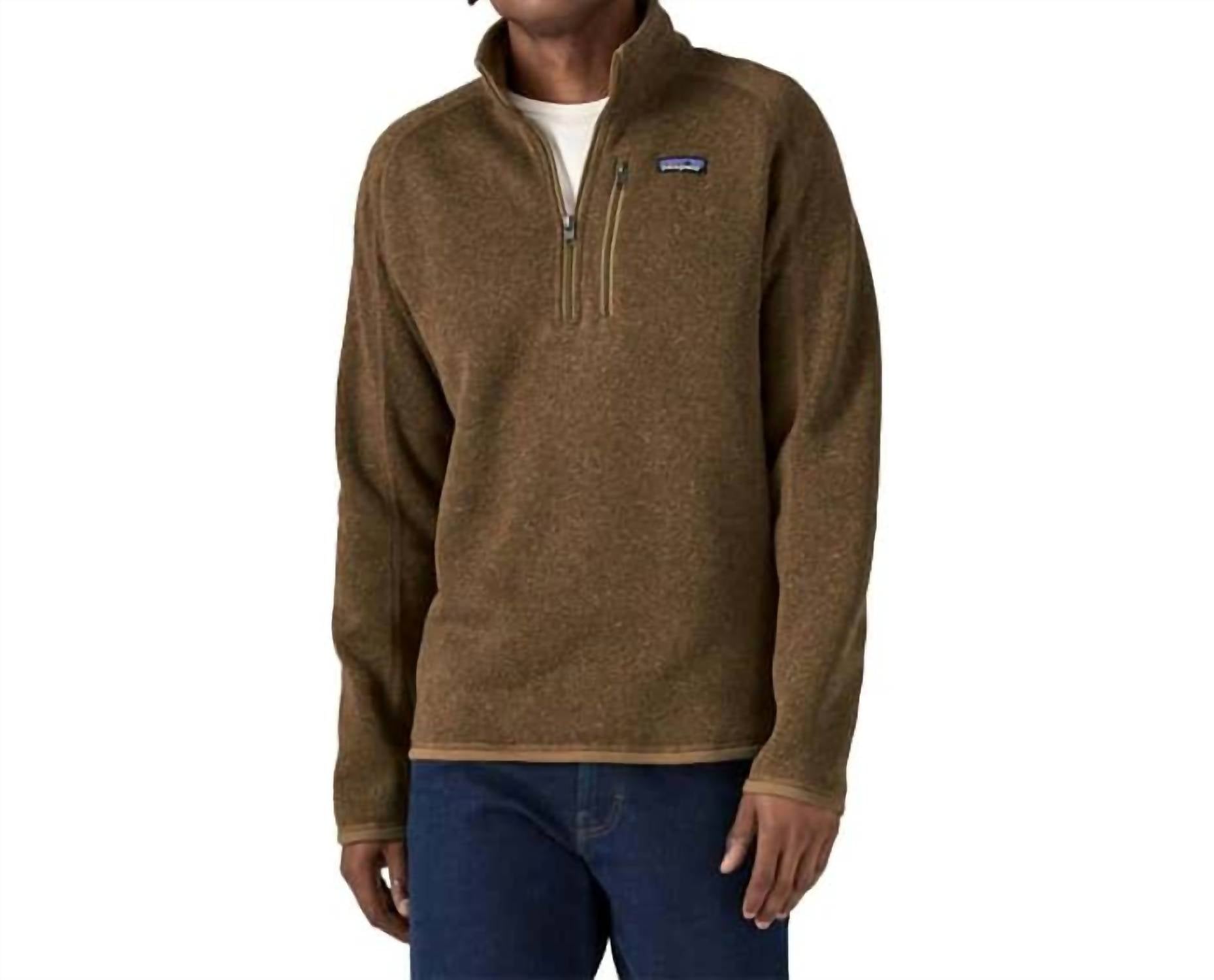Introducing the Men's Better Sweater by Patagonia in Coriander Brown, a perfect blend of style and sustainability. With long raglan sleeves, this mockneck jacket is crafted from 100% recycled polyester, featuring a cozy sweater-knit fleece. Closure: Quarter-zip with a stand-up collar. Care: Machine wash and tumble dry for effortless maintenance. Enjoy the added convenience of a zippered left-chest pocket, completing this solid-colored, streetwear trend essential for fall vacations.