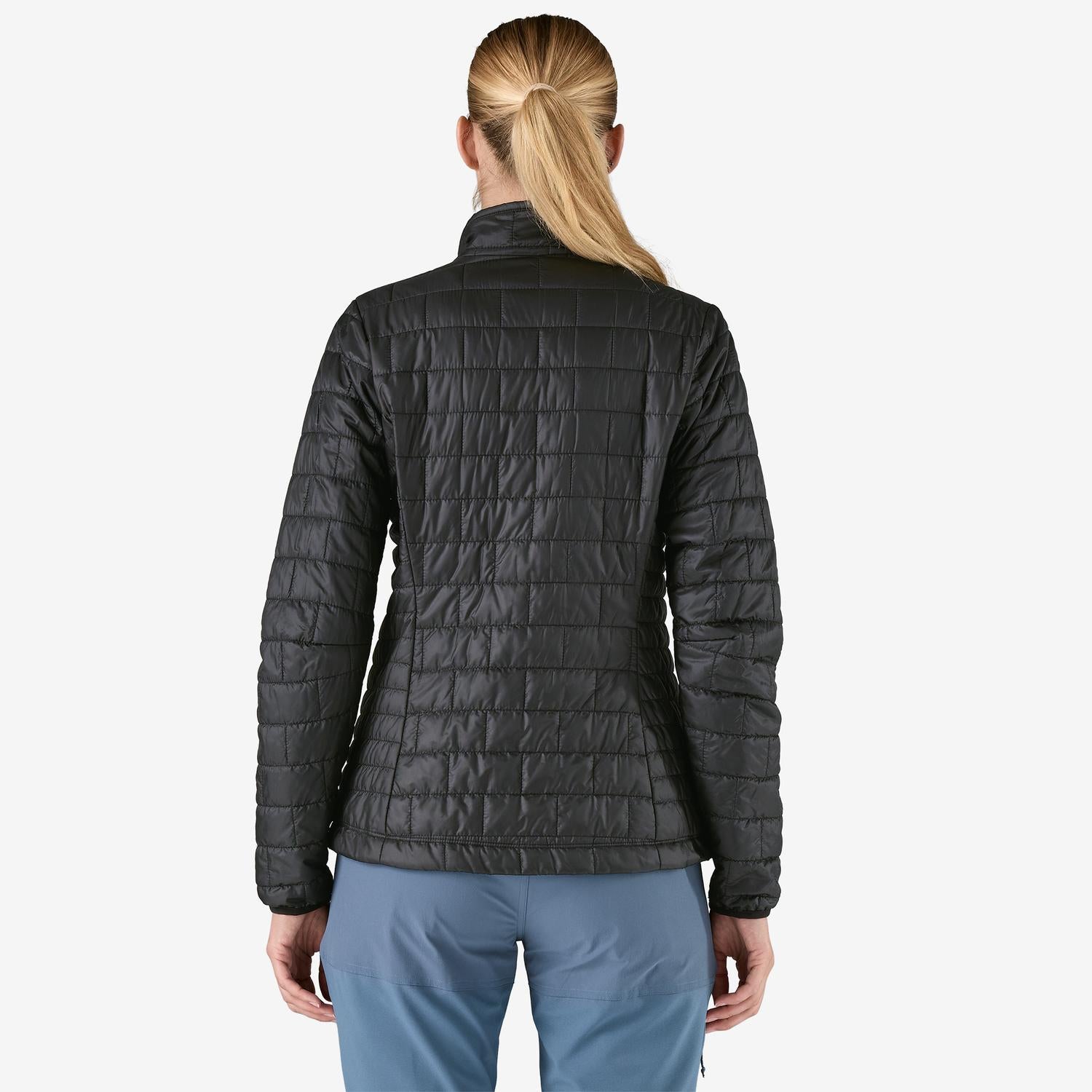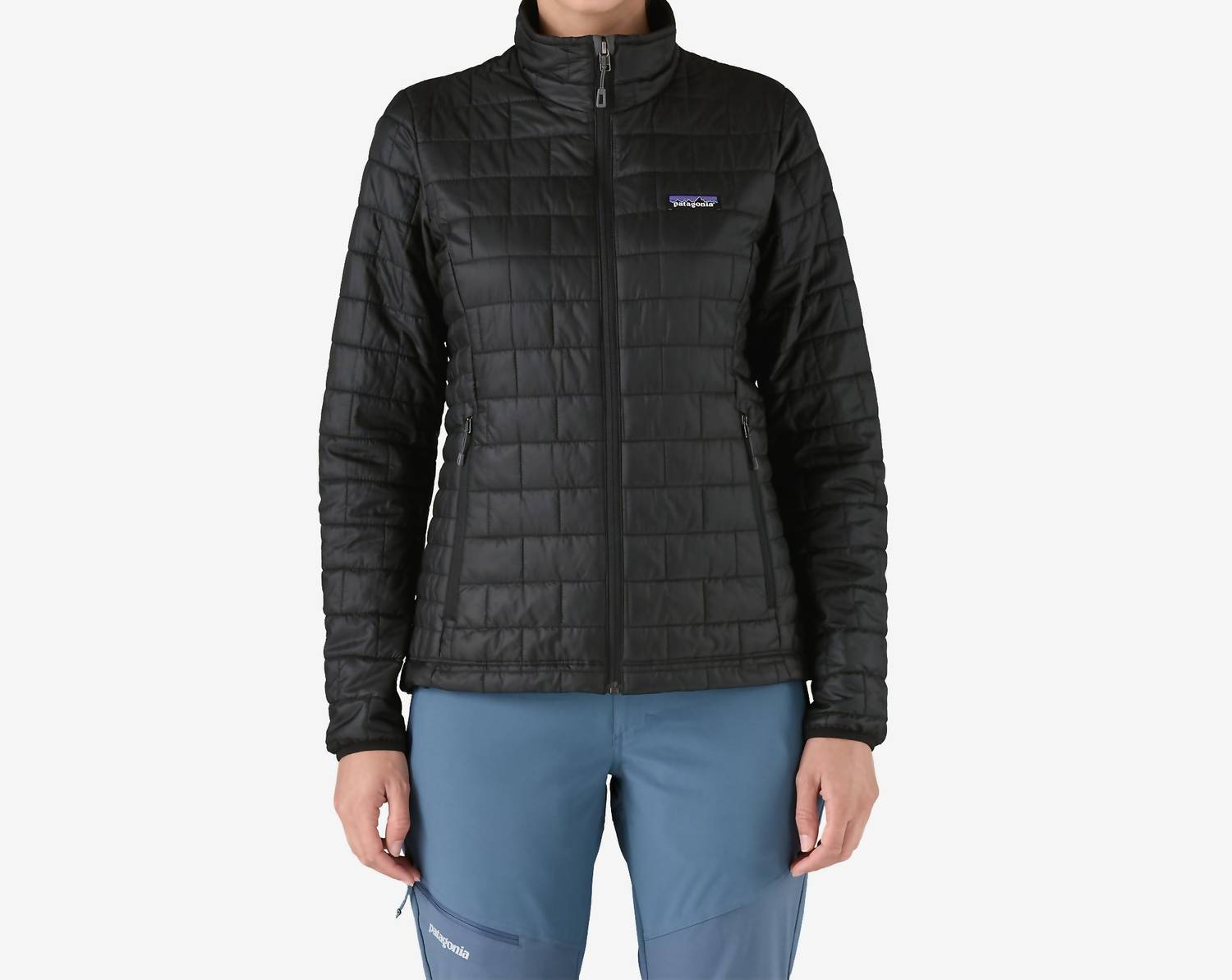 You'll be reaching for this puffer jacket all season long. Introducing the Women's Nano Puff Jacket by Patagonia, a must-have for your travel wardrobe. This solid black puffer features long sleeves, a mockneck, and a zip closure, ensuring both warmth and style. Crafted with 60-g PrimaLoft® Gold Insulation Eco from 100% postconsumer recycled polyester and a 100% recycled polyester shell and lining, it offers windproof and water-resistant protection. Care is a breeze with machine wash instructions and tumble dry compatibility.