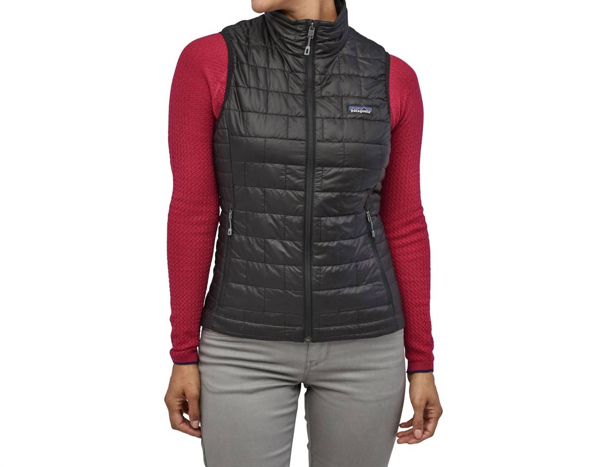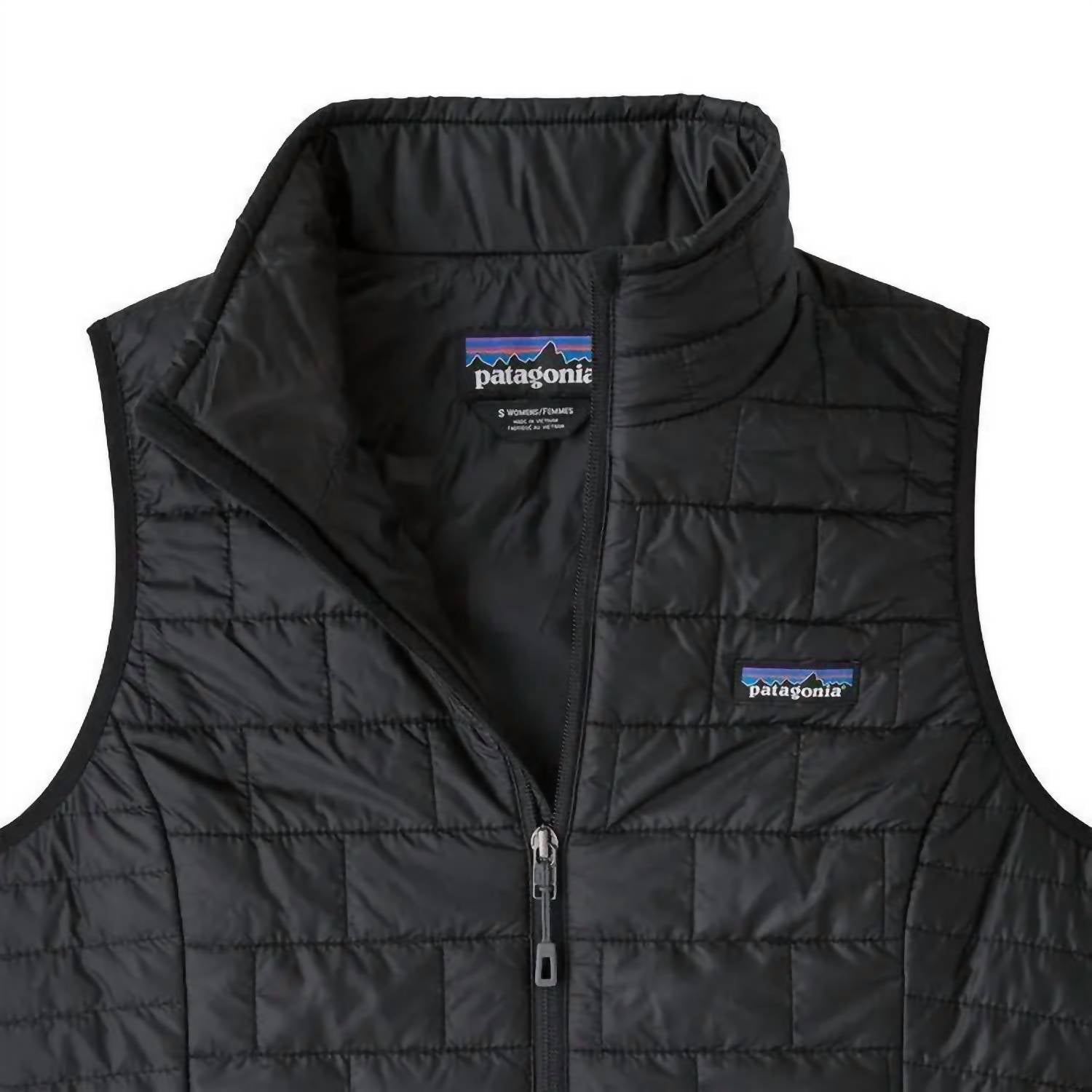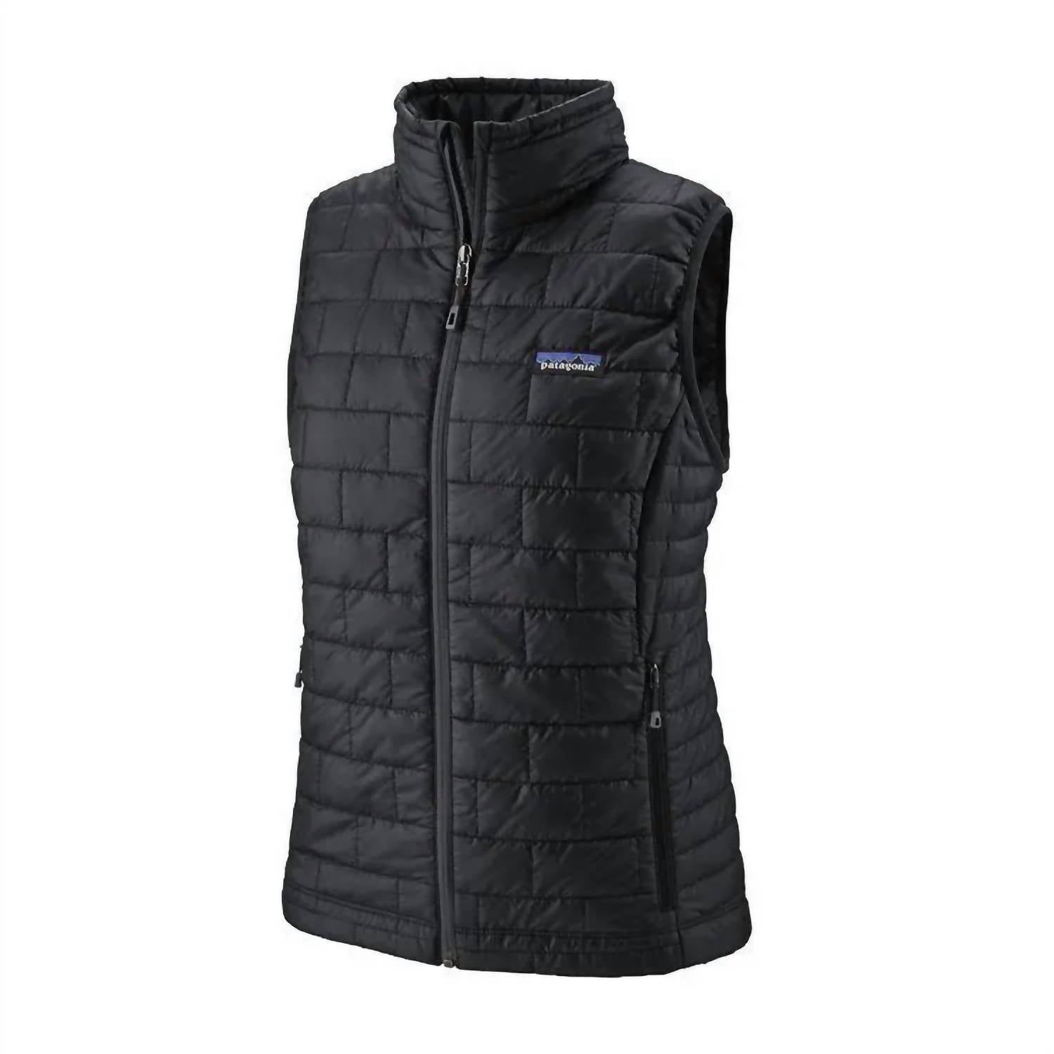 The Patagonia Nano Puff Vest for women, available in classic black, is a warm, windproof, and water-resistant essential for Fall travel. This sleeveless vest is crafted from 100% recycled polyester ripstop with a PFC-free DWR finish and features 60-g PrimaLoft® Gold Insulation Eco for excellent warmth. The vest includes two zippered handwarmer pockets, a center-front zip closure with a wicking interior storm flap, and a mockneck design, complete with a brick quilting pattern for durability. Care instructions recommend hand washing and laying flat to dry.