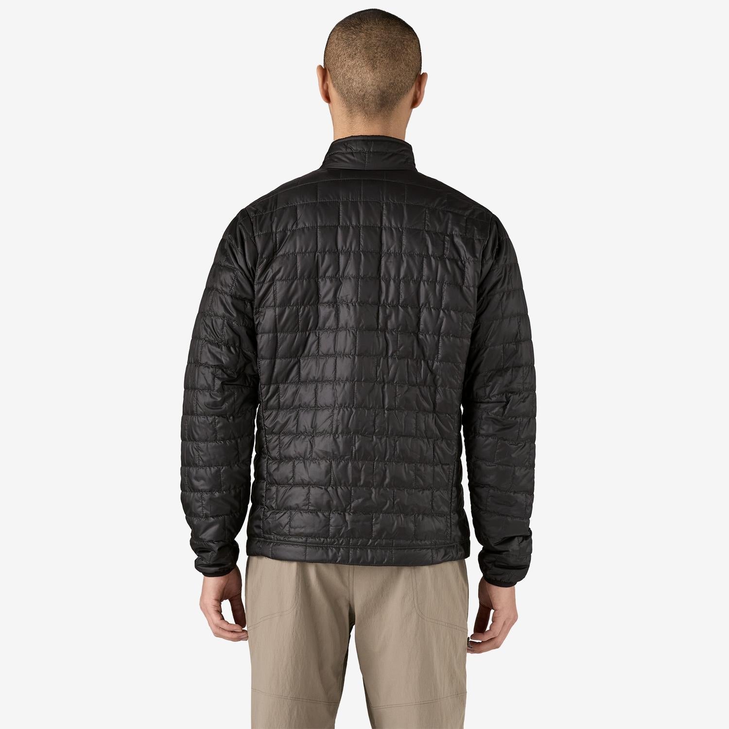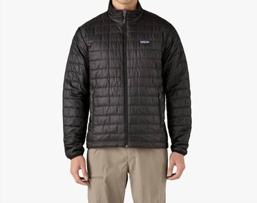 Introducing the Nano Puffer Jacket by Patagonia, a solid black staple in men's workwear designed for style and function. Featuring long sleeves and crafted with a shell made of 1.4-oz 20-denier 100% recycled polyester ripstop, this jacket offers a DWR (durable water repellent) finish to withstand rain. The zip closure ensures easy wearability, complemented by a mockneck for additional comfort and warmth. Equipped with a practical internal zippered chest pocket and two zippered handwarmer pockets, this jacket requires dry cleaning and should be laid flat to dry, making it a thoughtful addition to any wardrobe.