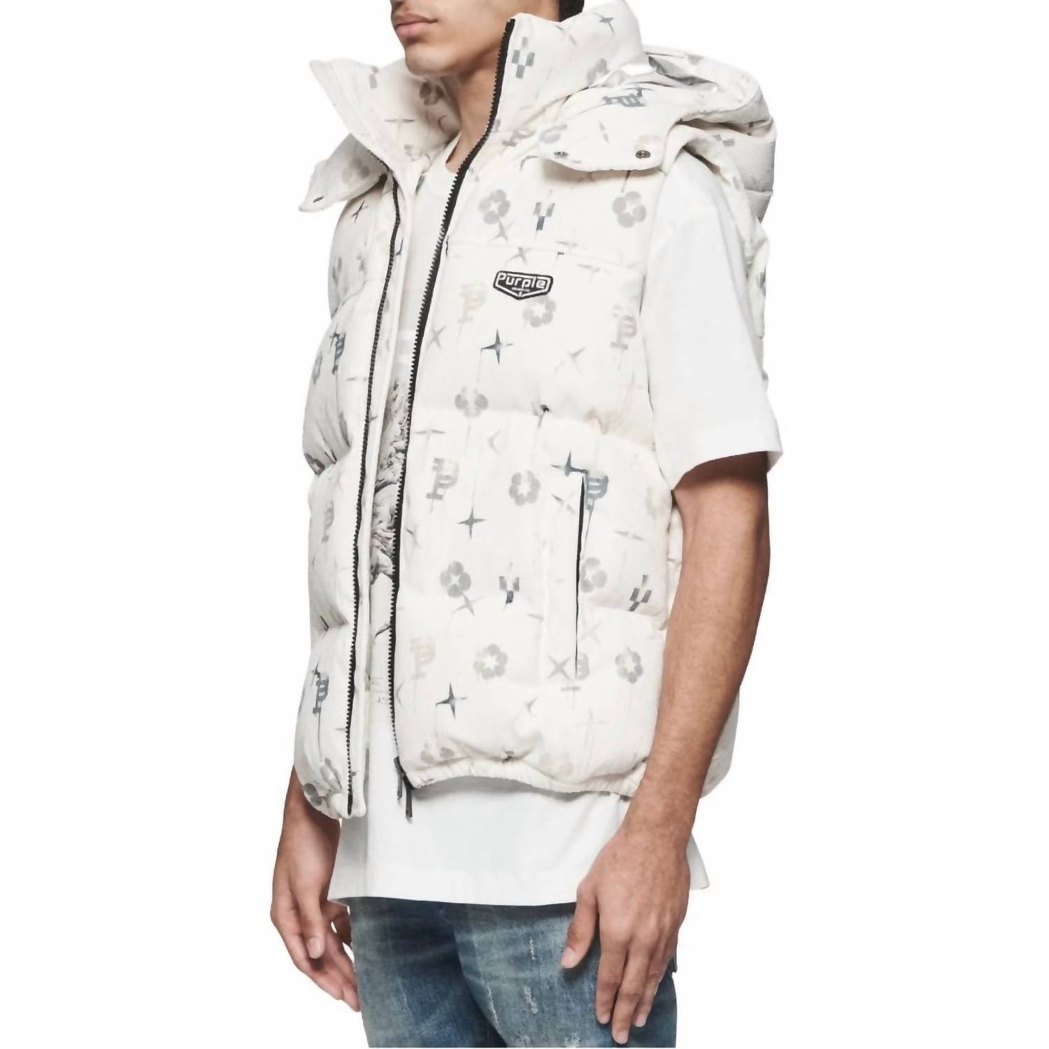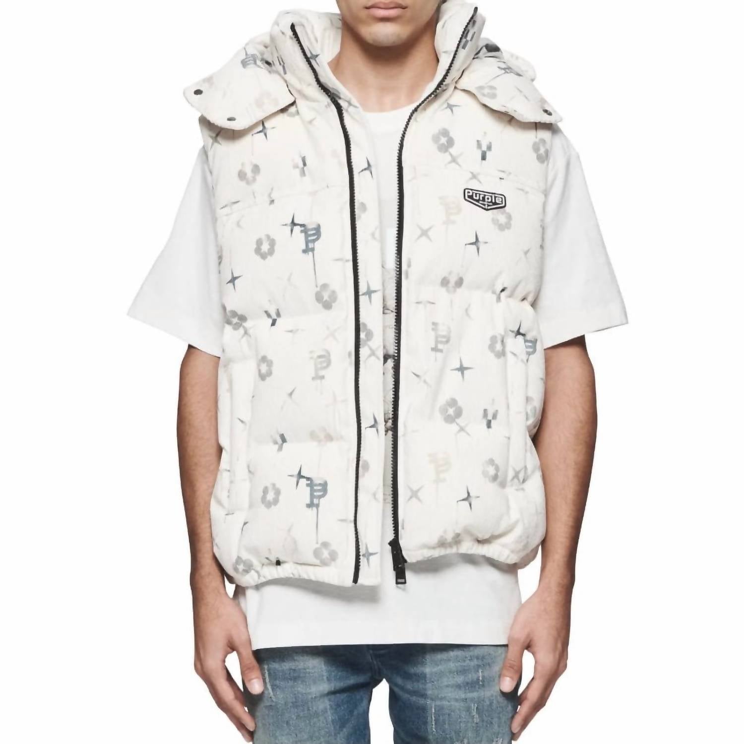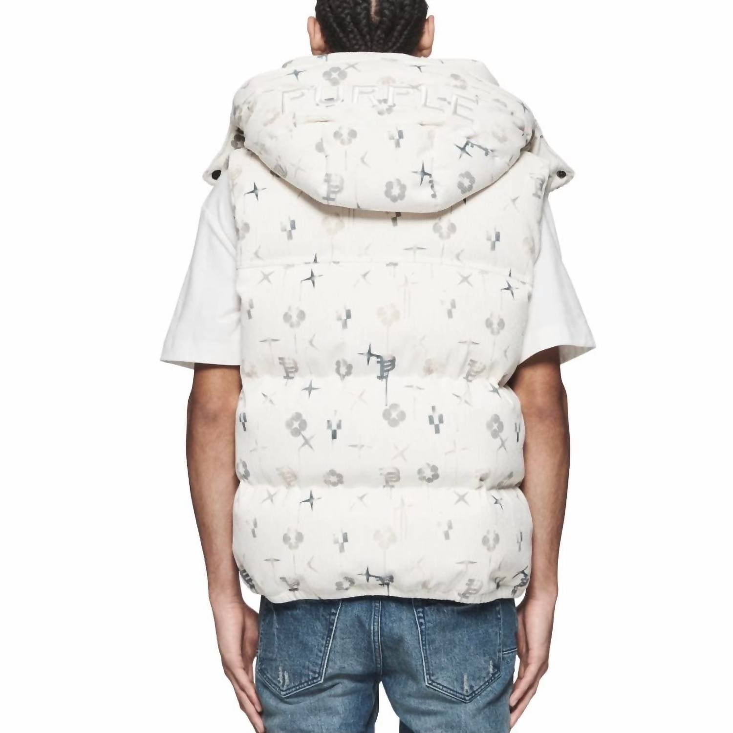 Introducing the Printed Corduroy Puffer Vest by Purple Brand, a chic addition to your streetwear collection in white. This sleeveless vest is crafted from premium corduroy featuring an allover monogram print, with a water-resistant membrane for added protection. It includes a zip closure leading to a high neck with snaps, an insulating detachable hood with brand logo embroidery, and practical side pockets. Carefully designed for the fall season, it is filled with duck down feathers to ensure warmth. Care instructions: Hand wash and lay flat to dry.
