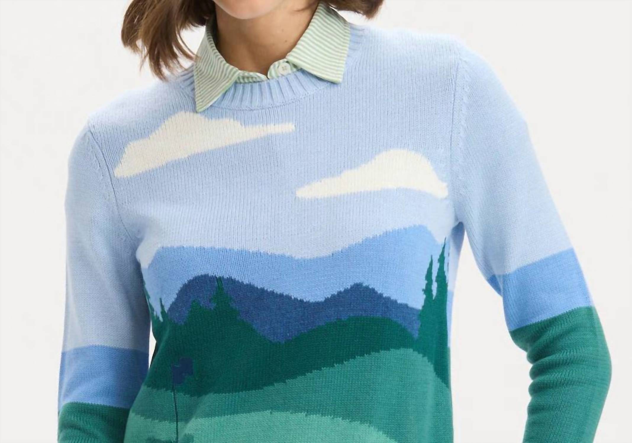 Elevate your fall wardrobe with the Renwick Golf Scene Long Sleeve Pull-on Sweater, perfect for travel and holiday occasions. This textured multi-colored sweater features a preppy golf scene with mountains, complete with ribbed trim at the cuffs and hem and an embroidered pin flag in navy. Made from a cotton blend, it boasts comfort and style, with a pull-on closure and a classic crewneck design. Imported and easy to care for, machine wash and lay flat to dry for best results.