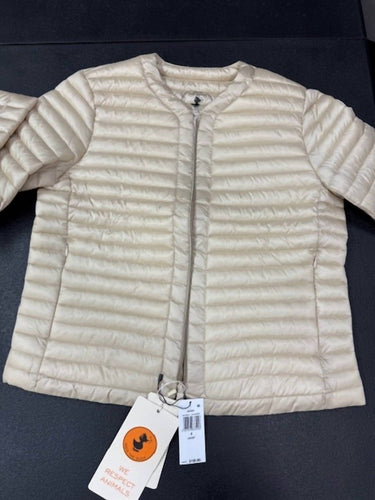 Discover the Women's Lightweight Down Jacket by SAVE THE DUCK, perfect for embracing the Quiet Luxury trend in Shorebeige. This textured puffer is designed with long sleeves and a convenient zip closure, ensuring comfort and warmth for winter travel. Originating from a focus on sustainable fashion, this jacket features crewneck detailing and practical pockets.