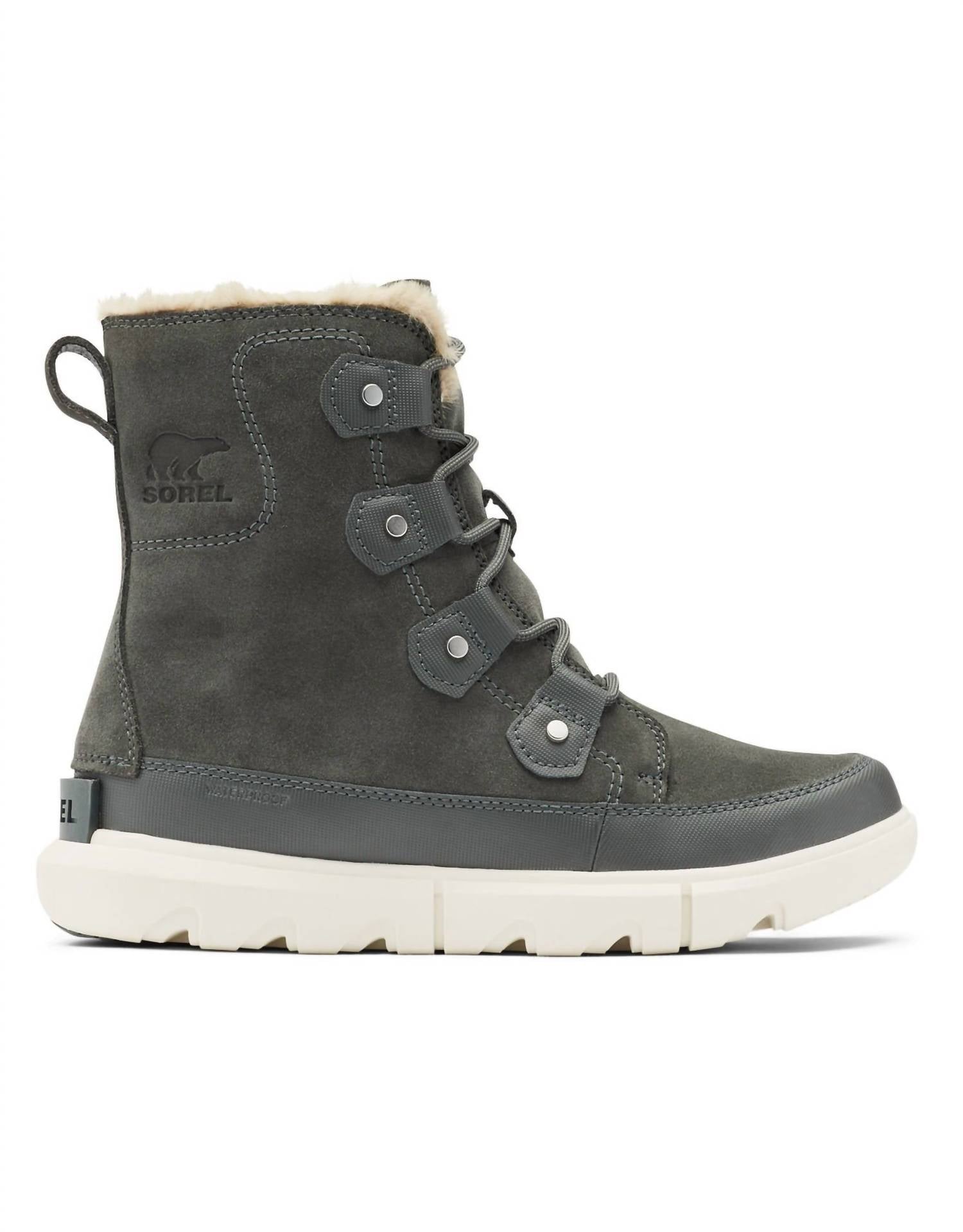 The Sorel Explorer II Joan Faux Fur WP women's winter boots provide 100g insulation and feature a molded PU-like EVA footbed with a microfleece topcover. They have a 1" heel, 1 1/4" platform, and a 6 1/2" shaft height. The boots include a molded EVA midsole with SOREL scallops and a high-traction rubber outsole for grip. Note that laces and zippers are not waterproof.