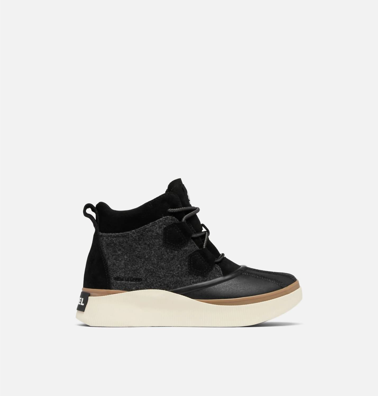 Introducing the SOREL Women's Out N About IV Classic Waterproof Boots in Taffy Black, designed for outdoor excursions and urban adventures. These boots feature a waterproof full grain leather or suede upper, complete with a waterproof vulcanized rubber shell and textile lining for ultimate weather protection. With a lace closure and a molded EVERTREAD™ rubber outsole, they offer sturdy traction and a comfortable fit. The boots boast a heel height of 1/4 inch and a shaft height of 5 1/4 inches, providing a trendy yet functional silhouette. Measurements are based on size 7, and these boots are imported.