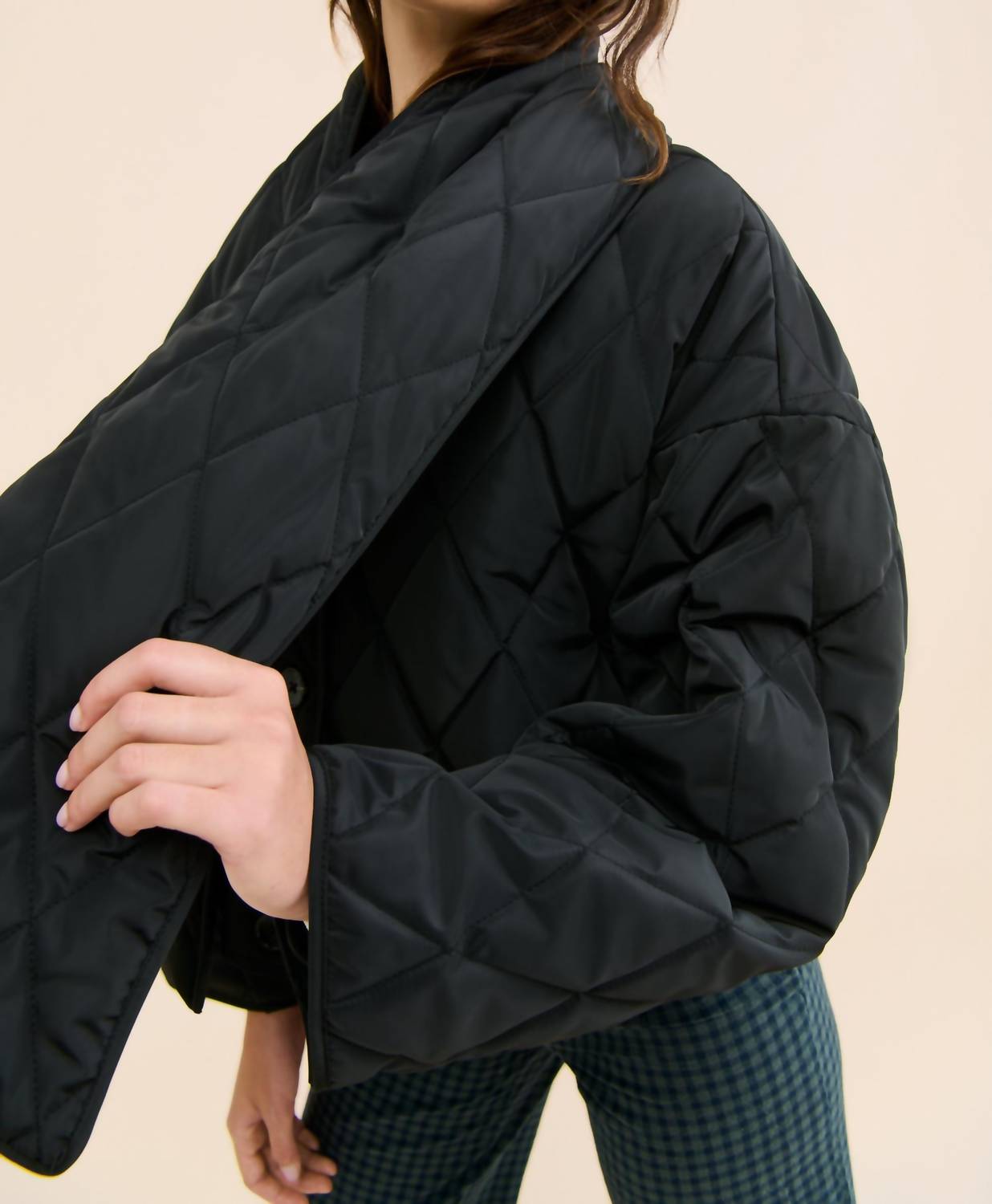 Introducing the Steve Madden Diarine Scarf Puffer Jacket, a stylish choice for women seeking both warmth and sophistication. This textured black puffer is crafted from polyester and features long sleeves and a high collar paired with an attached oversized scarf for added elegance. The button closure ensures a secure fit, while the cinched waist offers a flattering silhouette perfect for various occasions. Elevate your winter wardrobe with this versatile piece, ideal for both casual outings and formal events.