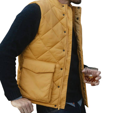Introducing the Parker Puffer Vest by The Normal Brand, an essential piece for your winter wardrobe in a striking goldenrod hue. Crafted from nylon, this sleeveless vest features a stand collar and a secure zip closure beneath a hidden snap placket. It offers practical envelope-style body pockets with flaps and side entry, as well as an inside cell phone pocket, making it perfect for travel and capturing the 90s fashion trend. Please refer to care instructions for maintenance guidance.