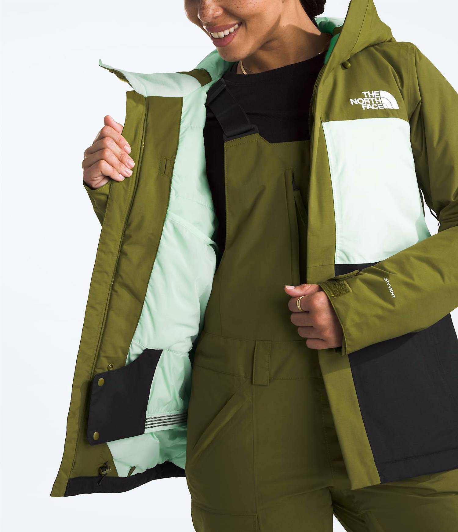 Introducing the Women's Freedom Insulated Jacket by THE NORTH FACE, a must-have for ski enthusiasts and adventurers alike. This long-sleeve jacket, crafted from solid recycled nylon with recycled polyester lining, ensures you stay warm and dry with its waterproof, breathable, seam-sealed DryVent 2L shell. It features a zip closure, adjustable helmet-compatible hood, underarm venting, and a snap-down powder skirt, offering functionality and comfort for any fall trip. Care instructions include machine washing and tumble drying. Available in Forest Olive-Pale Green-TNF Black.