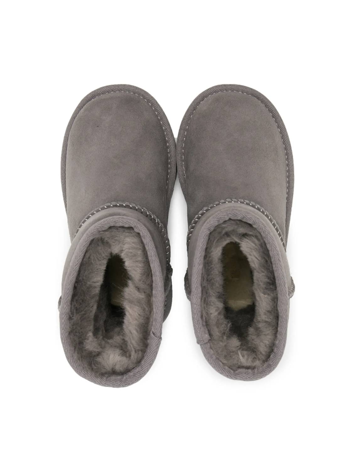 Introducing the Toddler Classic II Boots by UGG, crafted from luxurious 0.66" Twinface sheepskin in a versatile grey hue. These boots feature a 4" shaft height, offering a comfortable barefoot feel with an ultra-lightweight cushioned outsole, perfect for active toddlers. The flexible rocker-bottom shape and unique sole options, including a sugarcane EVA outsole or Treadlite by UGG™ EVA outsole, support both movement and sustainability. Enhanced with a protective post-applied water repellency treatment and overlock stitch detailing, these boots ensure durability and style throughout the day.