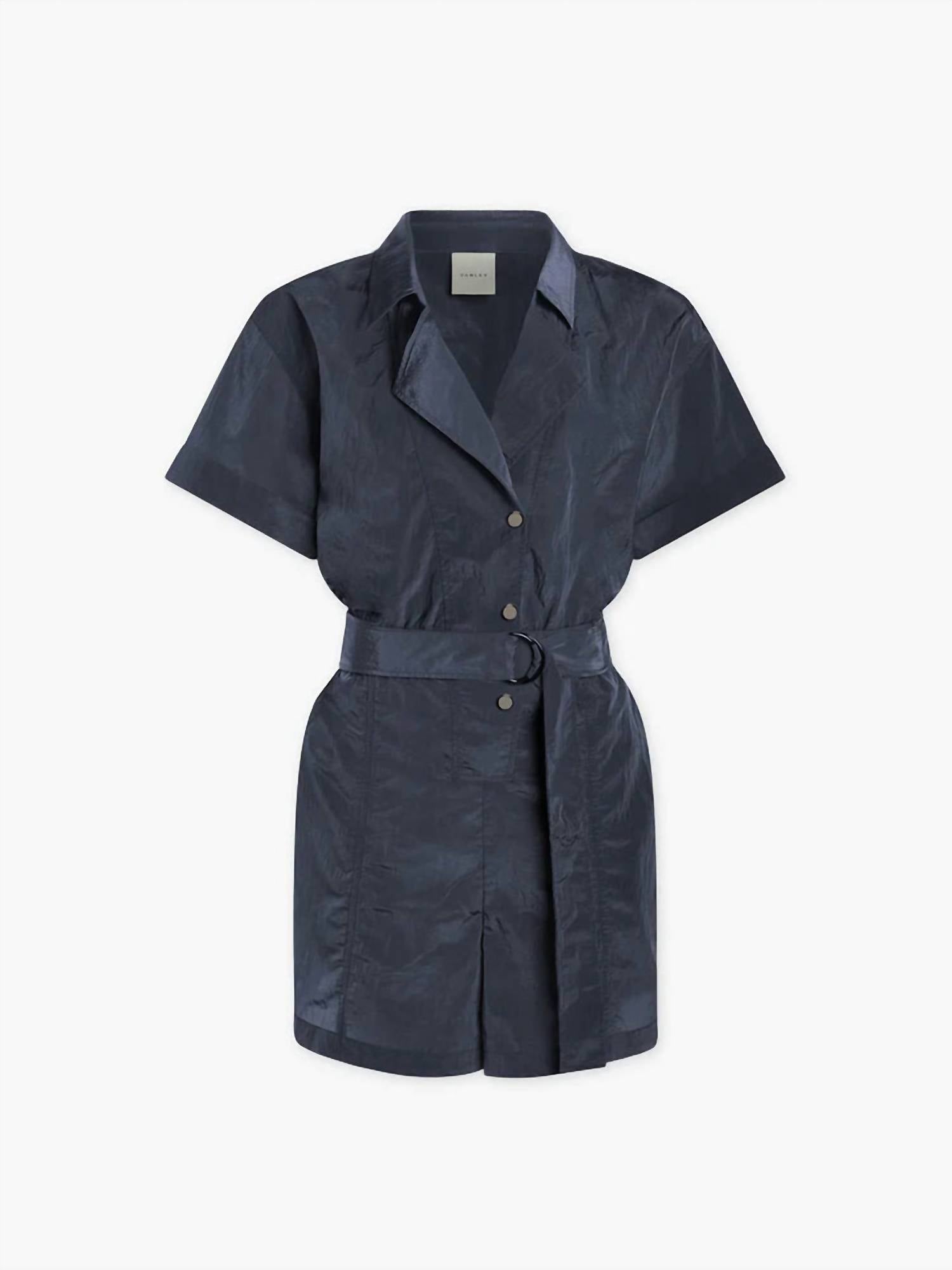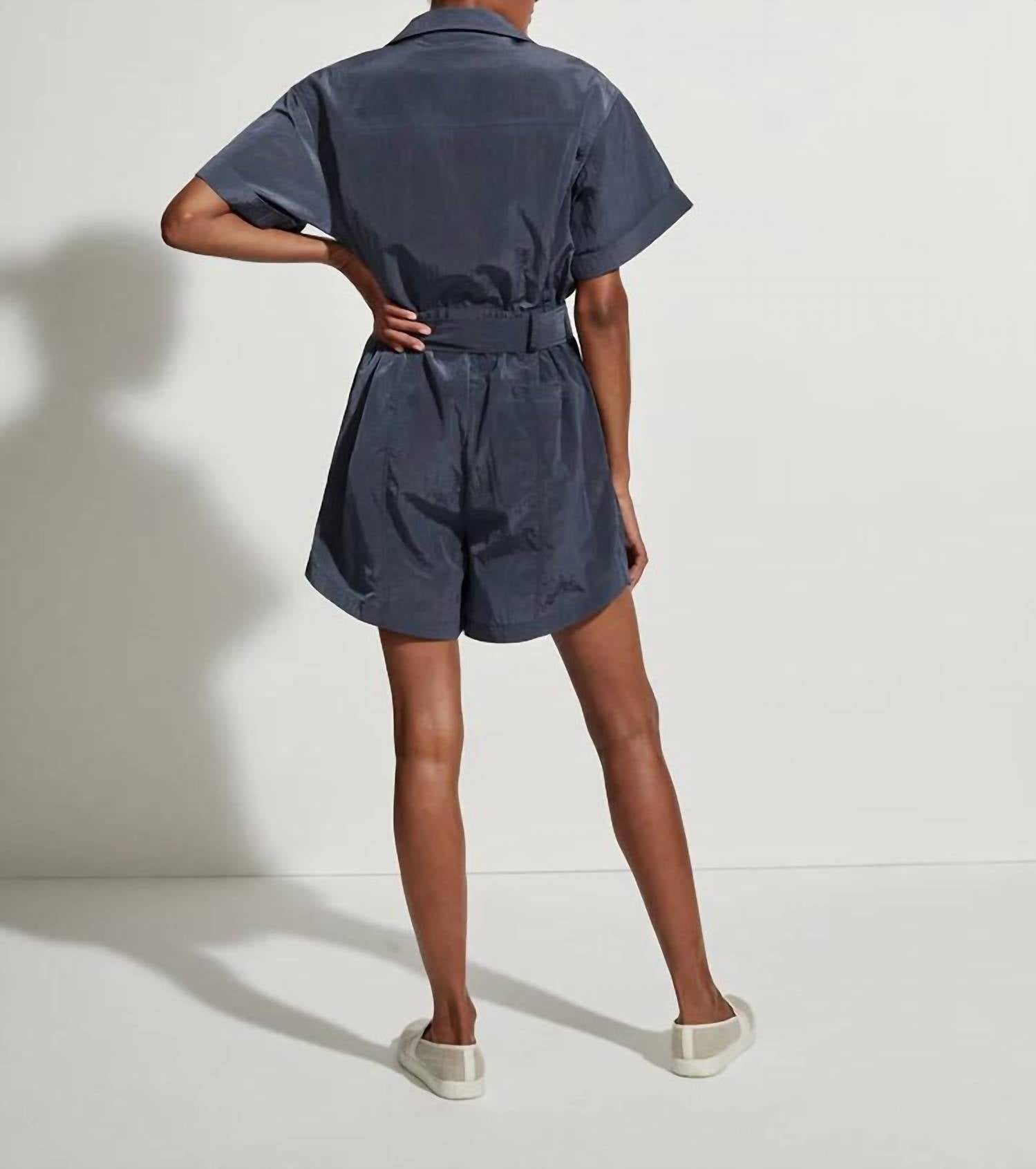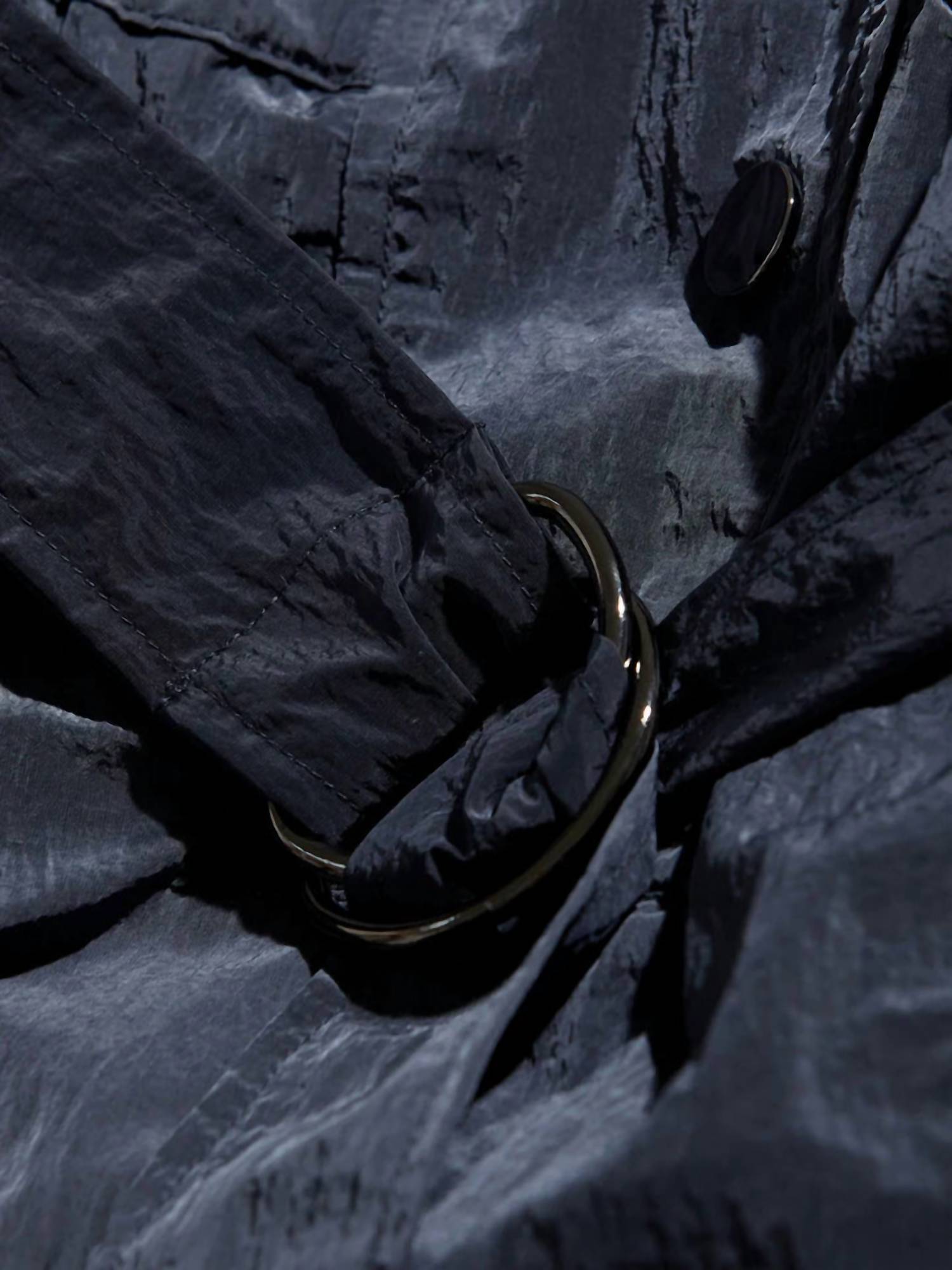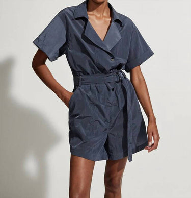Lightweight, non-stretch technical weave. Covered elastic waistband with optional self-belt. Gunmetal-tone hardware and snap placket. Collared neckline and notched lapels. Short sleeves with fixed cuffs. Slant hip and welt back pocket. Shell: 100% nylon. Unlined. Wash cold. Imported.