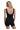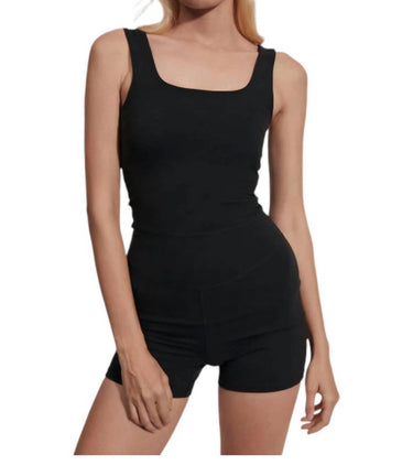 It doesn't take much for this one piece to look effortlessly cool. Add some statement jewelry to dress it up, or throw on some sneakers for a more casual vibe. Essential black activewear piece engineered for versatility and performance. Designed with a square neckline and waist seam detail. Crafted from medium support polyester fabric providing comfortable and dynamic movement. Featuring a pull-on closure for ease. Tailored for a fitted silhouette with precise dimensions: Front Rise: 10.8", Waist: 11.4", Inseam: 3.9". Care: Hand wash for best maintenance.