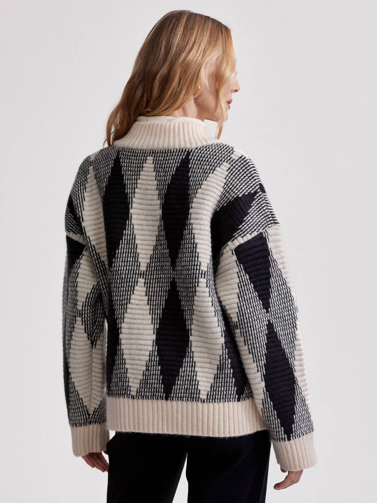Elevate your winter wardrobe with the Nancy Jacquard Knit Jacket by VARLEY, a chic women's cardigan in Whitecap Grey Diamond. This long sleeve jacket showcases a striking geometric pattern and features a stylish V-neck design. Made from Acrylic, it is finished with a practical button closure and convenient pockets. For best results, dry clean only.