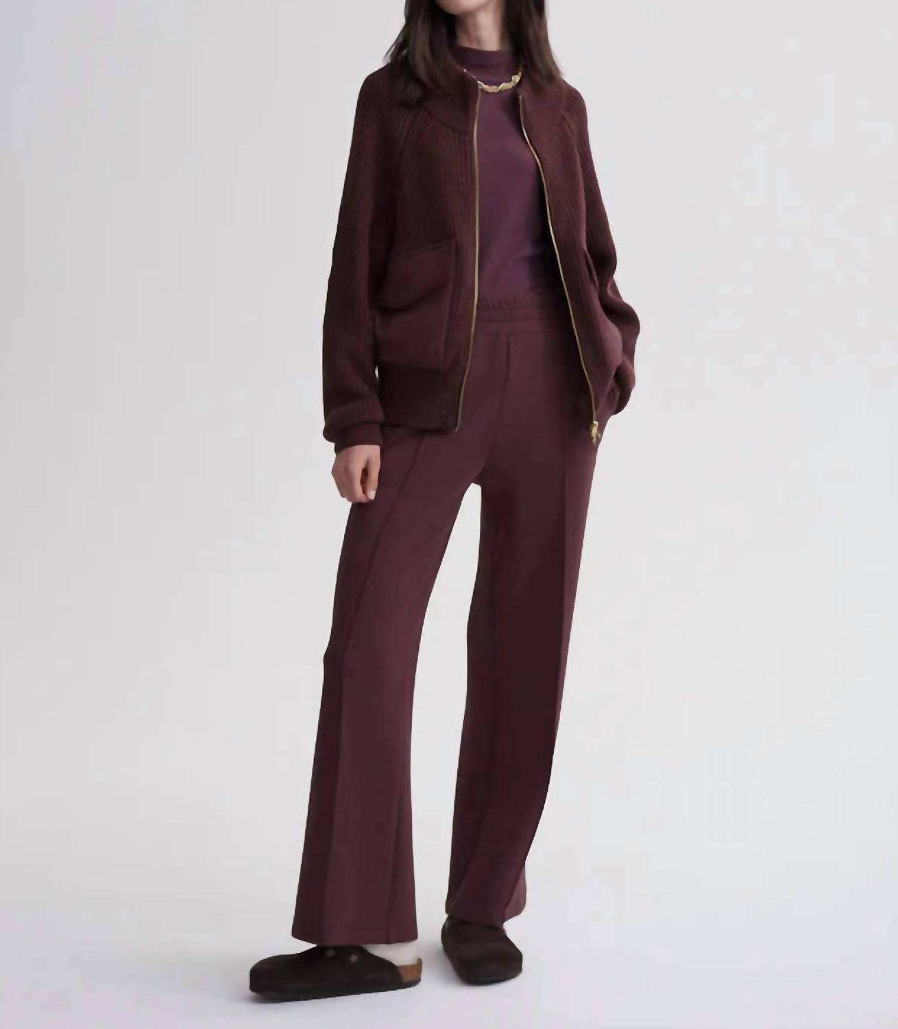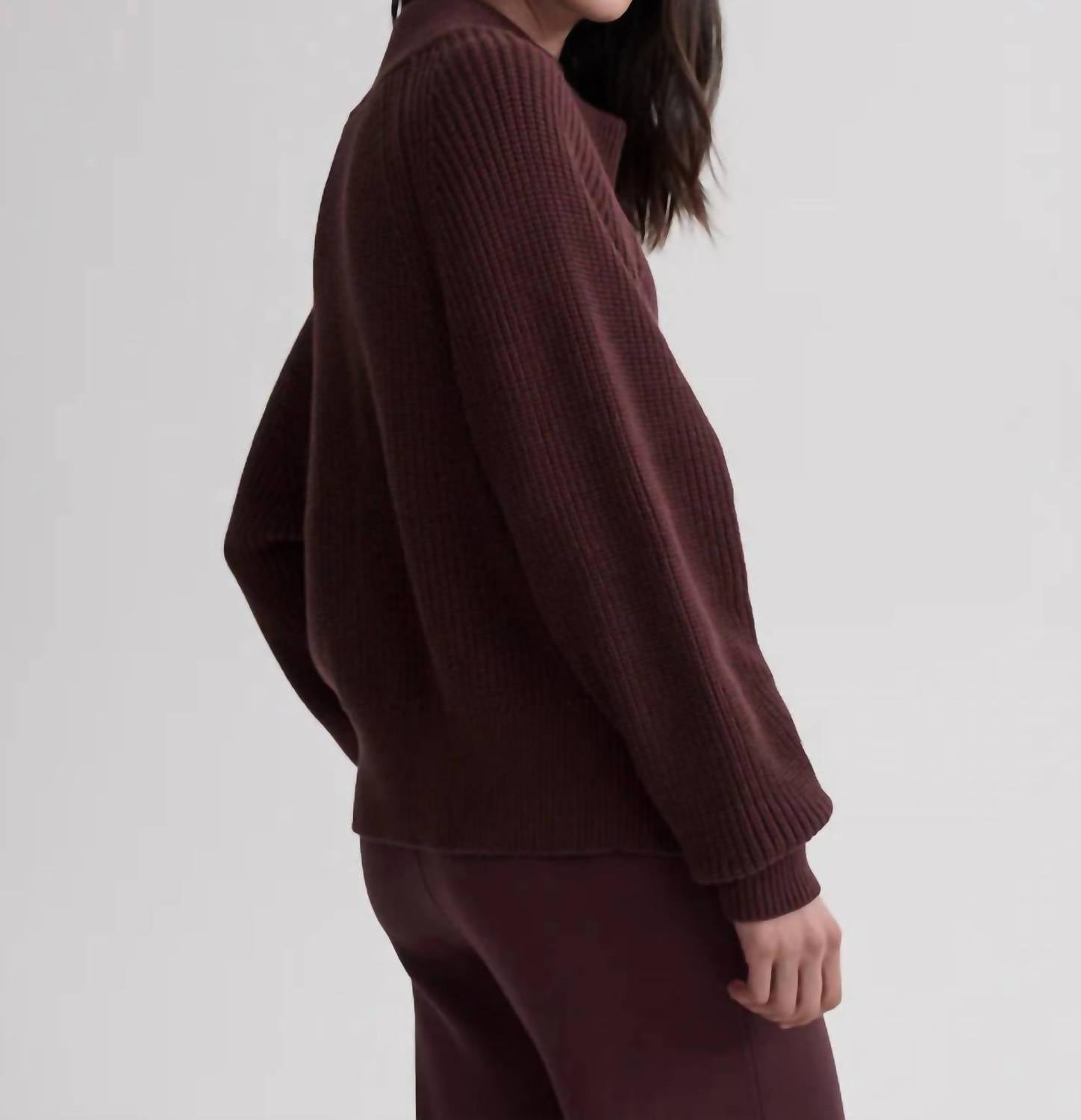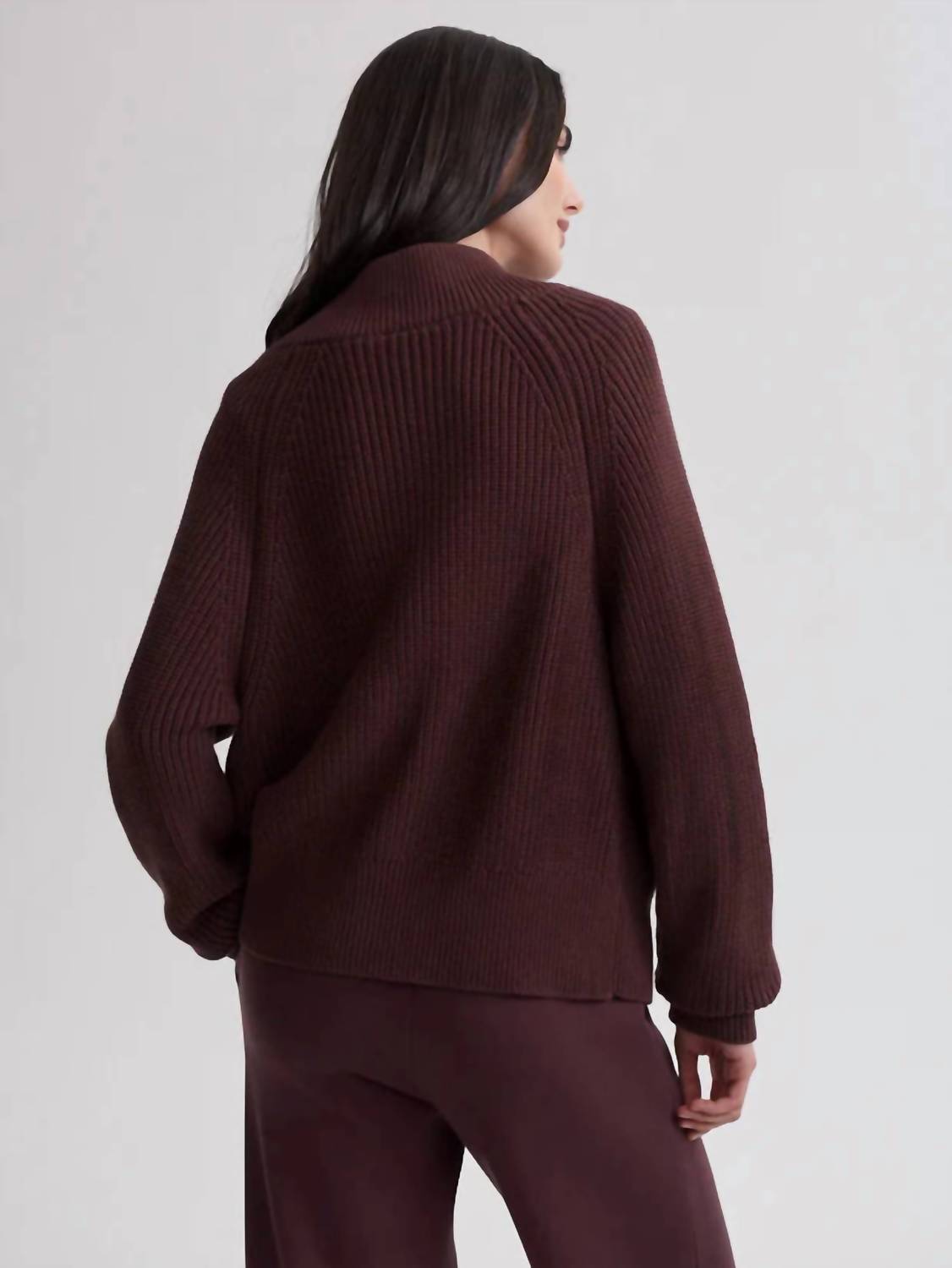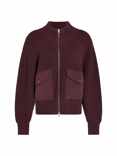 Introducing the Tessa Knit Jacket by Varley, a stylish blend of form and function in deep mahogany. Featuring long raglan sleeves and crafted from 100% cotton, this utility jacket measures approximately 21.6 inches from shoulder to hem. Designed with a mock turtleneck and two snap flap pockets, it offers a two-way zip closure for versatility. Made abroad with care instructions of a machine wash, remember to fasten zippers before washing and reshape whilst damp for best results. Model is 5’10” and wearing a US size Small.
