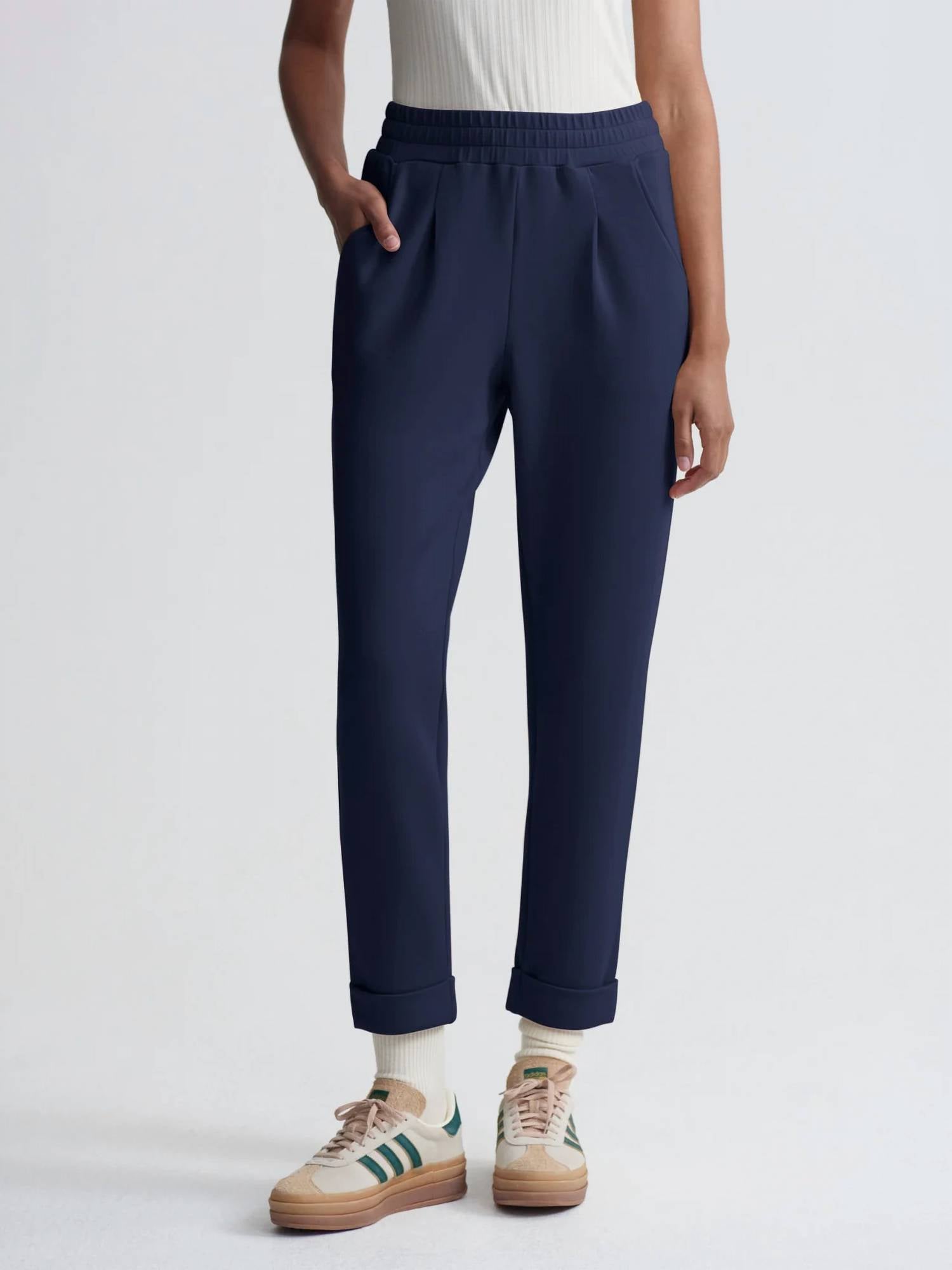 Discover the Rolled Cuff Pant 25" by VARLEY, an elegant choice in navy perfect for athleisure and fitness. Designed with a slim fit and high-rise tapered leg, these pants feature a 25" inseam and a 12" rise, along with shaped pockets and flattering front and back darts. Composed of a viscose blend—72% Viscose, 23% Polyester, and 5% Elastane—these pull-on pants effortlessly blend comfort and style. Care instructions include machine wash and lay flat to dry, ensuring easy maintenance for your active lifestyle.