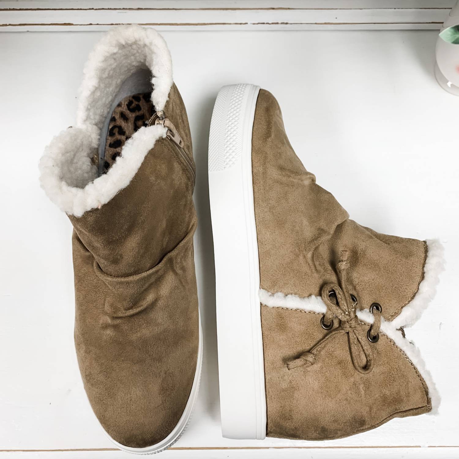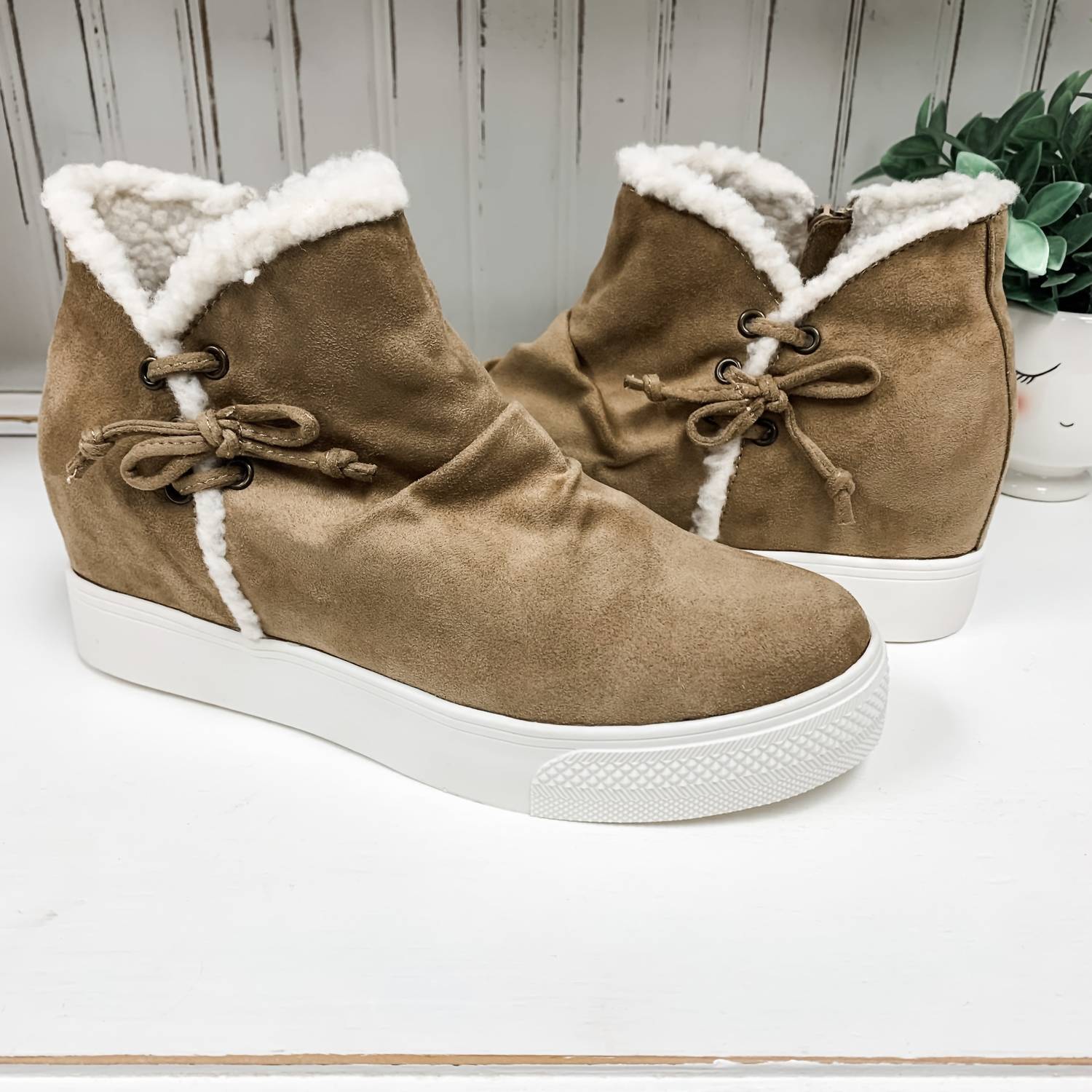 Meet the Jayden Wedge Bootie by Very G, a chic taupe ankle boot designed for style and comfort. It features a synthetic upper with warm sherpa lining, offering a cozy fit perfect for cooler days. The elegant V-cut and laced side are complemented by a decorative bow, while a side zipper closure ensures easy wear. Designed with a round toe and a hidden 2.5" wedge heel, this bootie is ideal for any occasion.