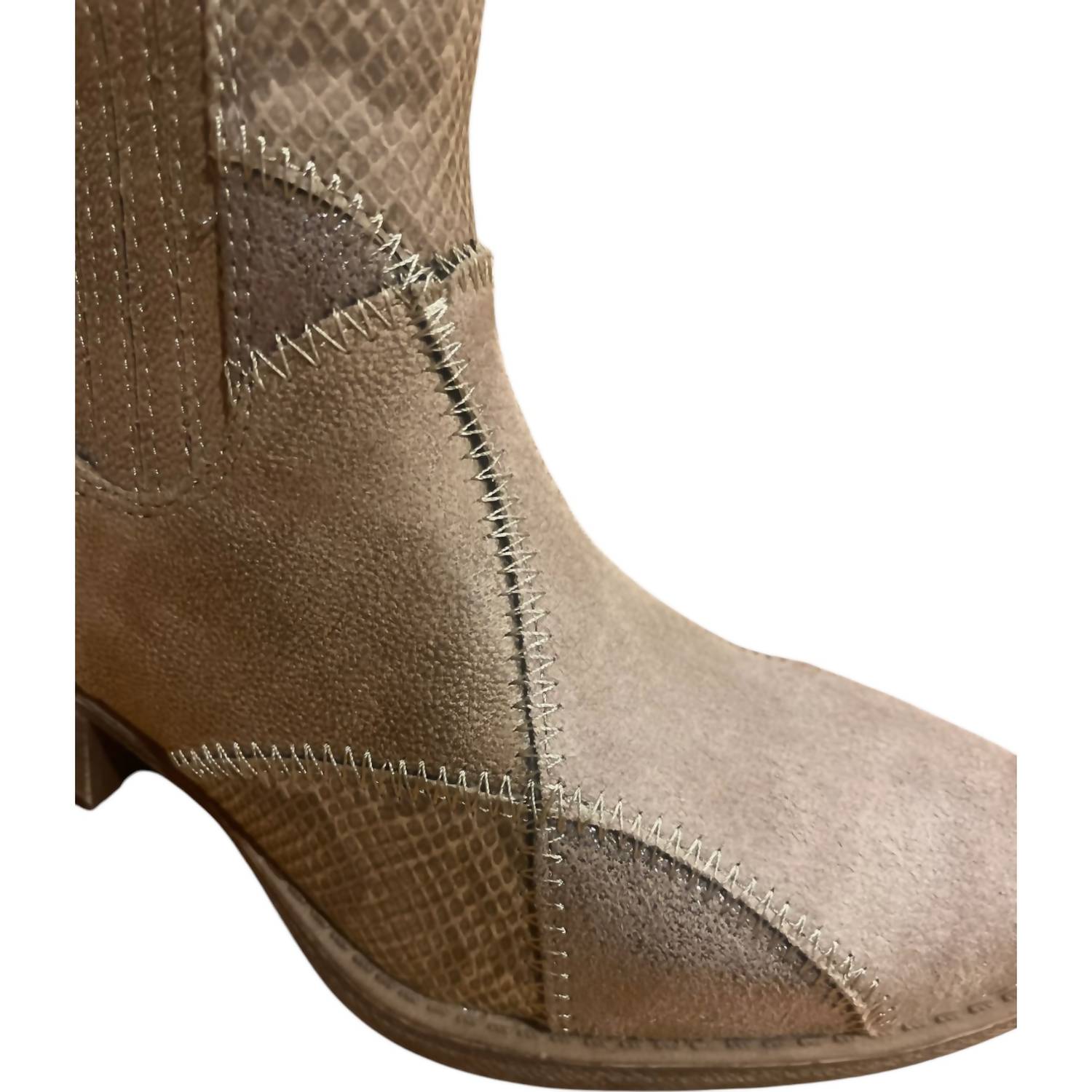 Eye-catching taupe design. With a low-block heel of 1.5 inches. Seamlessly blends patchwork and bling thread detailing. Slip on these booties without fuss thanks to their pull-on design. As convenient as they are fashionable.