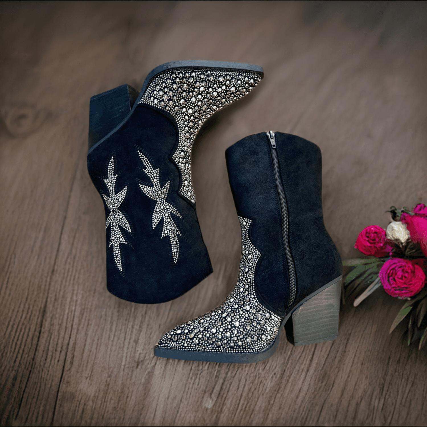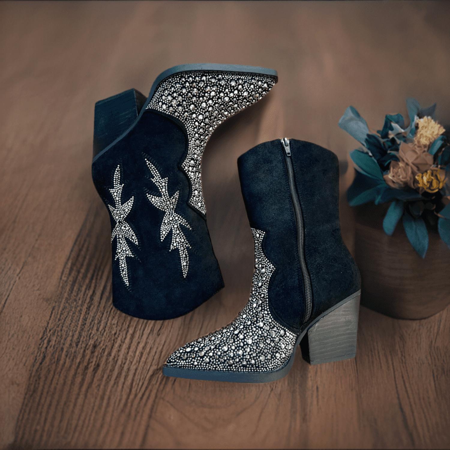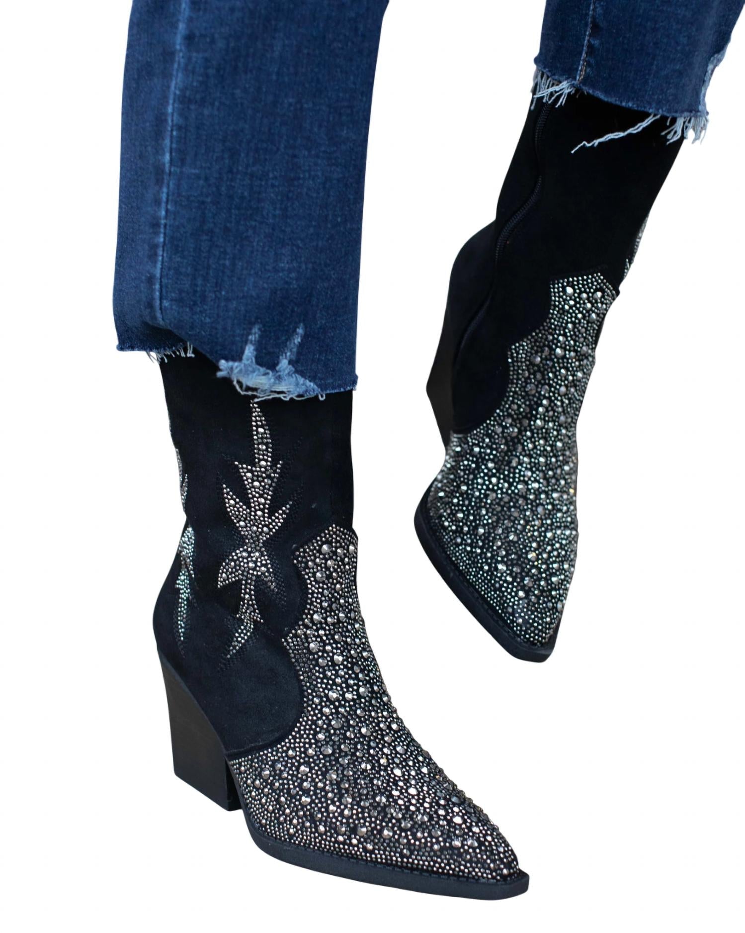 Elevate your party look with the Lux Rhinestone Booties by Very G, featuring a striking front silver rhinestone and side flared feather detailing. These booties boast a 3" wooden block heel and a pointed toe silhouette, offering both style and comfort. Crafted from a soft suede-like material, they measure 7" from ankle to top and stand 10" tall overall. Closure: Side zipper.