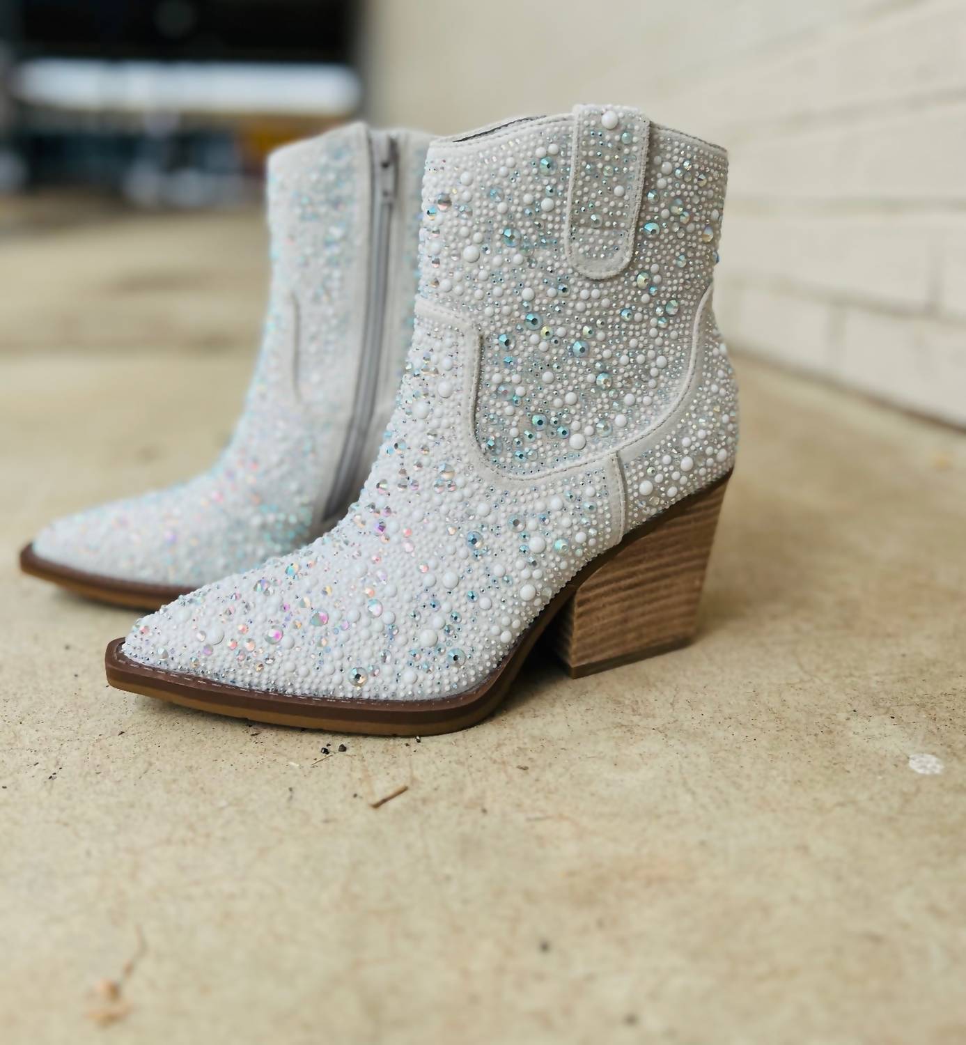 Step into elegance with the Pearl "Kady" Silver Rhinestone Booties by Very G, where sophistication meets the bold western trend. Featuring a pointed toe silhouette, these booties are adorned with pearls and rhinestones, offering an unmatched level of luxurious detail. Designed with a convenient side zipper closure, they stand at an ankle length of 5 inches, with a total height of 8.5 inches from sole to top, and a sturdy 3-inch wooden block heel. Perfect for any NFR or Rodeo event, these booties are also available in black and white.