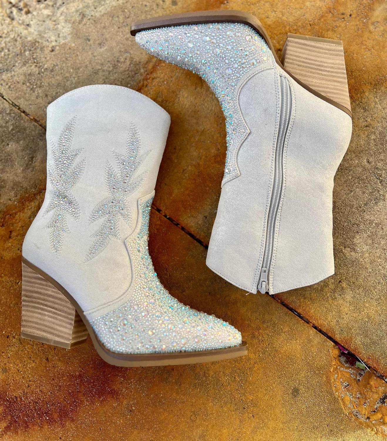 Step into elegance with the Women's Rhinestone Booties by Very G, a dazzling choice for your next party. Crafted from a soft suede-like material, these Lux Grey booties showcase mesmerizing iridescent rhinestone detailing and flared feather accents. The style features a pointed toe silhouette and a convenient side zipper closure, supported by a sturdy 3-inch wooden block heel. Measuring 10 inches from sole to top, these booties offer a chic 7-inch calf length from ankle to the top of the boot.