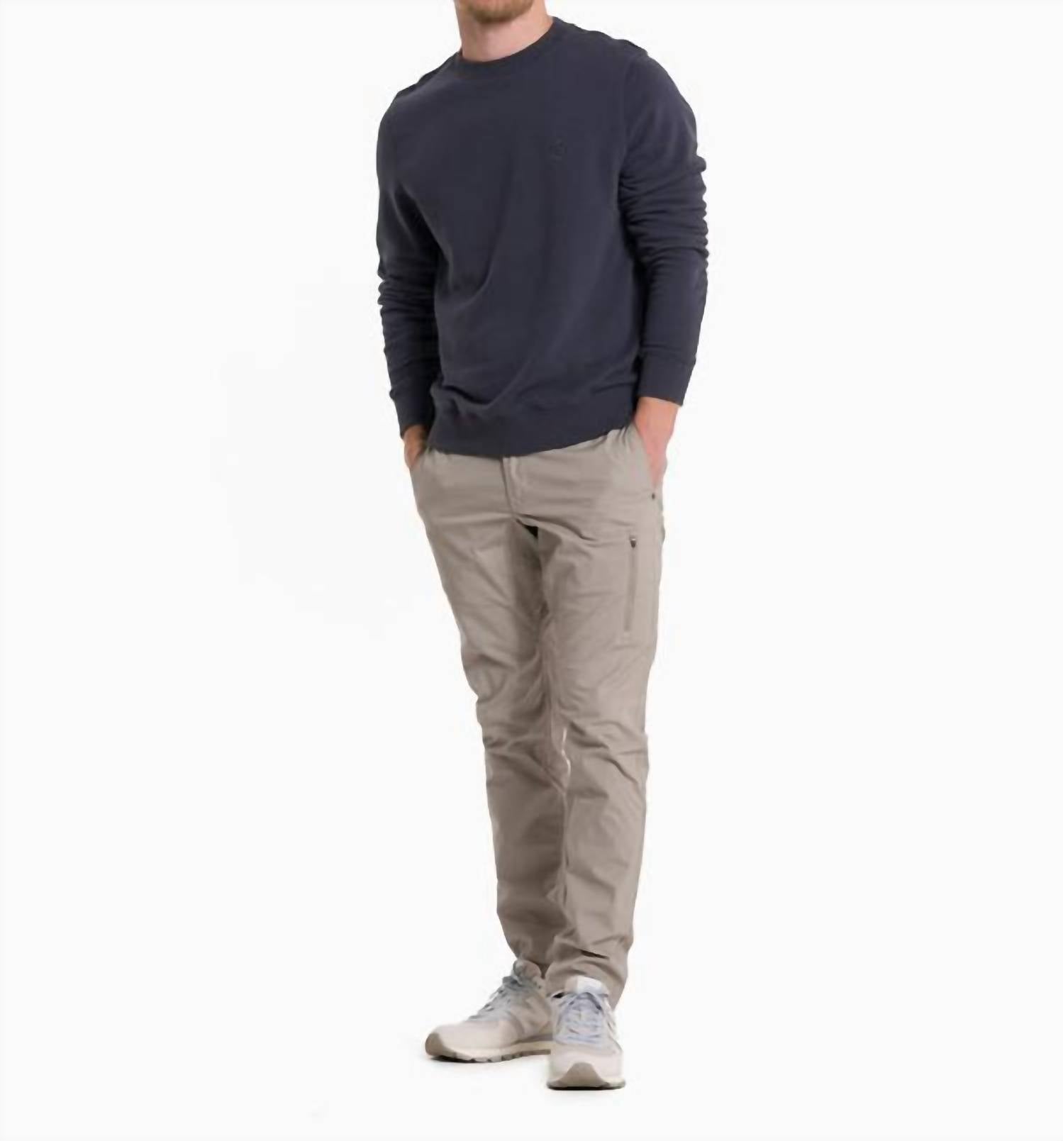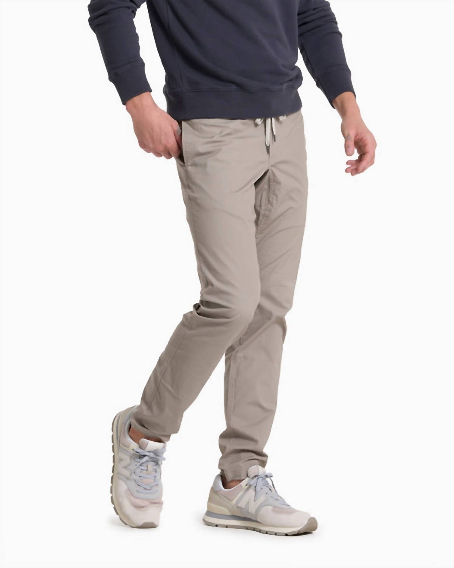 Experience comfort and style with Vuori's Ripstop Pants in Sesame, crafted from a sustainable cotton blend featuring 98% organic cotton and 2% elastane. Designed for men, these pants showcase a modern, slimmer fit with a 33" inseam, intended to be worn cuffed for a tapered leg look. The elastic waistband with a drawcord closure offers a pull-on style, complemented by functional mesh pockets and a zip pocket. Durable yet flexible with a two-way stretch, they are easy to care for with machine wash cold and tumble dry low instructions. Model is 6'1" and wears size M.