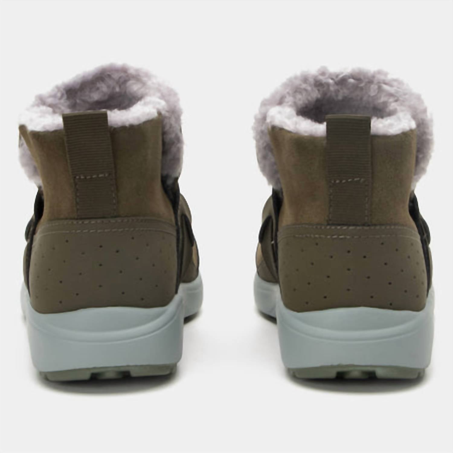 Introducing the Women Arctiq Bootie by Alegria, an olive-hued ankle boot that blends style with functionality for those chilly walks. Featuring a genuine suede upper with warm sherpa lining, it ensures cozy comfort. The bootie includes a pull tab and elastic strap for easy on-and-off and a secure fit, while the lightweight polyurethane Q-Sport Walker 2 outsole provides non-marking, slip-resistant support with enhanced shock absorption and a 1-inch flat heel. The removable, washable footbed adds to its practicality, making it a must-have choice for outdoor enthusiasts.