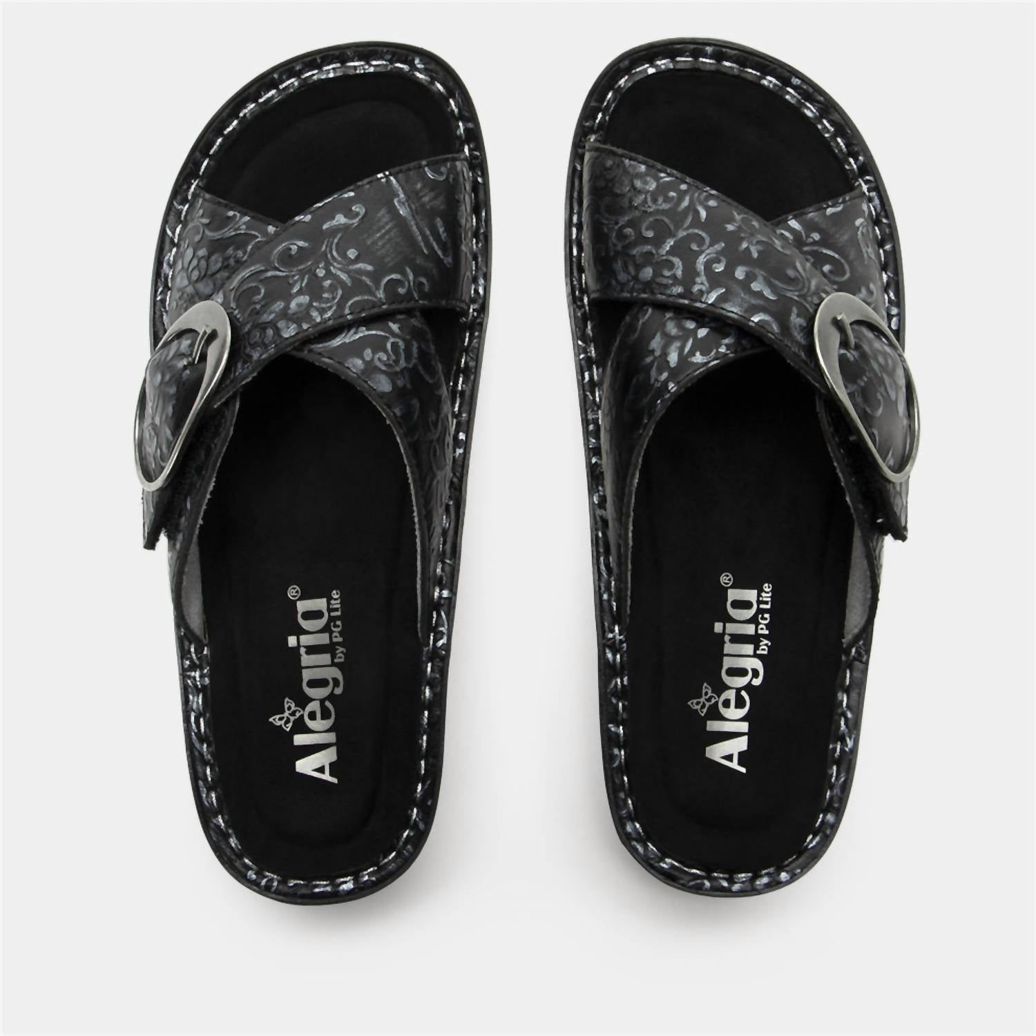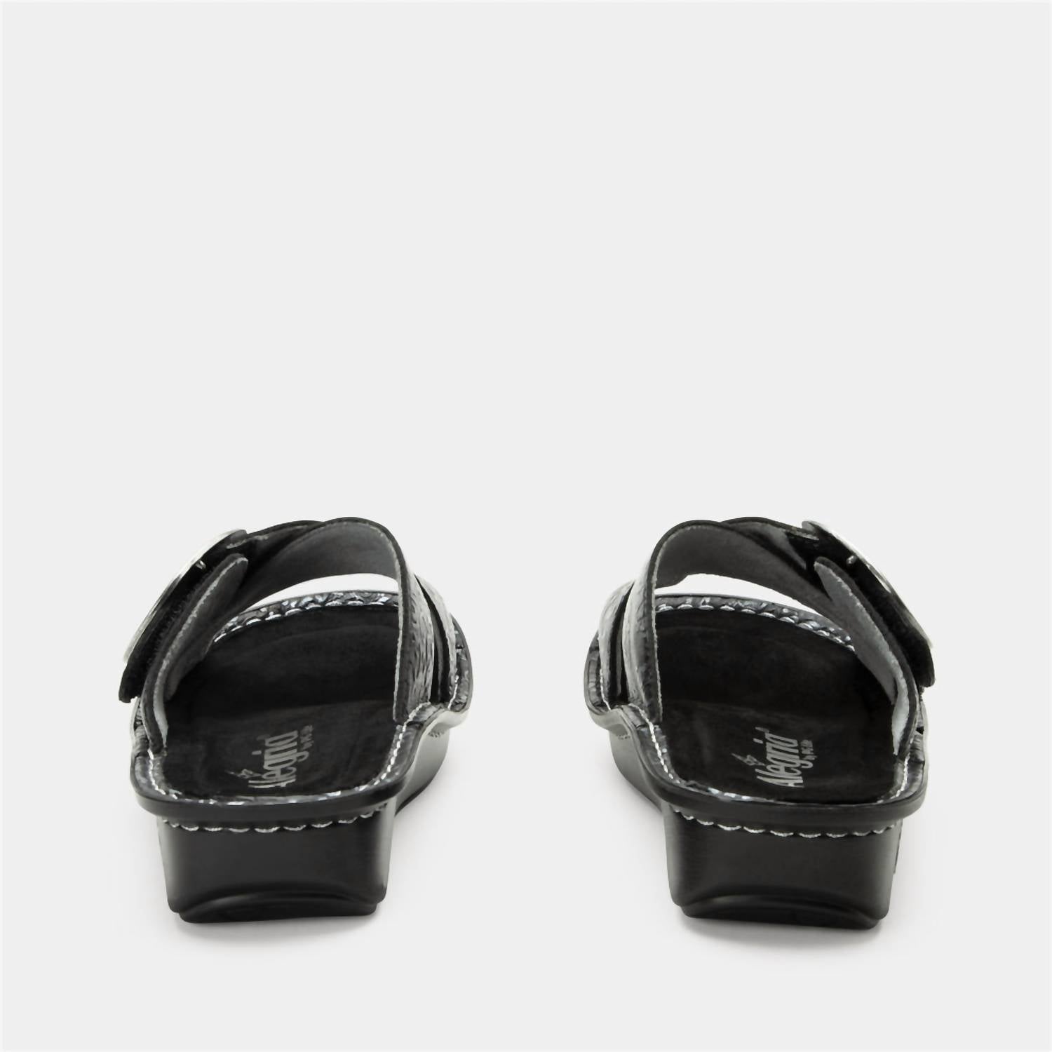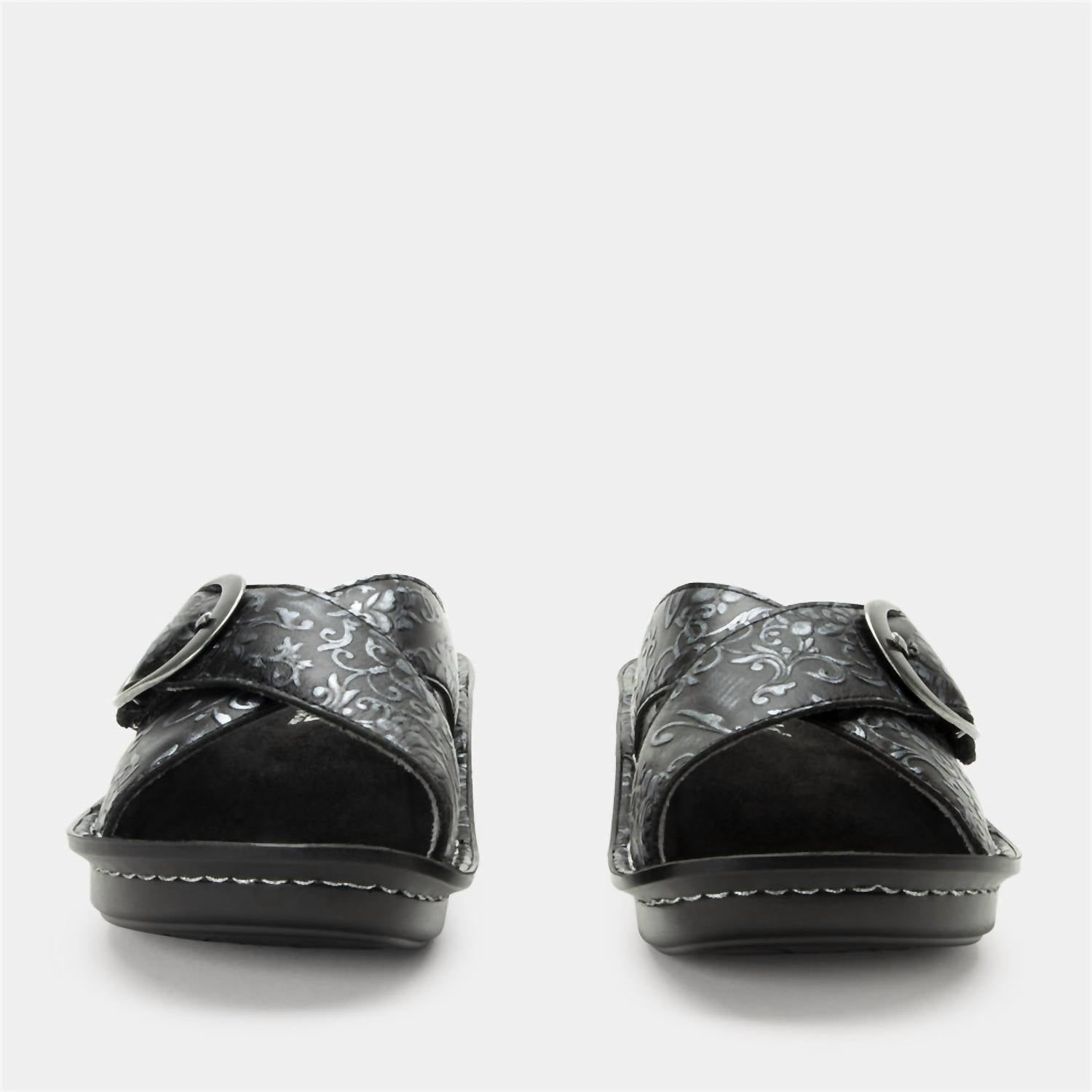 This crisscross sandal elevates a classic silhouette with handstitched detailing and an ornamental buckle on an adjustable hook‑and‑loop strap. A removable contoured footbed, crafted from cork and memory foam, fits into a mini outsole to support easy walking and comfort. Available with uppers in textured calf hair or smooth leather, it blends refined style and everyday wearability. This model also meets podiatric standards, includes a detachable, ergonomically designed footbed, and features a 1‑inch heel built on a mini‑rocker outsole.