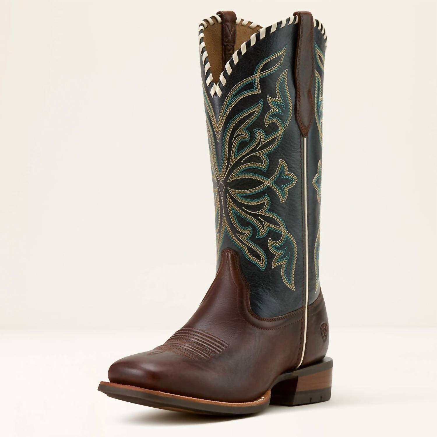 Step into style with the ARIAT Women's Showdown Western Boots in Espresso Textured Blue, perfect for a holiday party or summer gatherings. These boots feature a 12" shaft height and a low 1.5" horseman heel with a wide square toe. Crafted from full-grain leather with a synthetic lining, they offer comfort with a removable All Day Cushioning insole and ergonomic support through ATS® technology. The stylish five-row stitch pattern and whipstitched topline enhance their Western charm.