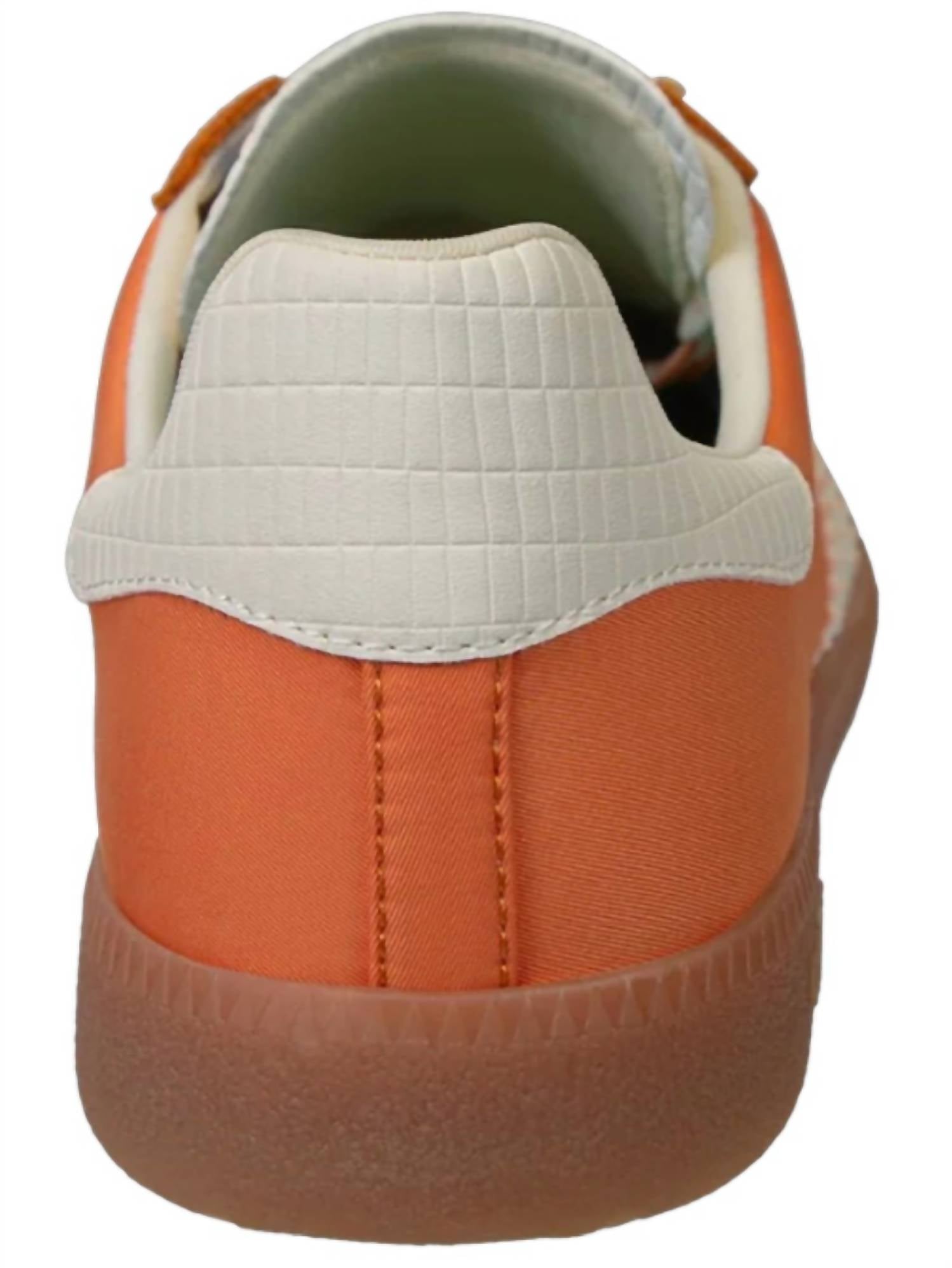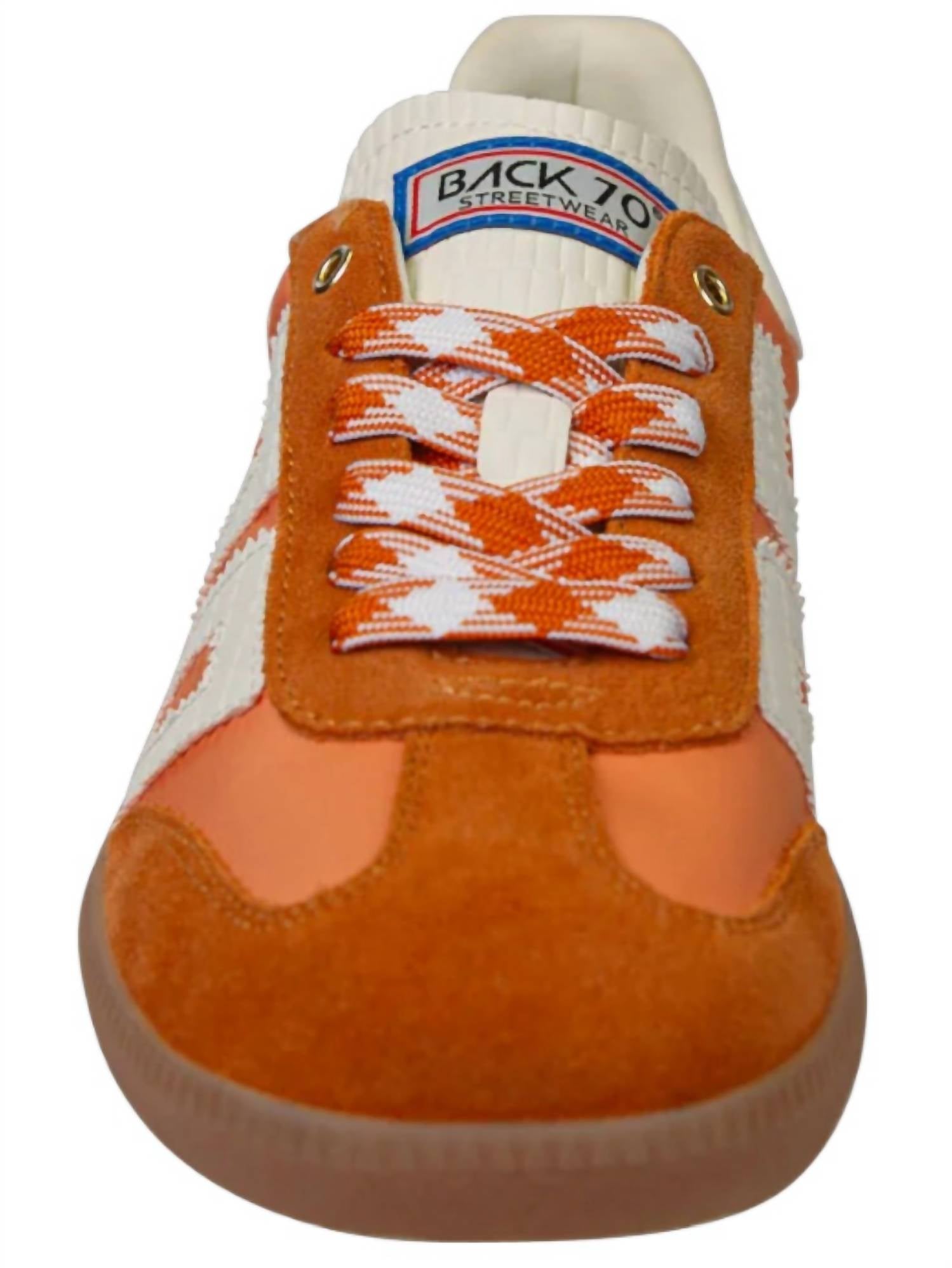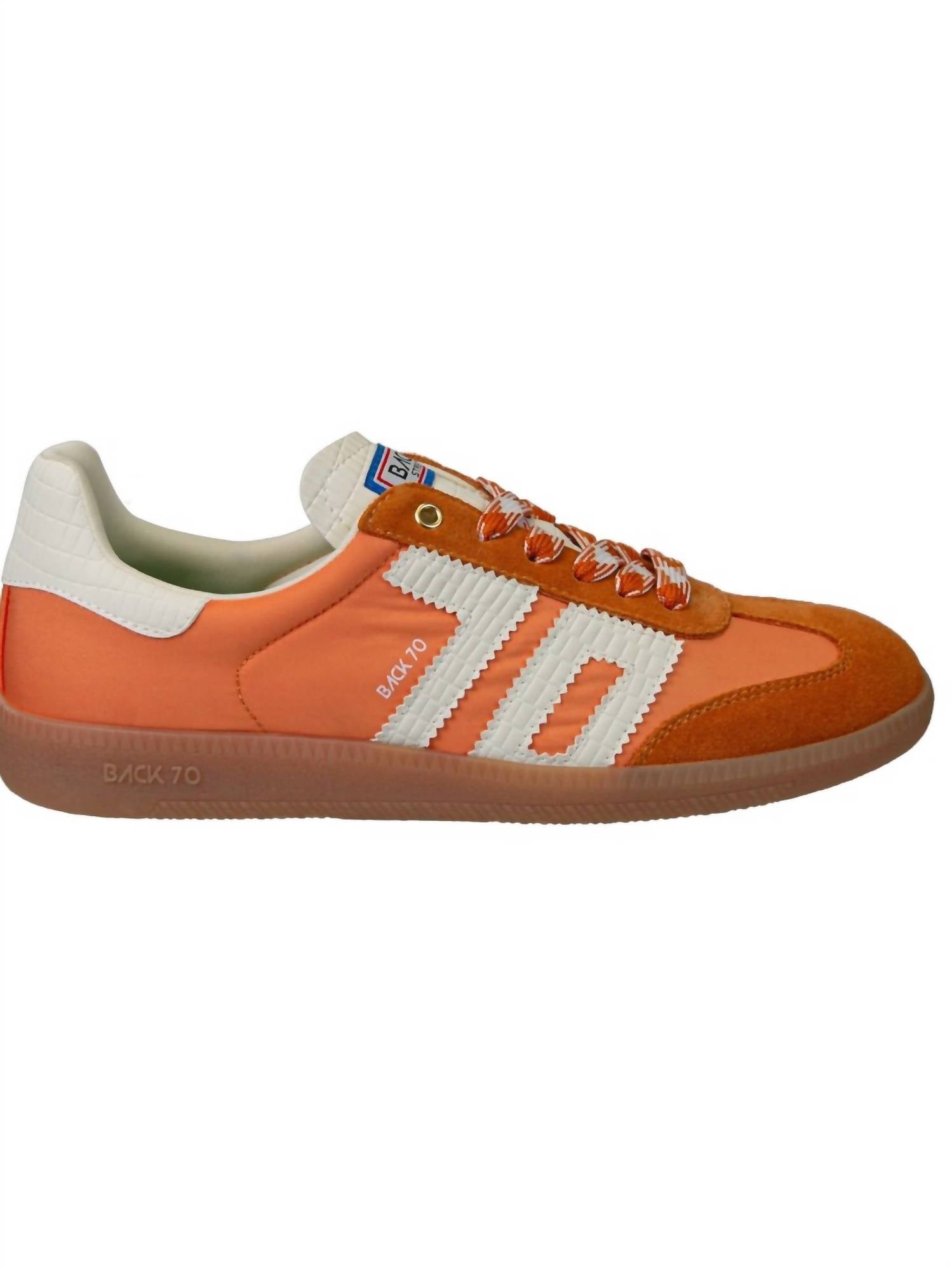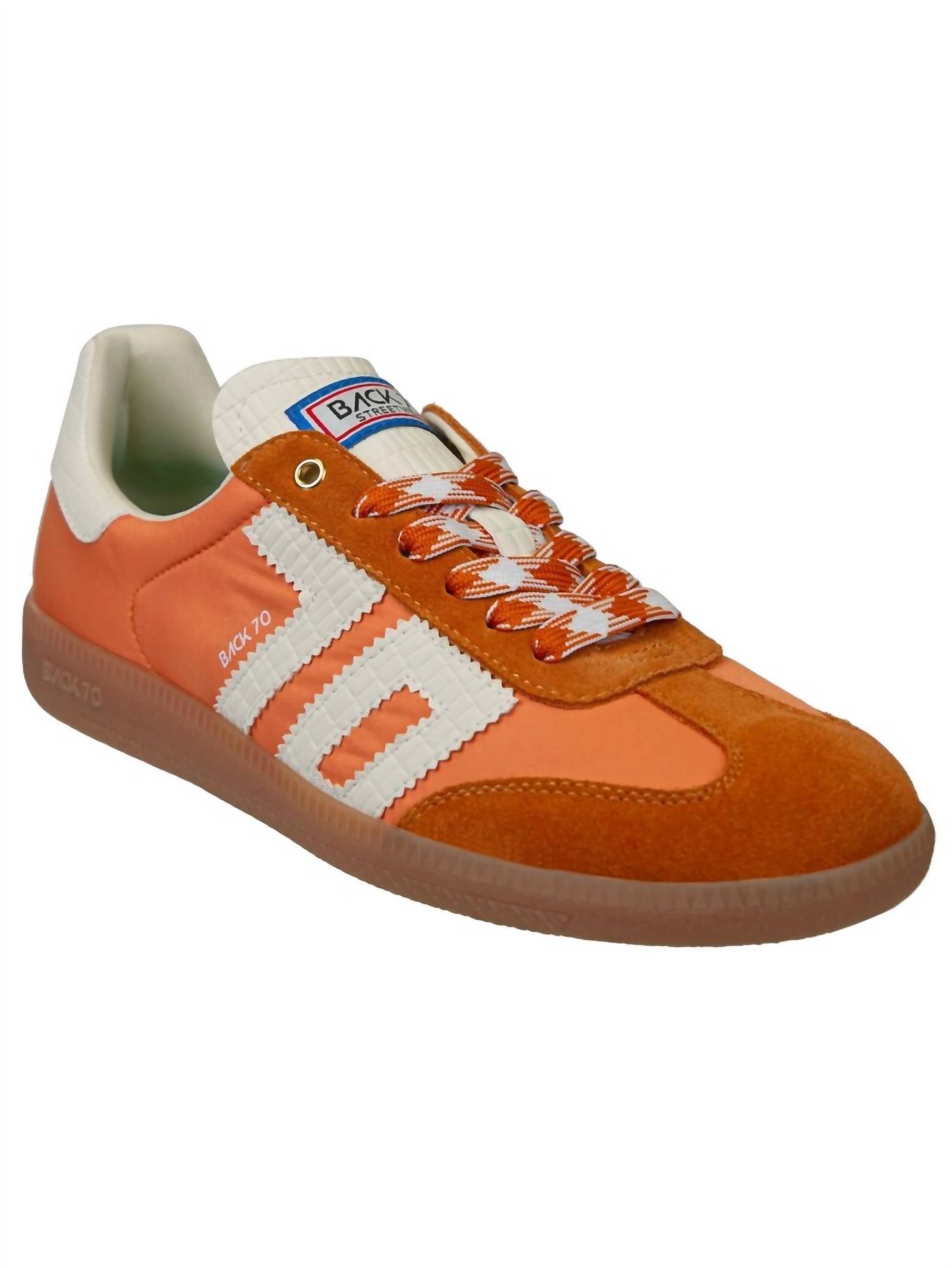 Elevate your style with the Women's Ghost Low Top Sneakers by Back 70, a perfect homage to Italian street style. These statement sneakers feature a low top design crafted from luxurious handpicked leather, suede, and fabric upper, complemented by stitched details. Offering comfort with a padded sock and a removable foam footbed, they sport an easy dual-color lace-up closure and a durable rubber outsole. With a chic 1" flat heel, these orange sneakers are ideal for travel and embody a luxe streetwear vibe, perfect for summer occasions.