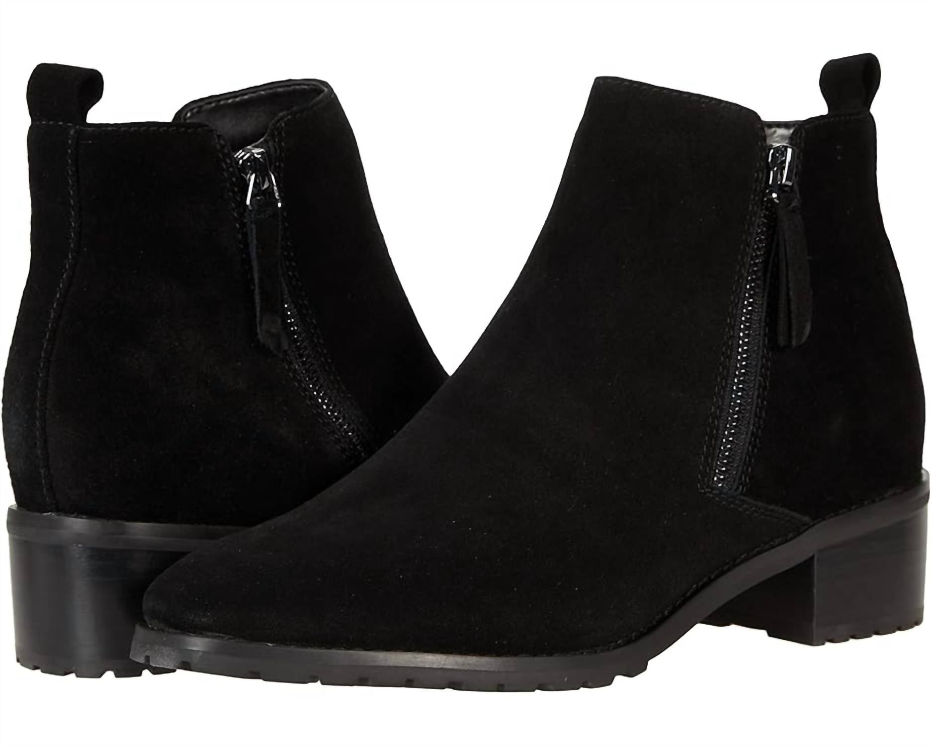 Step out in style with the Blondo® Women's Samara Waterproof Bootie, crafted in luxurious black suede for a sleek look. Featuring dual side zipper closures, these booties ensure a snug fit while the pull loop allows easy on/off. These ankle boots have a low block heel and AquaProtect® sealed seams to keep your feet dry and comfortable in all weather. With a heel height of 2 inches and a weight of 1 lb, they're imported and designed with a man-made upper, lining, insole, and outsole.