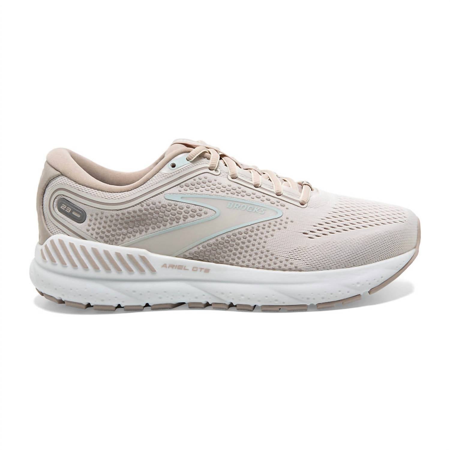 Introducing the Women's Ariel GTS 23 Running Shoes by BROOKS in Chateau Grey and White Sand, expertly crafted for enhanced performance. These athletic shoes are composed of a significant 58.3% recycled materials in the upper, offering sustainable style for the summer season. Designed with innovative GuideRails system for whole-body support, they feature soft, nitrogen-infused DNA LODT v3 cushioning for long-lasting comfort and protection. The 3D Print technology ensures a secure fit with a stable base, complemented by a flat, low heel and a round toe shape, making them ideal for fitness and workout sessions.