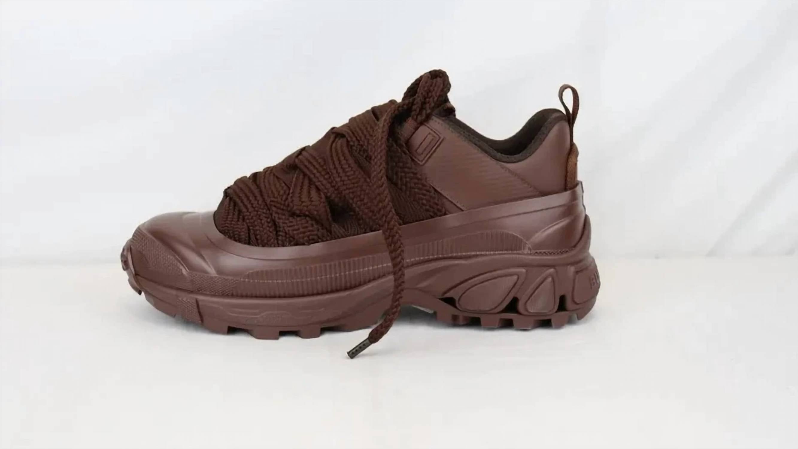 Elevate your footwear collection with the Men's Arthur Sneakers by Burberry, crafted from supple buffed calfskin leather in a rich deep earth brown. These stylish low-top sneakers feature a lace-up closure, ensuring a secure fit, while the grosgrain pull-loop at the padded tongue and collar adds a touch of distinction. Designed for comfort and durability, they boast mesh lining, a textured rubber midsole, and a treaded rubber outsole for superior traction. Ideal for the modern man seeking a blend of elegance and functionality.