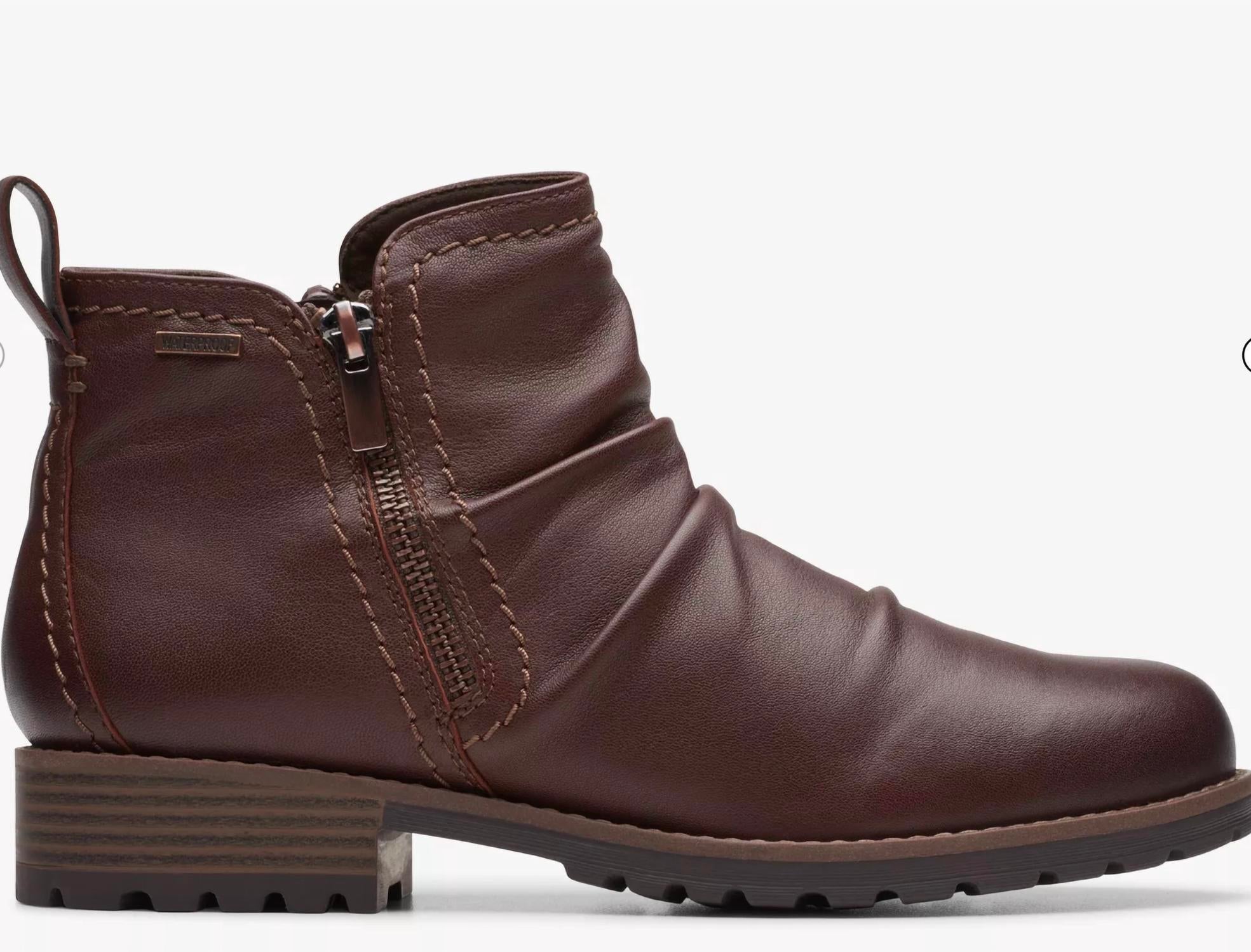 Step into winter with the Women's Aspra Waterproof Boot by Clarks, crafted from durable British tan leather. These ankle boots boast a zip-up closure and a grippy TPR rubber outsole, providing steady footing in frosty conditions. Designed with a 30mm (1.18 inches) heel height, they feature a cushioned PU foam footbed for comfort and an antimicrobial lining for freshness. Ideal for pairing with denim or dresses, they keep your steps stylish and supported.