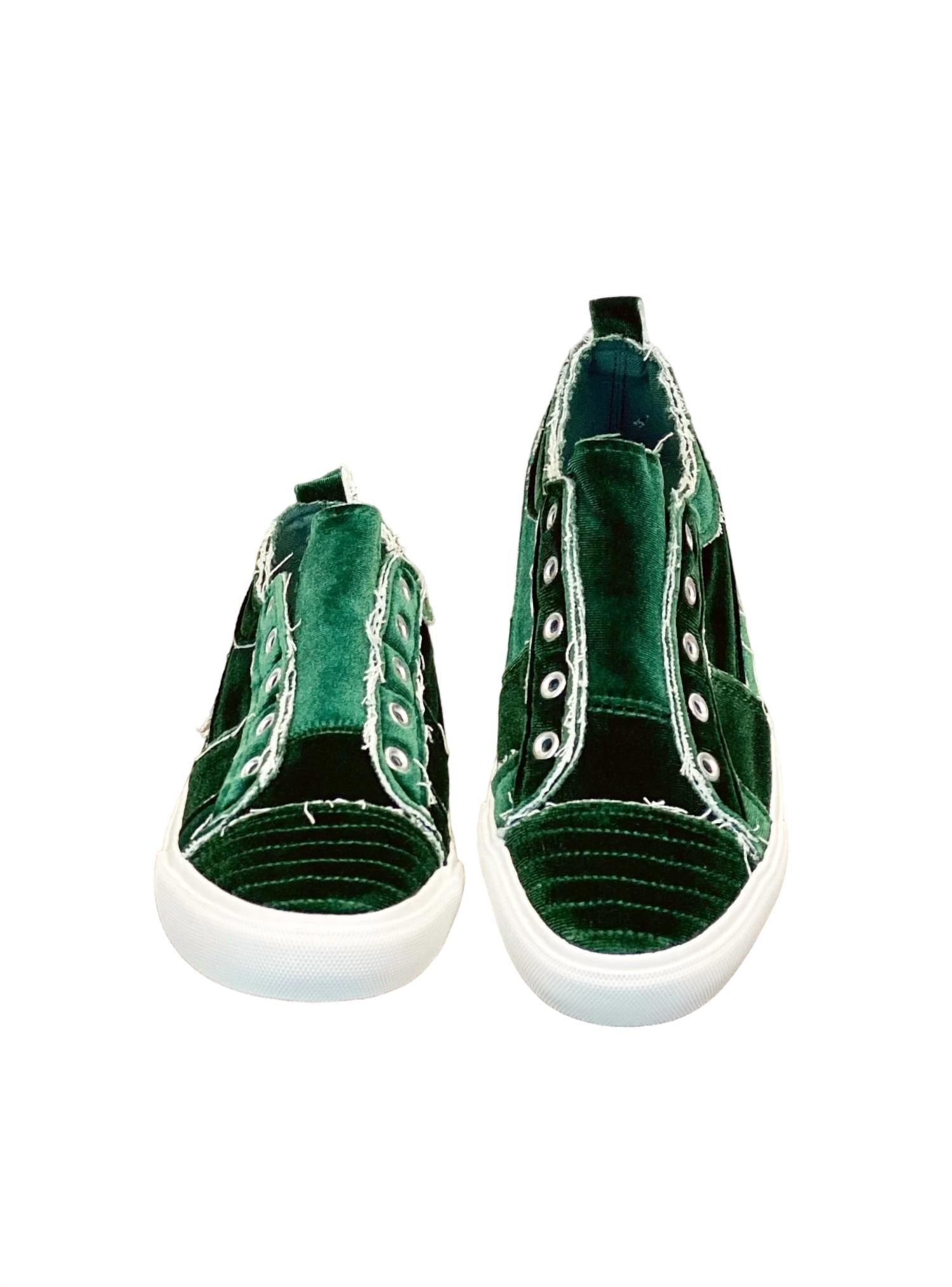 Textile upper. Green velvet. Memory insole. Slip on style. Double elastic core. Rubber outsole. 1 inch heel and platform height. Hot pink bottoms.
