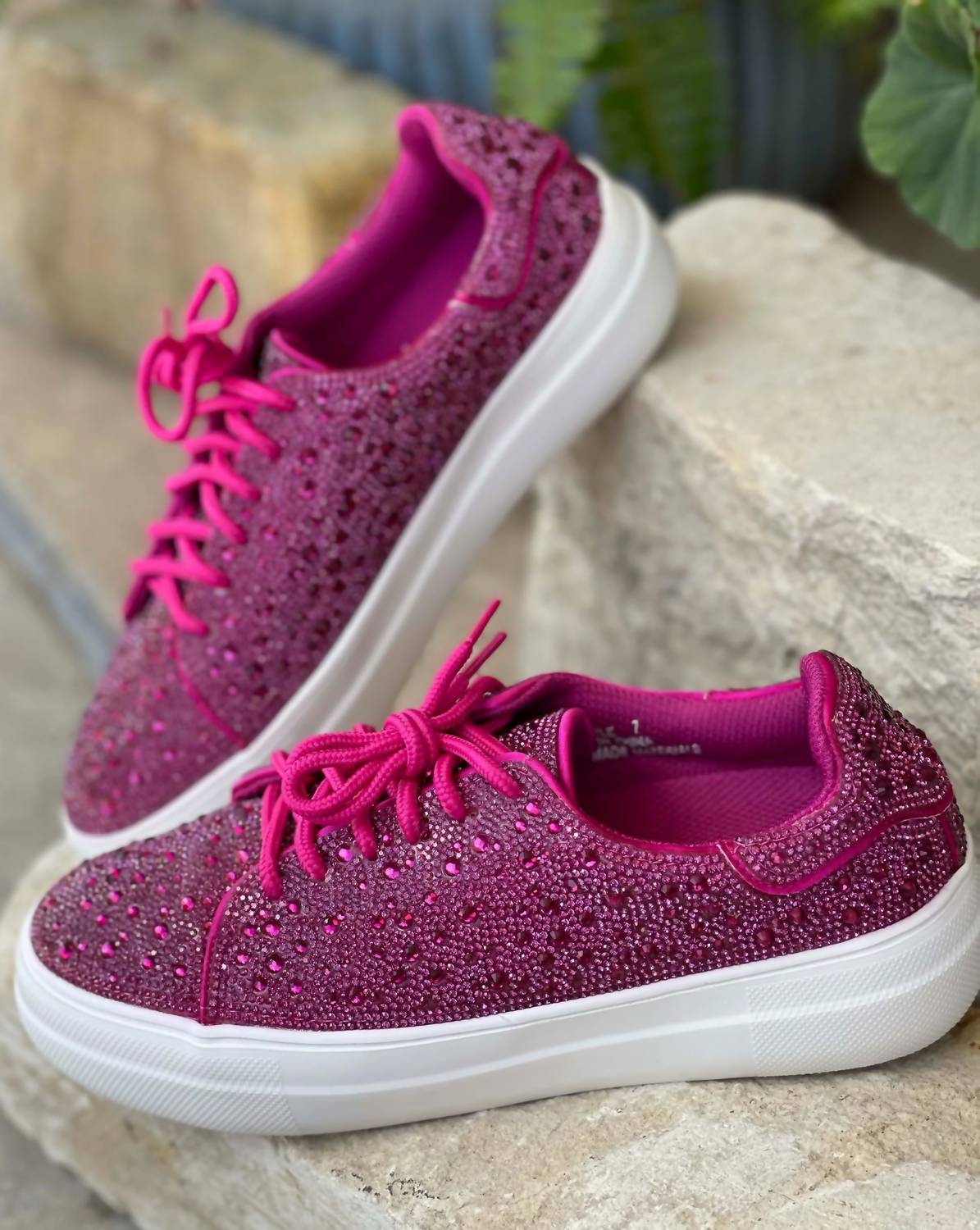 Step up your style game with the Bedazzle Rhinestones Sneakers by Corkys Footwear, ideal for adding sparkle to your casual ensemble. These stunning sneakers showcase a rhinestone-embellished leather upper, accentuated by a 1.5" white rubber outsole and a lace-up design ensuring a secure fit. Designed in fuchsia, they offer a medium width with a round toe and feature an incredibly comfortable cushioned insole, perfect for all-day wear. Originating from a delightful Y2K trend, they are perfect for a holiday party or Valentine's Day celebration.