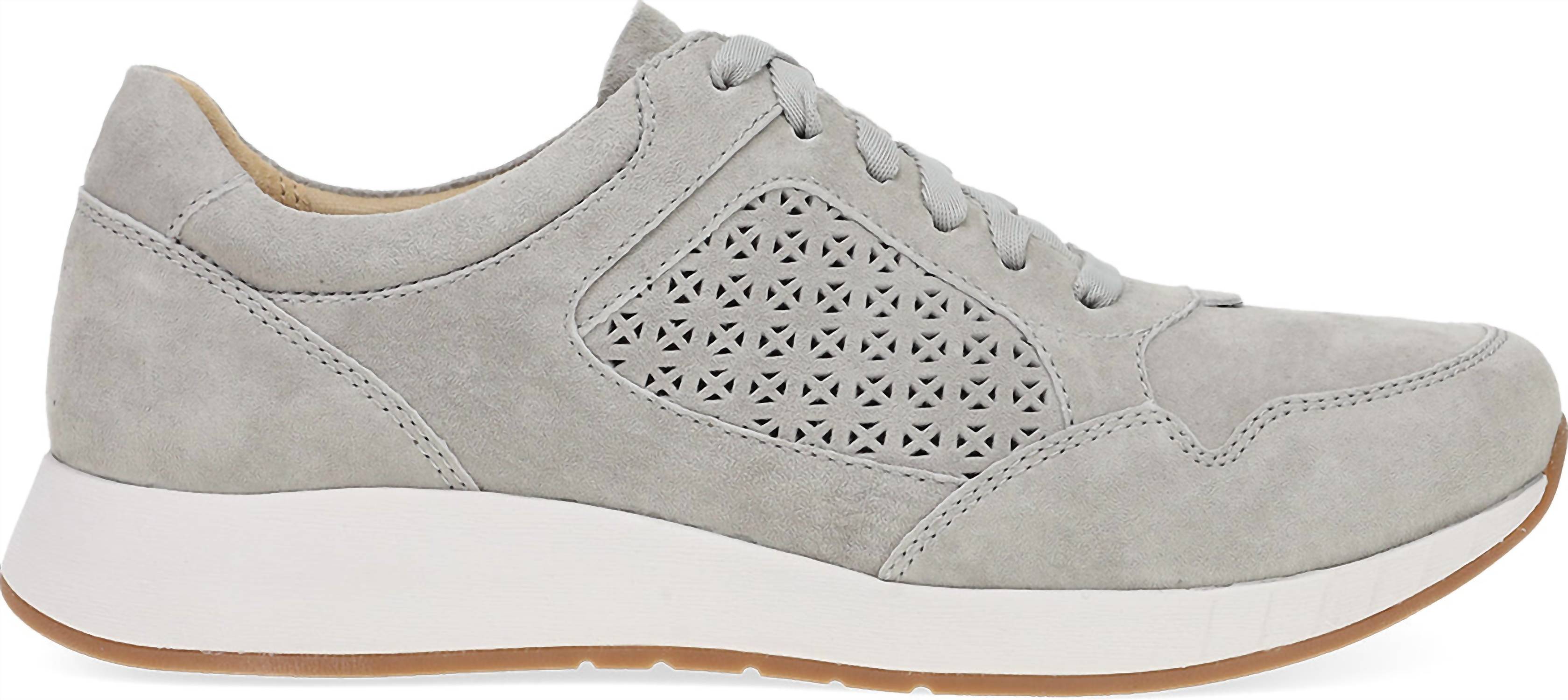 Discover the Women's Catie Sneaker by Dansko in versatile grey, crafted for everyday style and comfort. With a soft, high-quality leather upper treated for stain resistance, this sneaker provides a durable and easy-care option. The lightweight EVA midsole features Dansko Natural Arch® technology to support each step, complemented by a nylon shank and rubber outsole for stability and long-lasting wear. Ideal for spring, it accommodates most standard and custom orthotics, offering a flat heel design tailored for medium width.