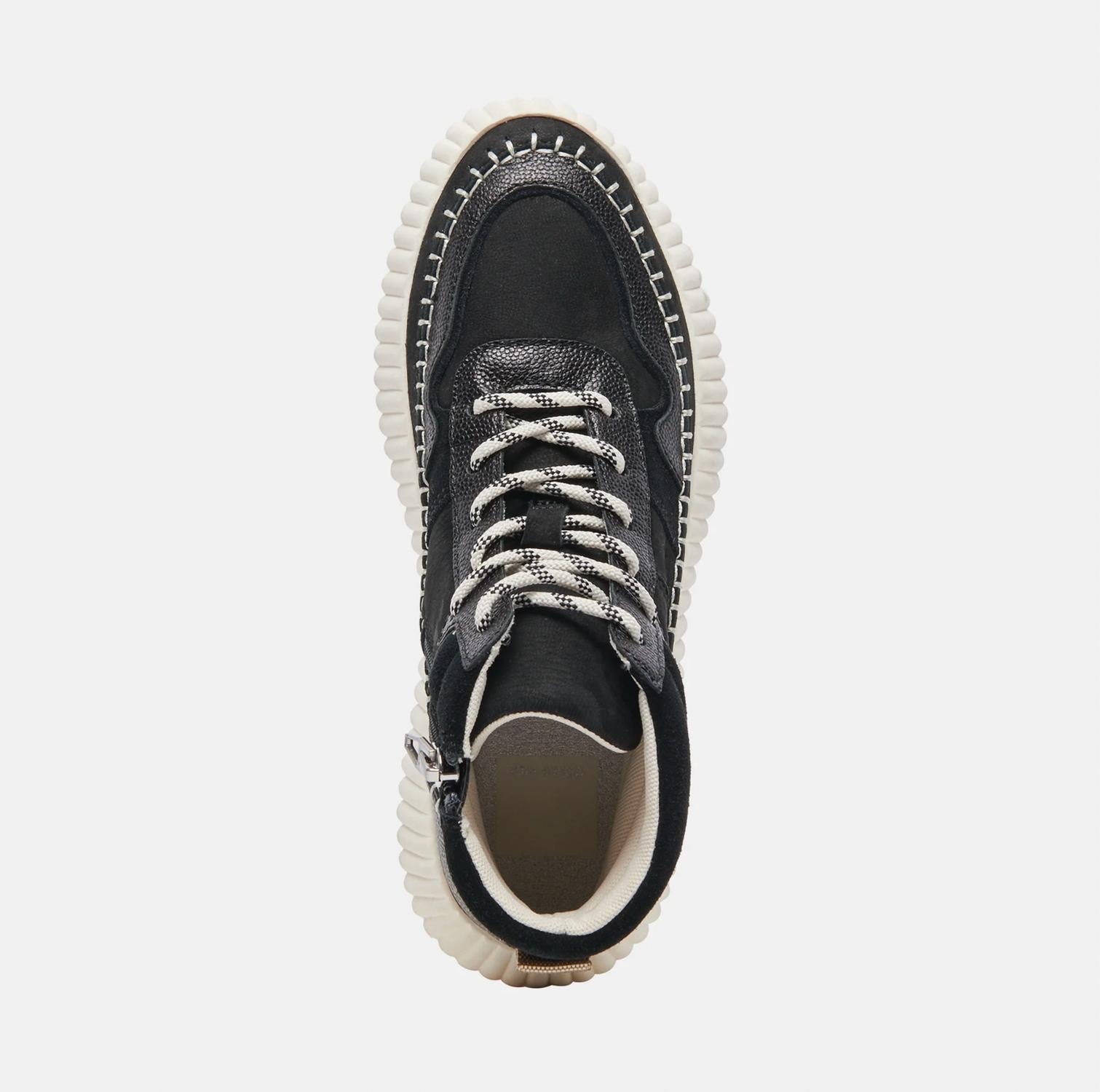 These high-top sneakers feature a platform rubber sole with a leather upper, rubber outsole, mesh lining, and a synthetic sock. The shaft height is 1", with a 10" leg circumference and a 1.6" platform height. Imported.