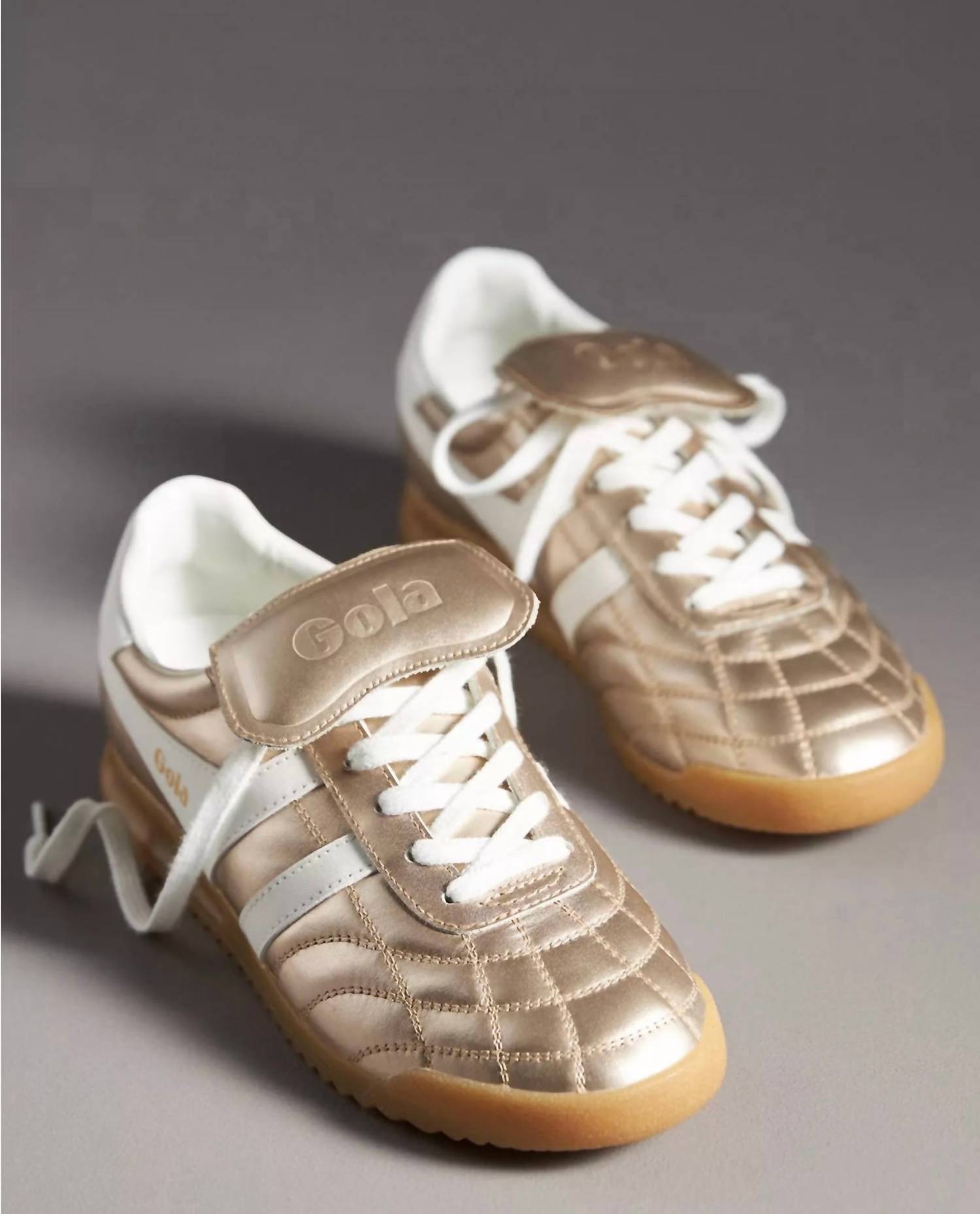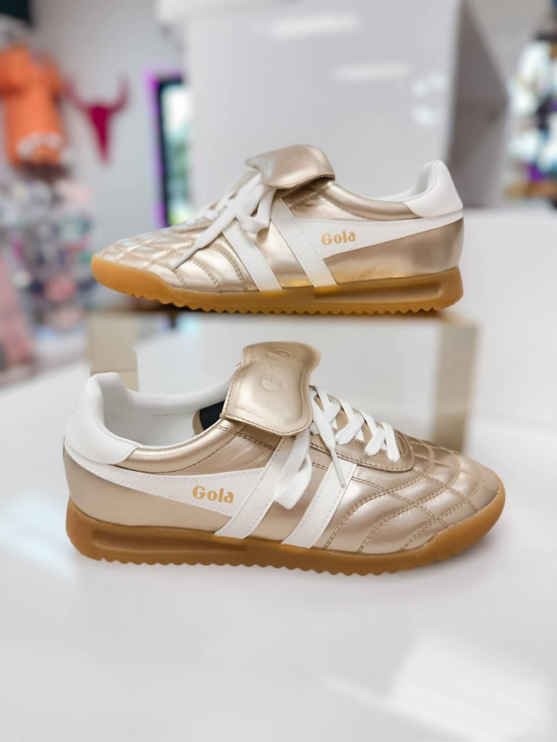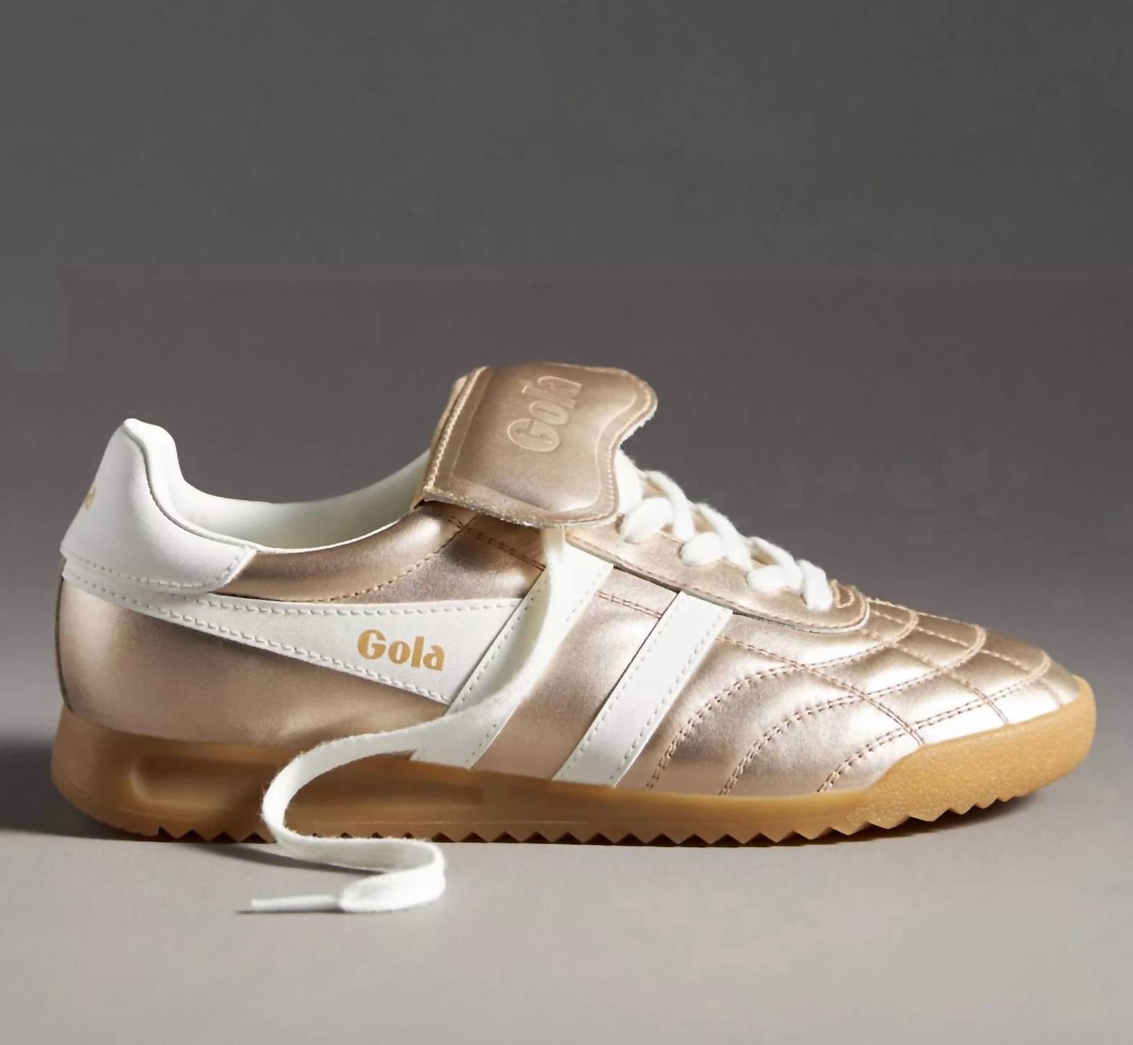 Step into classic elegance with Gola's Women's Stadium '86 Sneakers, crafted in luxurious gold leather. These stylish sneakers feature a unique fold-over tongue, a comfortable microfiber insole, and a durable rubber sole. Designed with tie styling, they reflect the brand's British heritage and timeless craftsmanship. Perfectly suited for game day or casual summer outings, these imported sneakers are a nod to vintage athletic aesthetics.