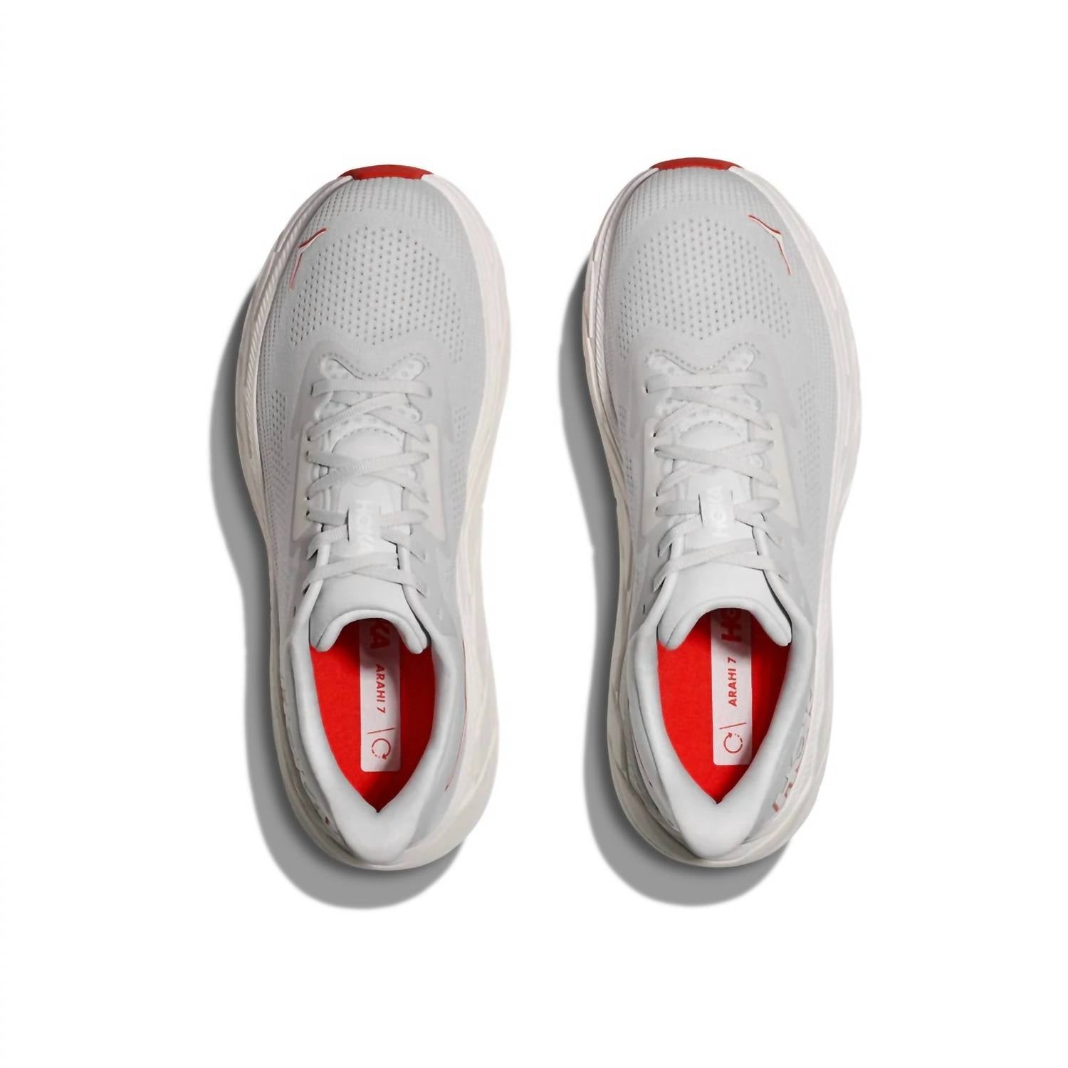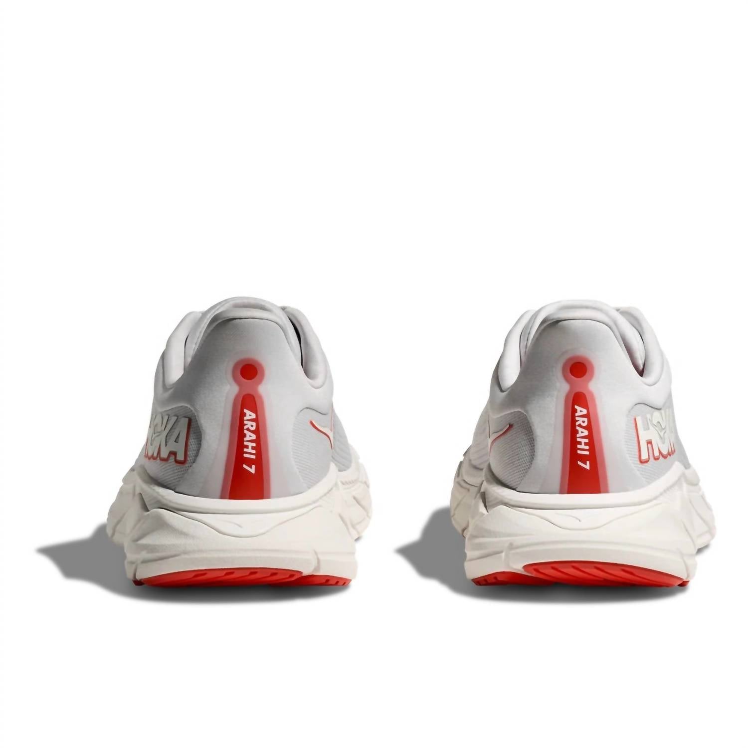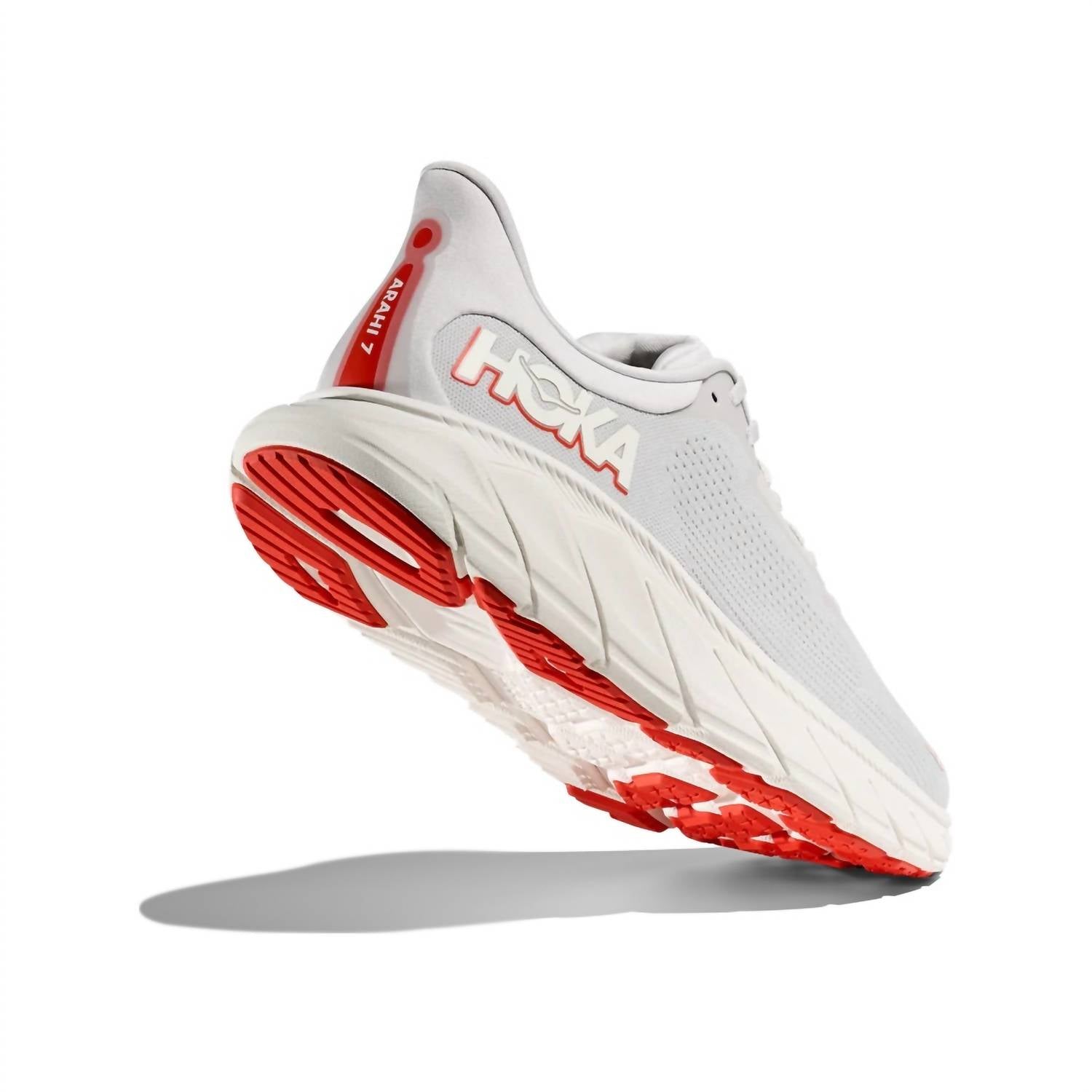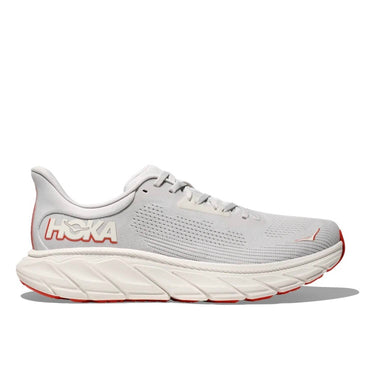 The Men's Arahi 7 Running Shoes by Hoka in Grey/Red transform the concept of stability footwear with cutting-edge J-Frame™ technology for control and support. Designed with a flat-knit upper, these shoes ensure a secure, snug fit while a plush tongue and dual gusset system enhance comfort by keeping the tongue in place. Cushion: Medium, with a 5mm heel-to-toe drop (34mm heel/29mm forefoot), and weighing 9.9 oz, these shoes provide lightweight comfort suitable for fitness and workout activities. The compression-molded EVA midsole and Durabrasion rubber outsole deliver durability and grip, making them a perfect choice for athleisure trends.