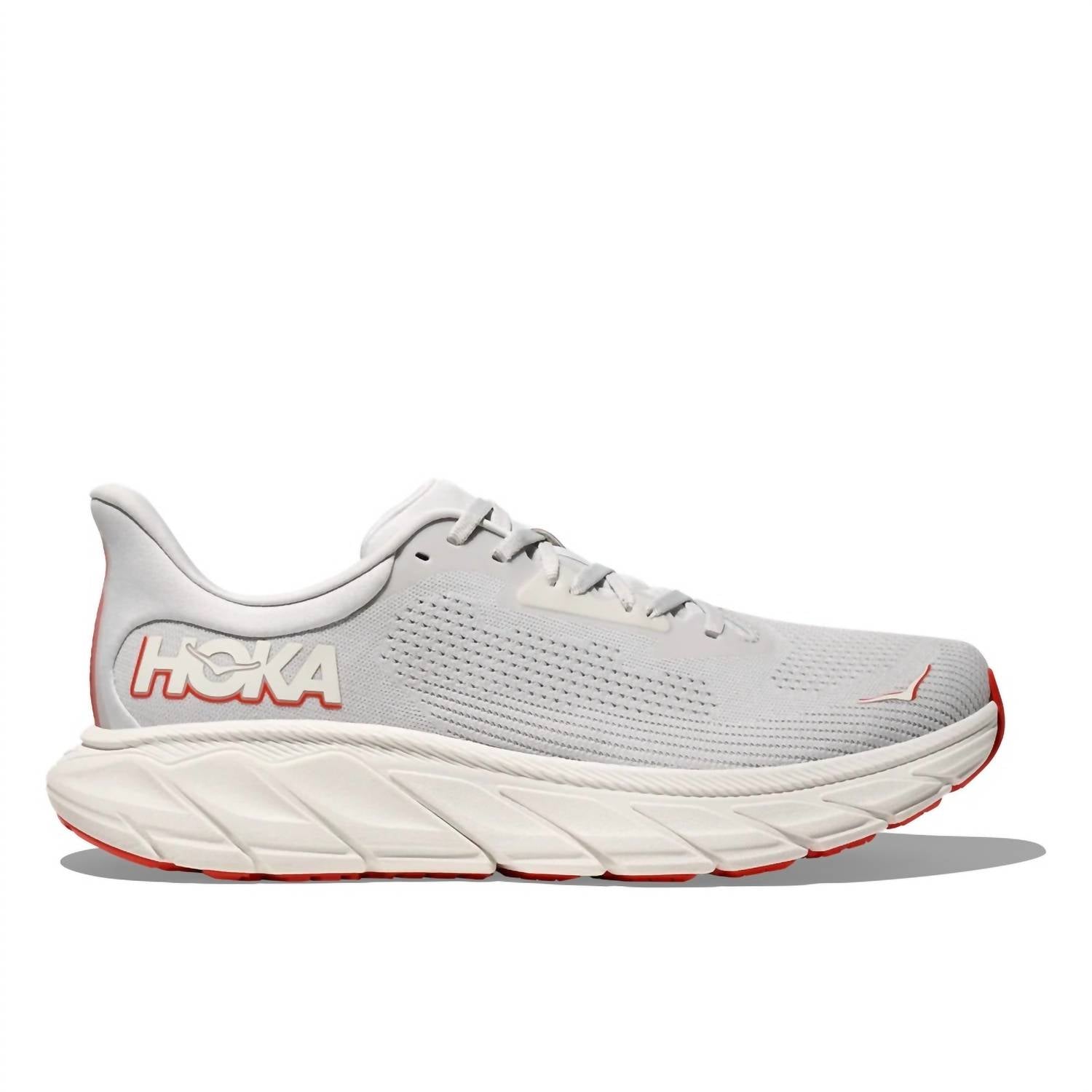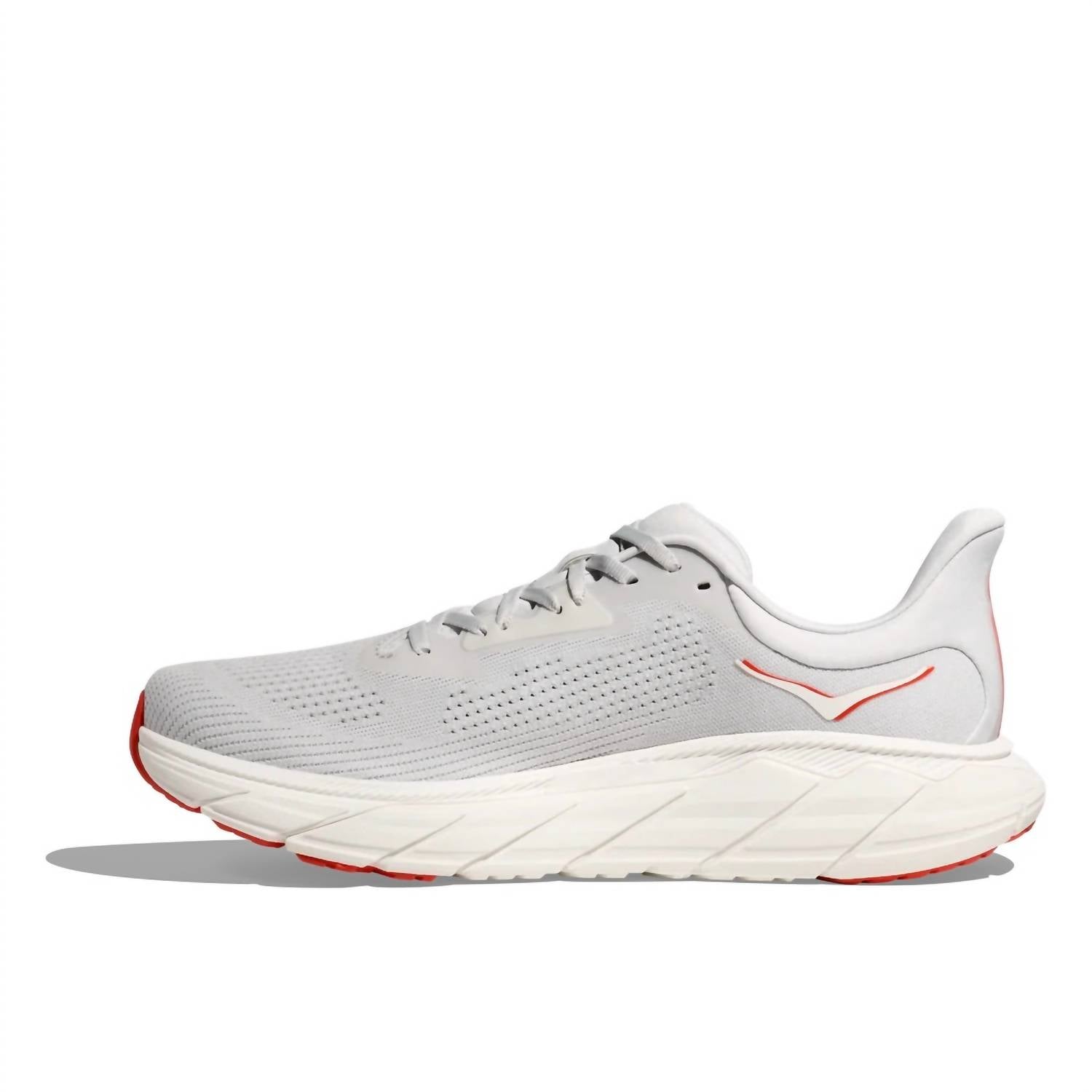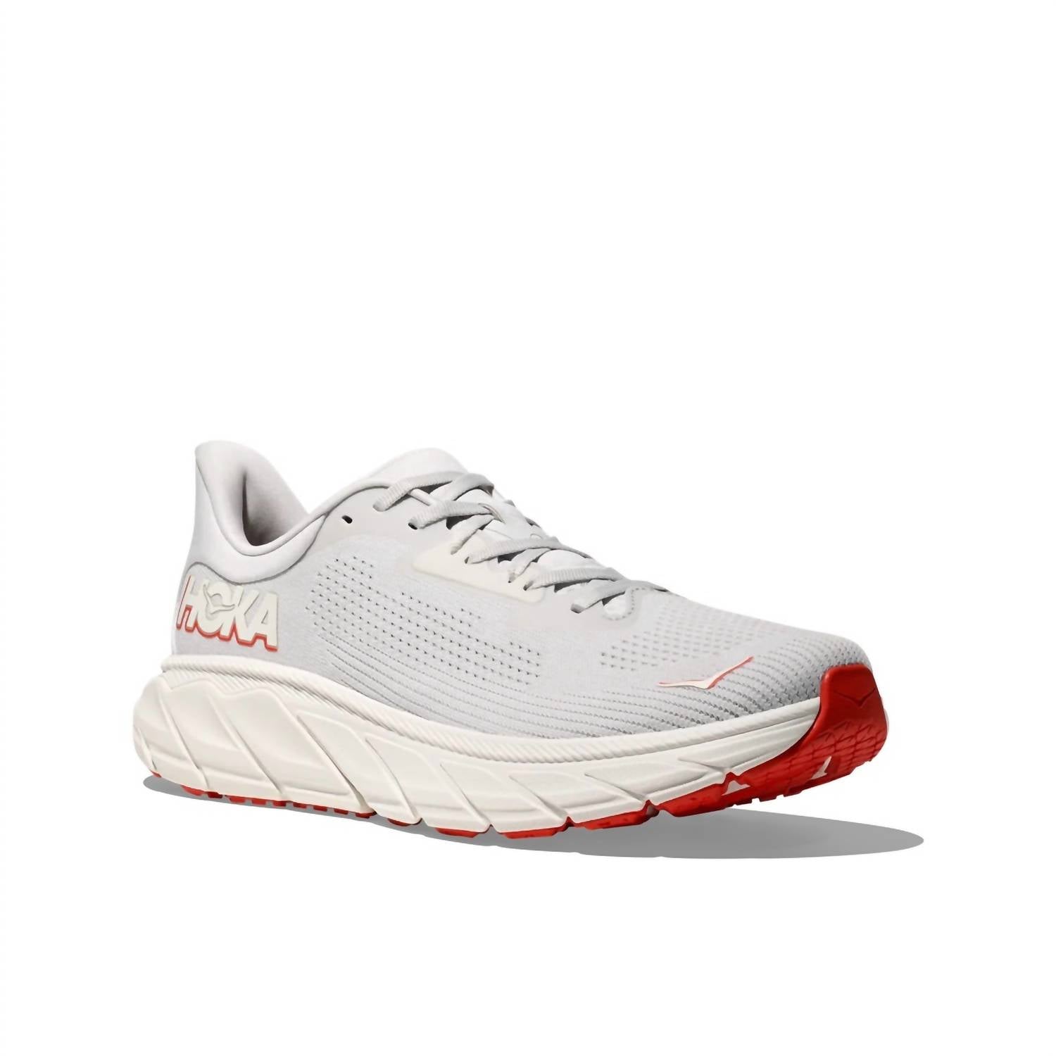 The Men's Arahi 7 Running Shoes by Hoka in Grey/Red transform the concept of stability footwear with cutting-edge J-Frame™ technology for control and support. Designed with a flat-knit upper, these shoes ensure a secure, snug fit while a plush tongue and dual gusset system enhance comfort by keeping the tongue in place. Cushion: Medium, with a 5mm heel-to-toe drop (34mm heel/29mm forefoot), and weighing 9.9 oz, these shoes provide lightweight comfort suitable for fitness and workout activities. The compression-molded EVA midsole and Durabrasion rubber outsole deliver durability and grip, making them a perfect choice for athleisure trends.