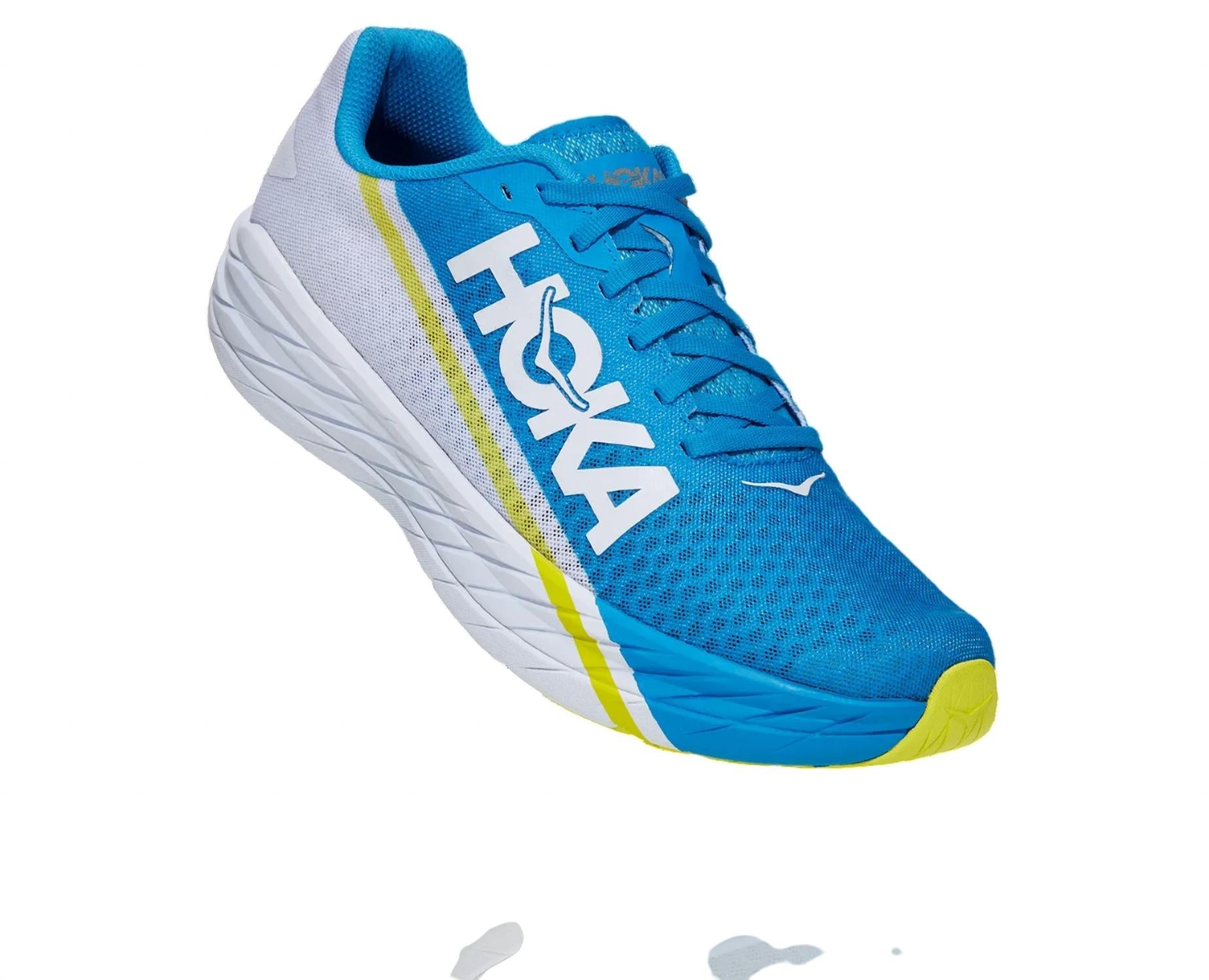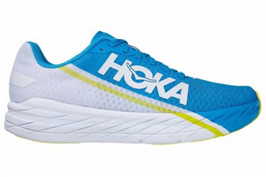 Elevate your running experience with the HOKA Men's Rocket X in 'White Diva Blue', designed for both speed and endurance. This athletic shoe features a lightweight construction and a round toe, complemented by a carbon fiber plate and an aggressive Meta-Rocker design for smooth transitions and superior cushioning. Suitable for summer athleisure and fitness workouts, this versatile shoe marries style and function effortlessly. Ideal for the active adult, the HOKA Rocket X is your go-to for performance and comfort.