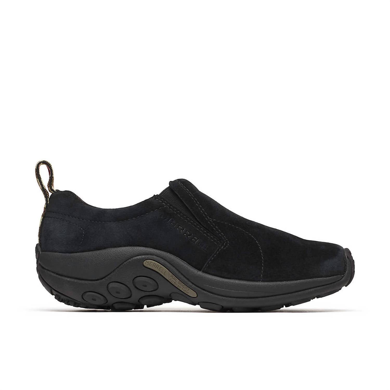 Step into comfort crafted in Black suede for long-lasting quality. Slip-on shoe features a double stretch gore for easy wear and removal, complemented by a lightweight EVA foam midsole for stability and comfort. Equipped with a Merrell Air Cushion in the heel and M Select Grip sticky rubber outsole. Offers personalized support alongside durable traction. Recycled footbed and NXT lined footbed cover keep your feet fresh and support sustainable choices.