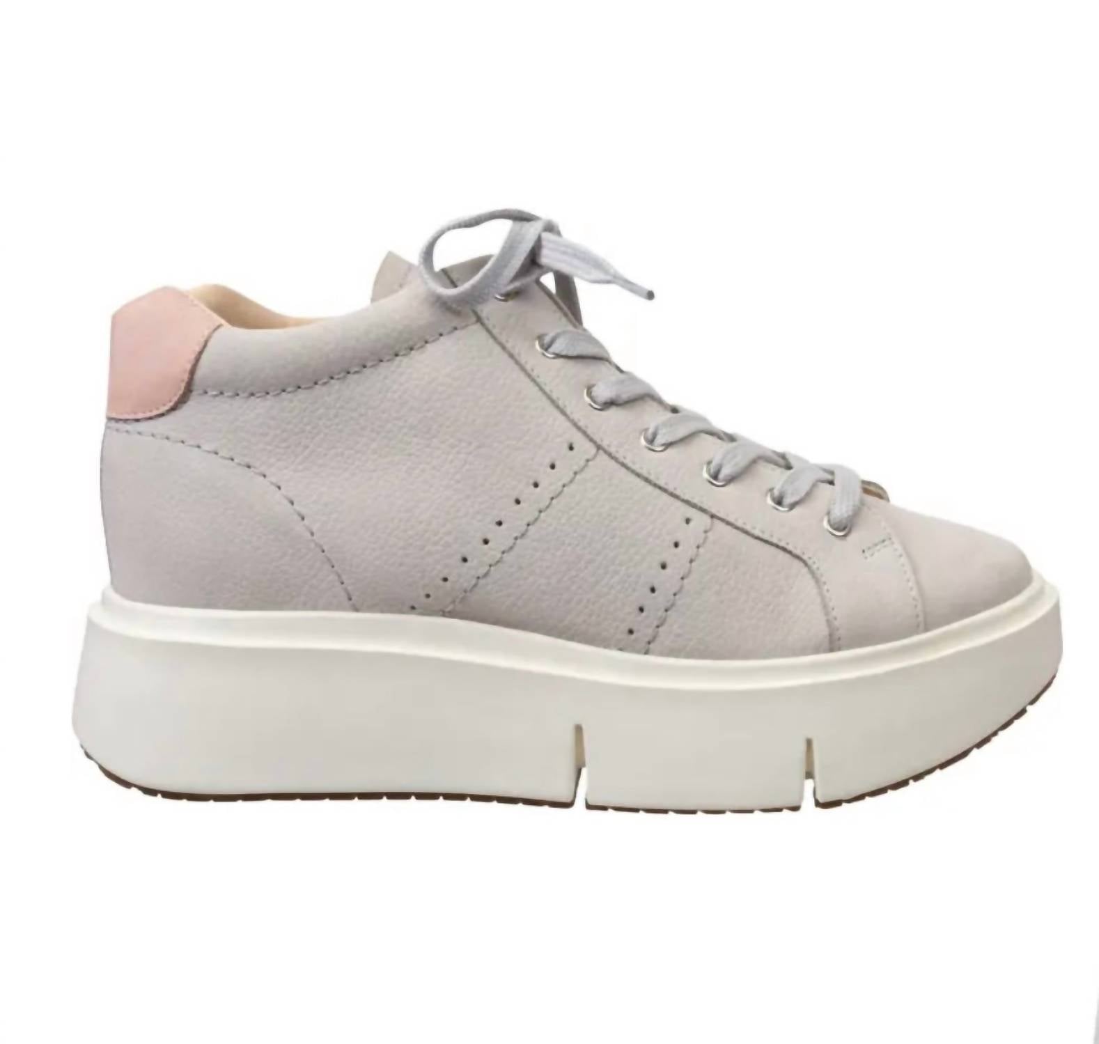 Step up your weekend style with the Women's Essex High-top Sneakers by Naked Feet, crafted in a sophisticated Mist color. These sneakers feature a leather upper, textile lining, and rubber sole, complemented by a removable, cushioned insole with arch support for enhanced comfort. The 1 3/4" heel combined with a chunky platform evokes a nostalgic flair, ideal for contemporary women on the go. With a round toe design, it's the perfect blend of artisanal craftsmanship and modern sophistication.
