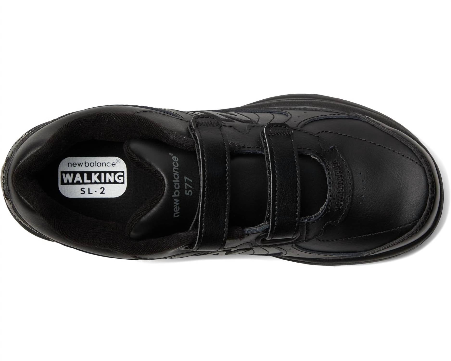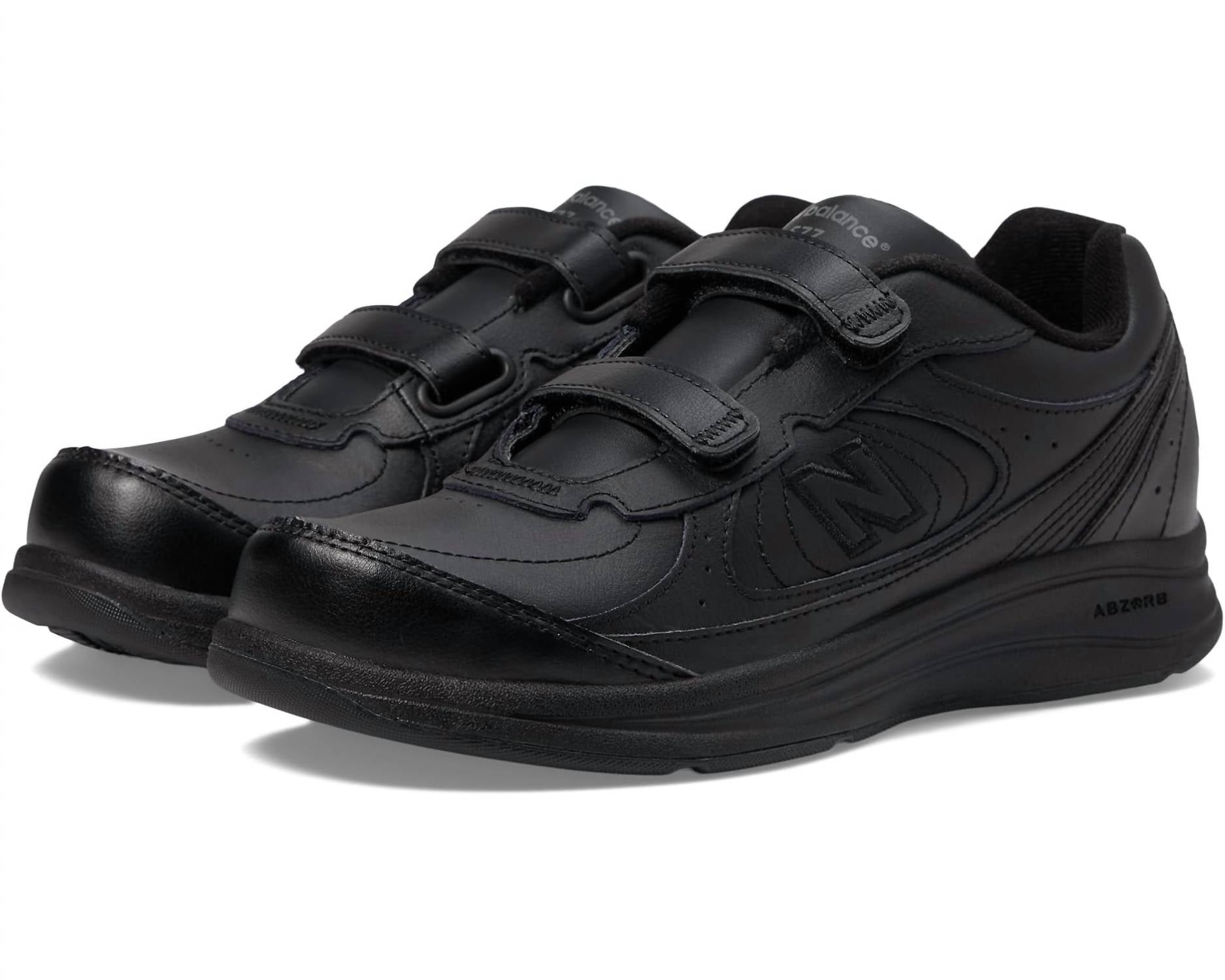 Discover a new level of walking comfort with the New Balance Women's WW577 Hook and Loop sneakers in classic black. These sneakers, designed for the moderate-paced fitness walker, feature a durable leather upper and a padded collar and tongue for extra comfort. They boast dual hook-and-loop adjustable straps for a secure fit and ABZORB® cushioning in the heel for exceptional shock absorption. The Walking Strike Path® stabilizes your foot through the natural gait cycle, and the solid rubber outsole ensures long-lasting durability. With options available in narrow and wide sizes, these imported shoes weigh 12 oz and feature a low flat heel perfect for fall travels.