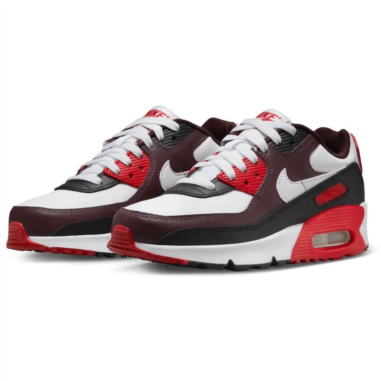 Get your young ones ready for stylish adventures with the Nike Kids Air Max 90 Sneakers in Burgundy Crush, perfect for big kids with a taste for streetwear. Featuring a classic '90s design with updates for modern comfort, these sneakers are crafted from high-quality leather. Equipped with visible Max Air cushioning for superior comfort and a padded, low-cut collar, these shoes also include a rubber waffle outsole for durable traction. Perfect for summer travels or a casual Fourth of July outing, these sneakers come with classic variable width lacing for a secure fit.