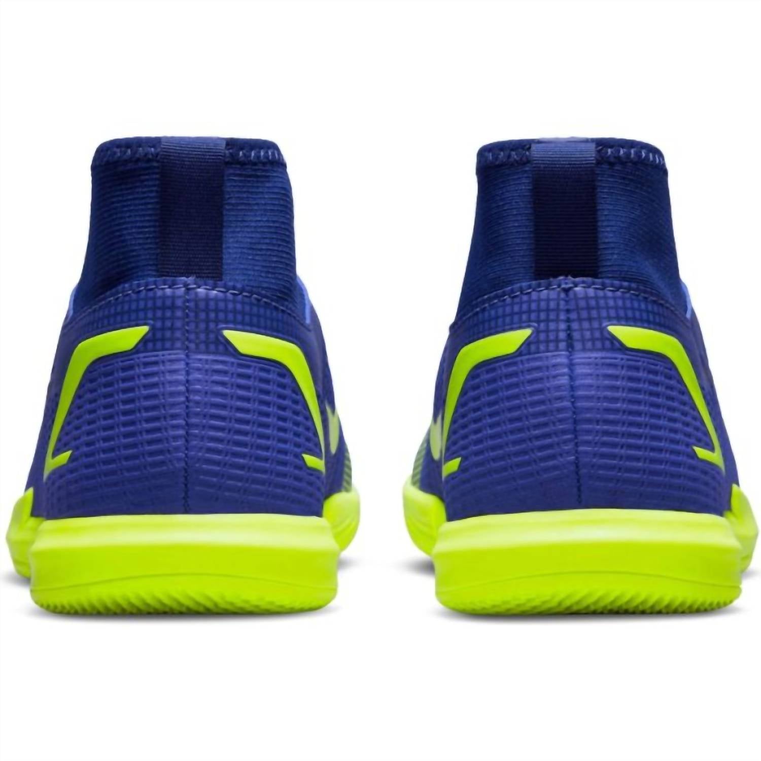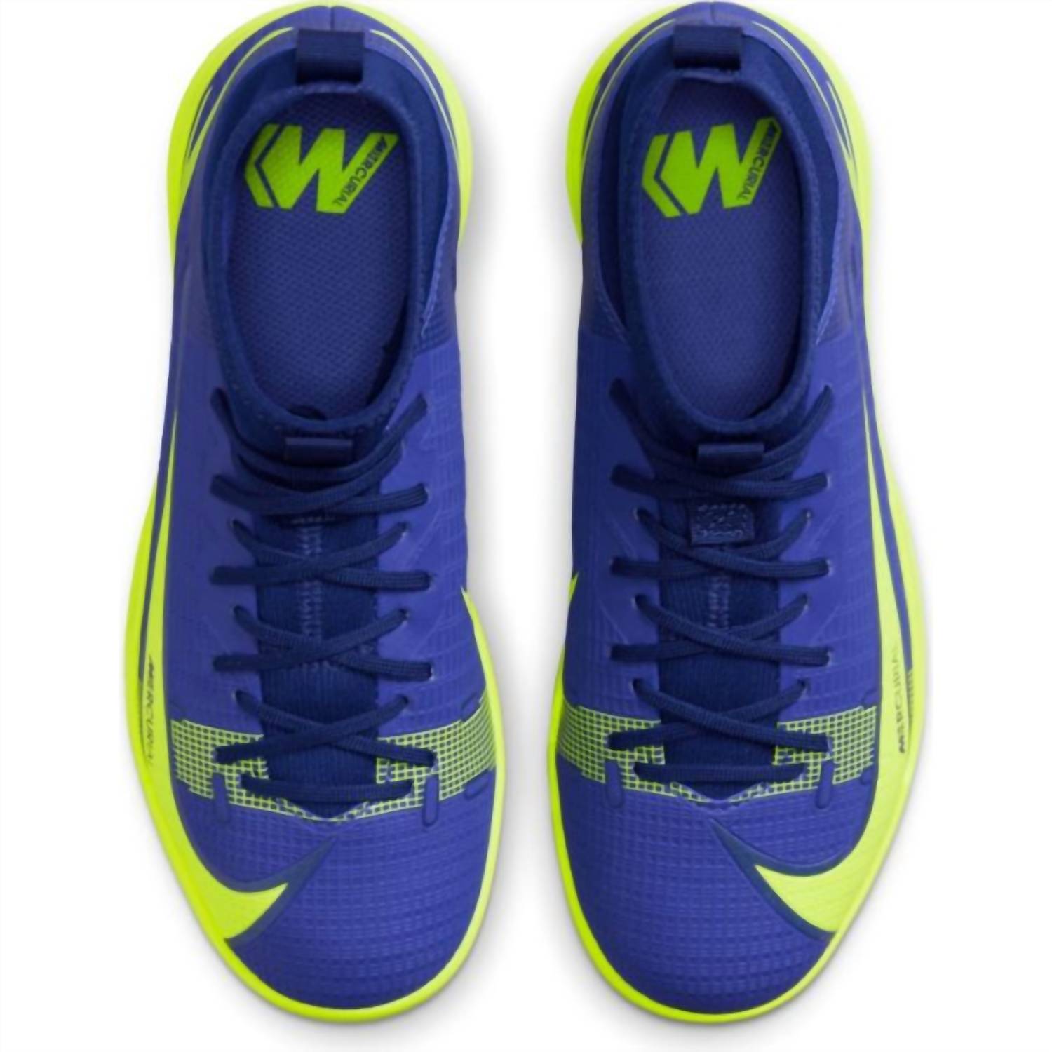 Introducing the Kid's Nike Jr. Mercurial Superfly 8 Academy Shoes in vibrant lapis, designed for toddlers who love to move. These sneakers feature a round toe shape and a grippy texture on the molded upper, enhancing ball control during play. The stretchy collar offers a seamless fit, wrapping the ankle in soft fabric for added support and comfort. With a rubber outsole crafted for multidirectional traction, these shoes are ideal for quick cuts and sudden stops on the playground.