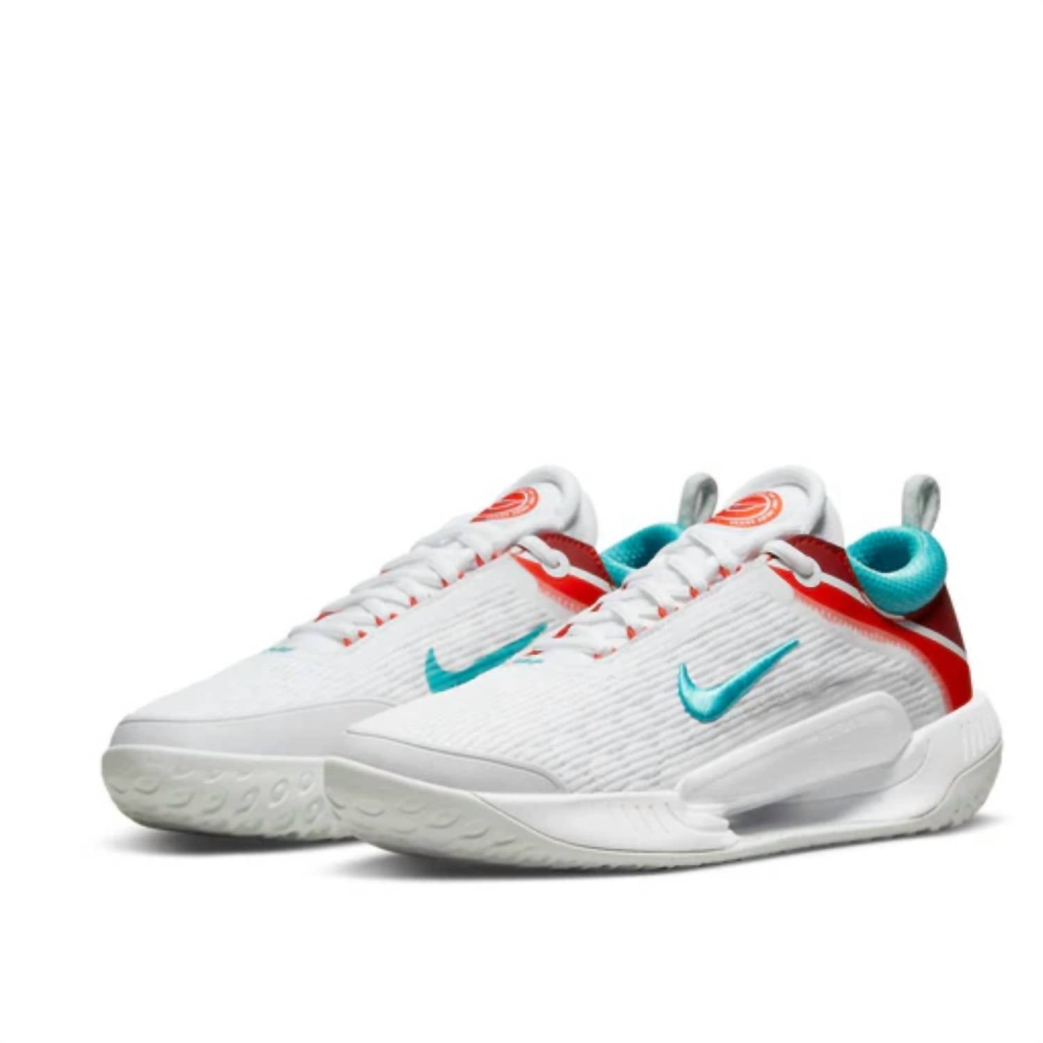 Step up your game with the Men's Zoom Court Nxt Hard Court Tennis Shoes by Nike, crafted for modern athletes. The main white tone is accentuated with Habanero red and washed teal details, offering a dynamic and eye-catching design. Made from mesh fabric and synthetic materials, these shoes ensure enhanced durability and breathability to keep your feet dry and comfortable. The sole features Zoom Air technology and a rubber outsole for superior shock absorption and excellent grip, perfect for quick and powerful movements on the court.