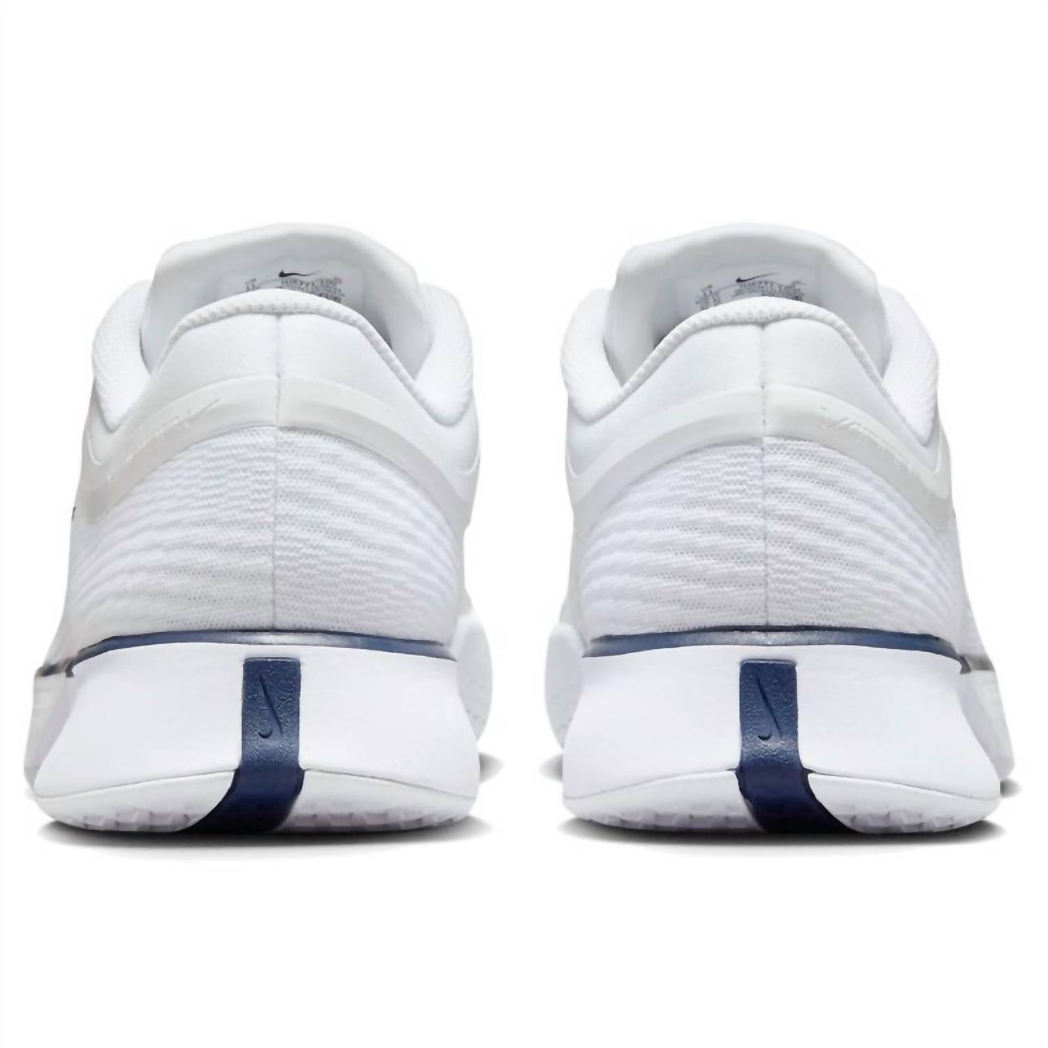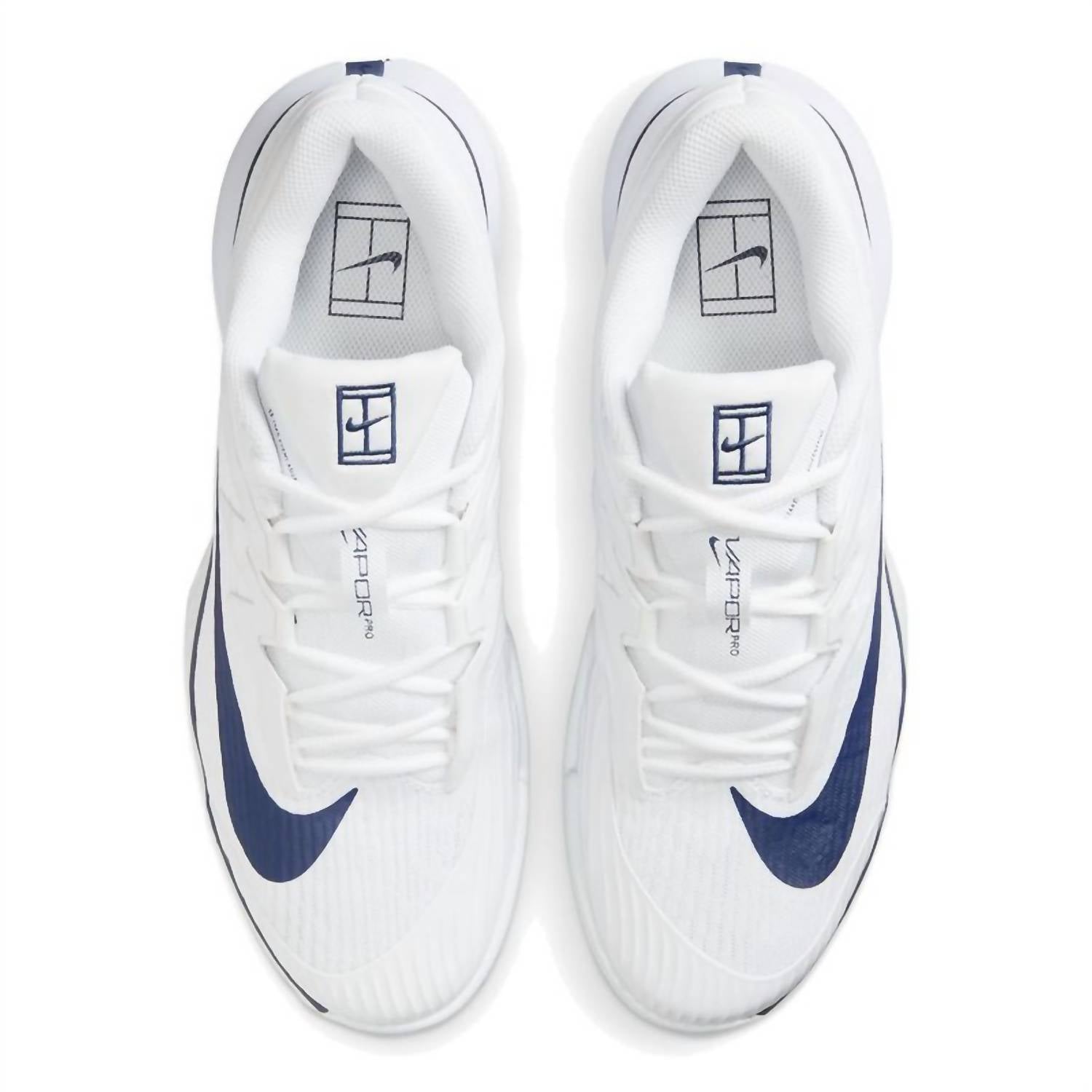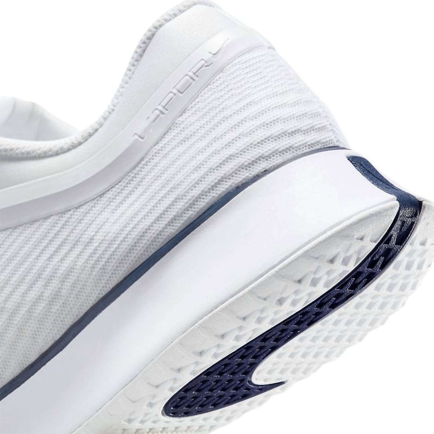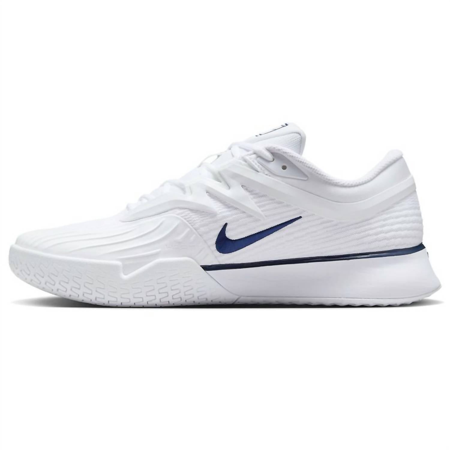 Introducing the Men's Zoom Vapor Pro 3 Premium Hard Court Tennis Shoes by NIKE, a masterpiece in performance and style. Crafted for speed and precision, this design features a new Hex Forefoot Zoom Air unit and reinforced lateral TPU support for responsive propulsion. The secure midfoot fit band and enhanced eyestay system ensure your foot remains locked in during aggressive cuts. Made with luxe materials and a breathable yet durable mesh upper, these shoes in White/Midnight Navy offer lightweight control and comfort for the adult male athlete.