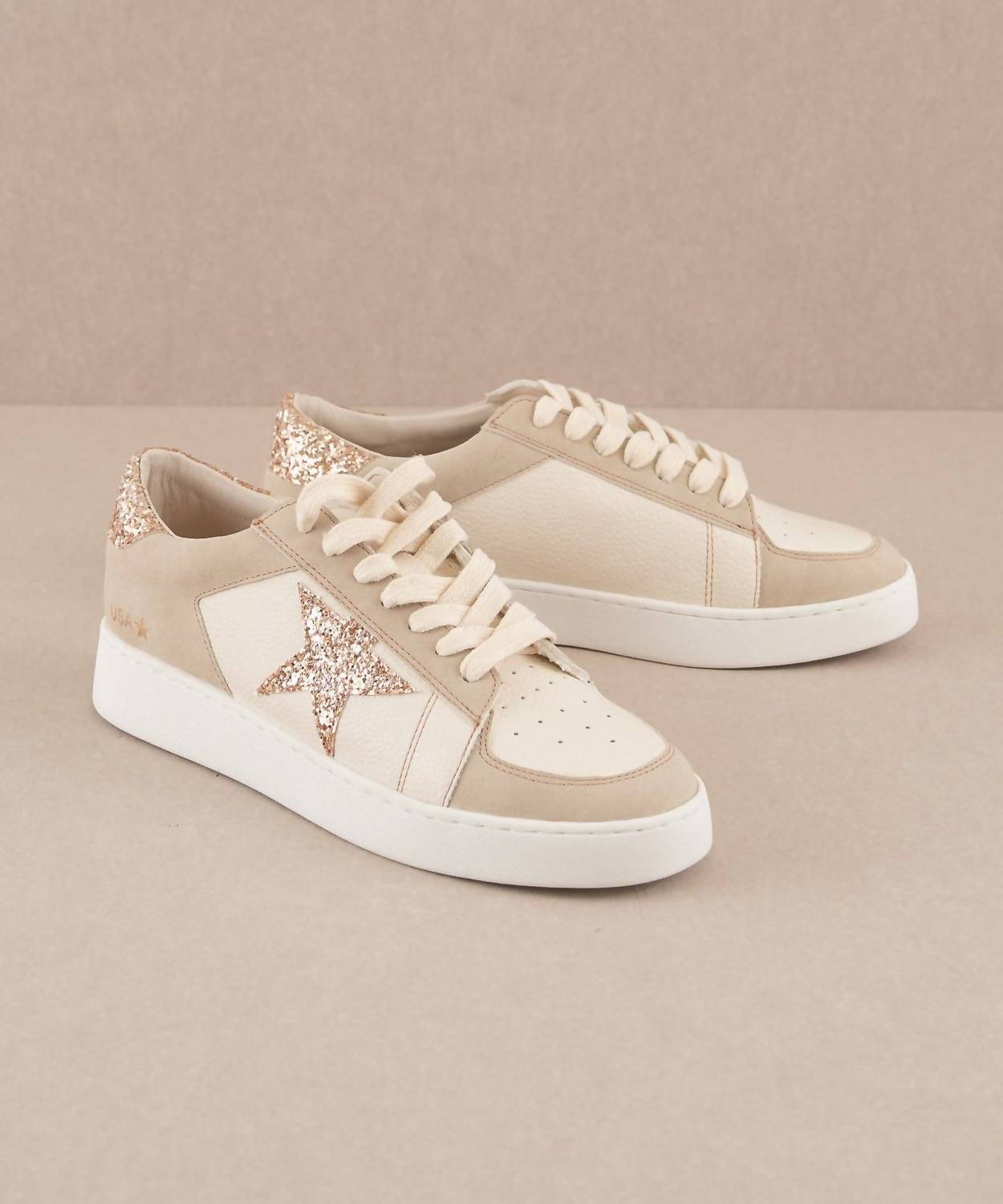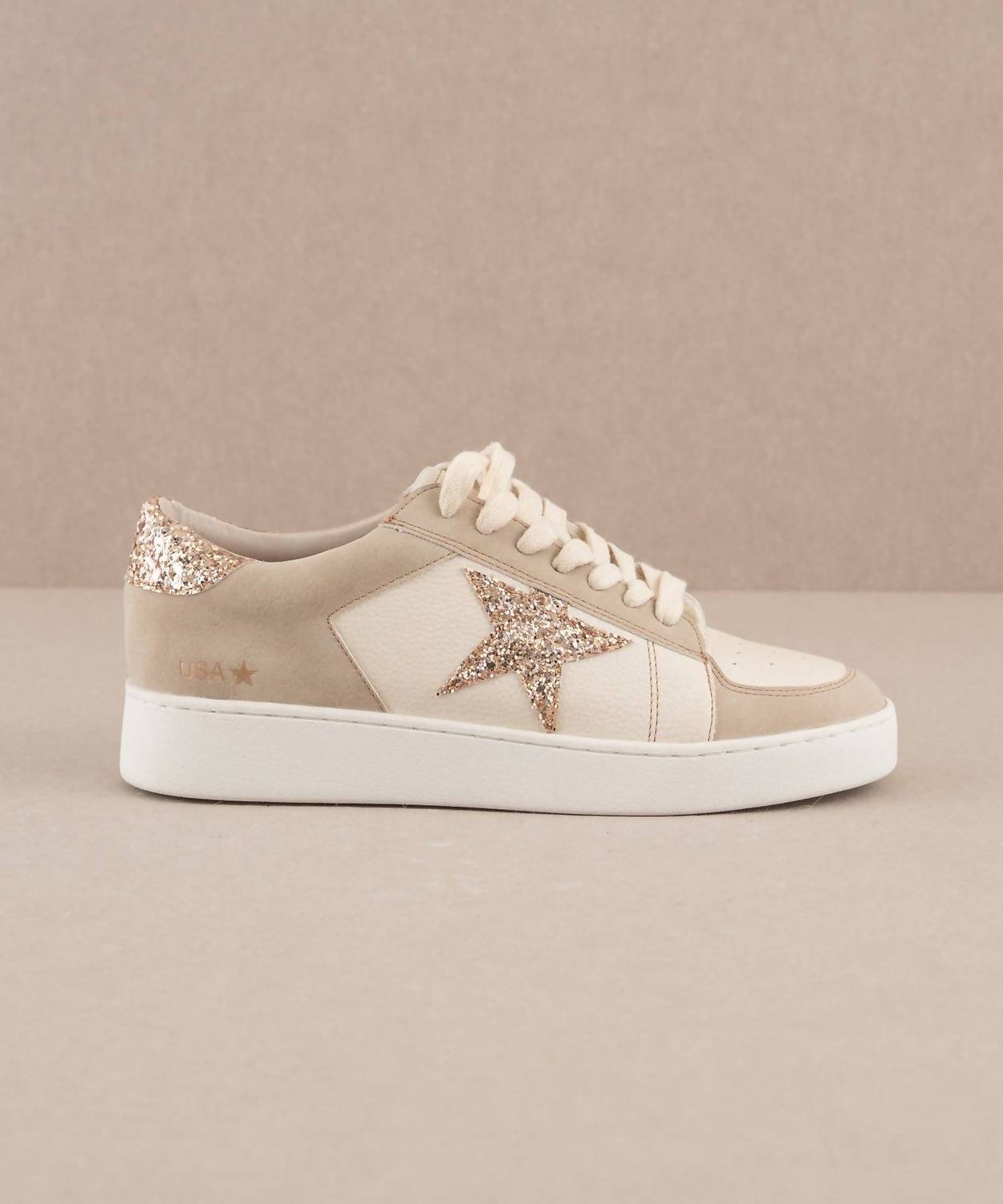 Step out in style. Shaft height of 3 inches and a low 1.25-inch platform heel, these sneakers combine comfort and flair effortlessly. Crafted from vegan leather with a latex insole and rubber outsole. Ensure durability and comfort. Designed with a lace-up closure and a 11.5-inch shoe opening circumference. Perfect for adding a touch of glamour with their glittery star detail.