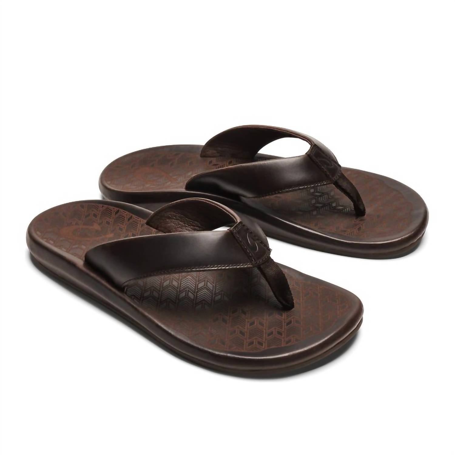 Discover the Men's Ilikai Premium Leather Sandals by OluKai, crafted in a sophisticated Dark Wood shade. These sandals are made from buttery soft full-grain leather, featuring a round toe and flat heel for all-day comfort and support. Enhanced with kapa-inspired chevron artwork on the footbed, this sandal offers superior traction with a non-marking Wet Grip Rubber outsole. Ideal for summer vacations and 90s fashion trends, these sandals are designed for a relaxed yet refined look.